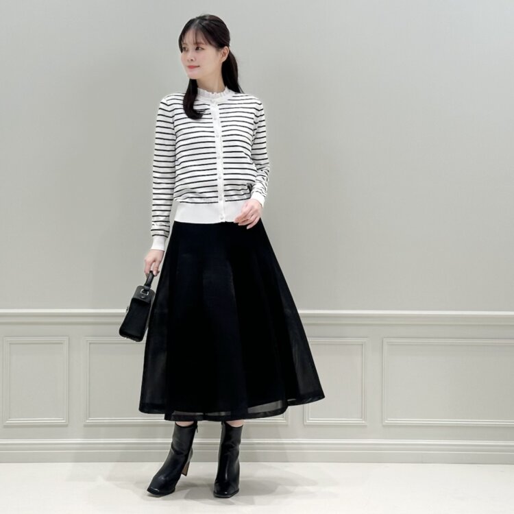 モノトーンスタイルでも、スカートの柄感が、どこか華やかな印象に仕上げてくれます。