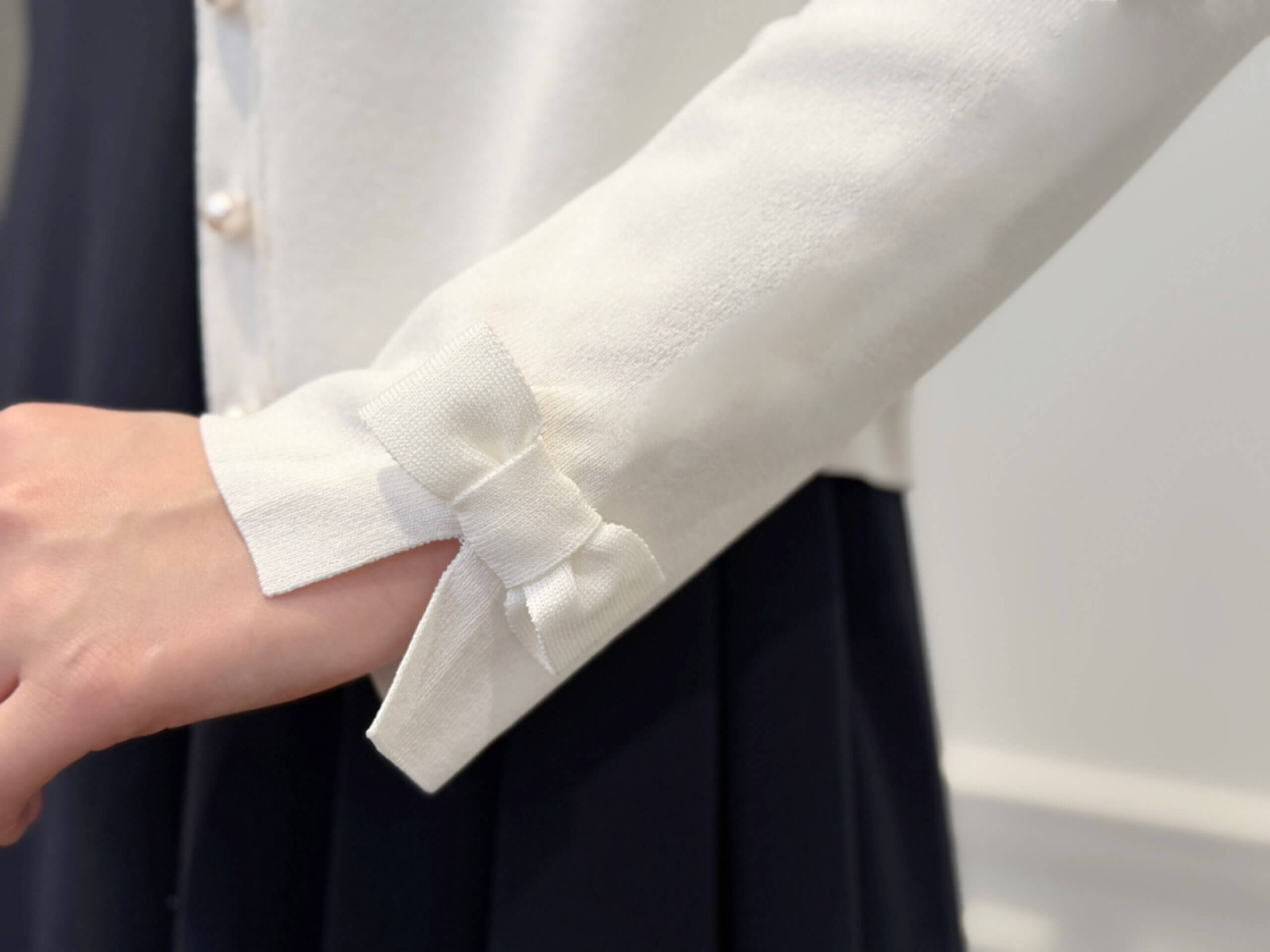 スリーブリボンニットカーディガンは、袖口のさりげないリボンデザインが可愛らしくて、ふとした仕草のときに目に入るのがとても素敵です。