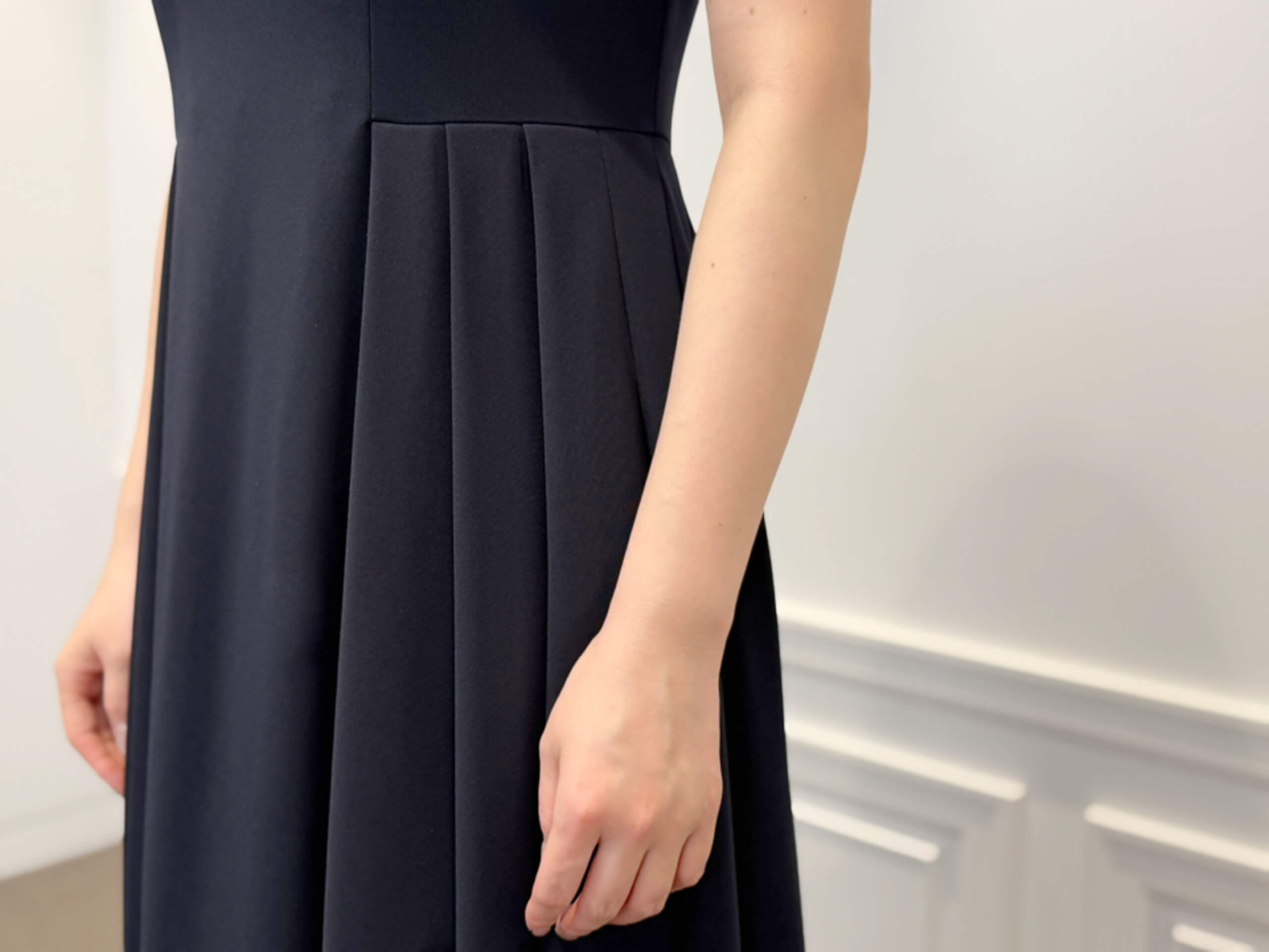 ノースリーブのデザインなので、これからの季節は一枚でさらっと着るのも素敵ですし、カーディガンやジャケットを羽織ればきちんとした場面にも対応できるのが嬉しいポイント。シンプルなのに存在感があって、長く大切に着たくなるワンピースだなと思いました。
