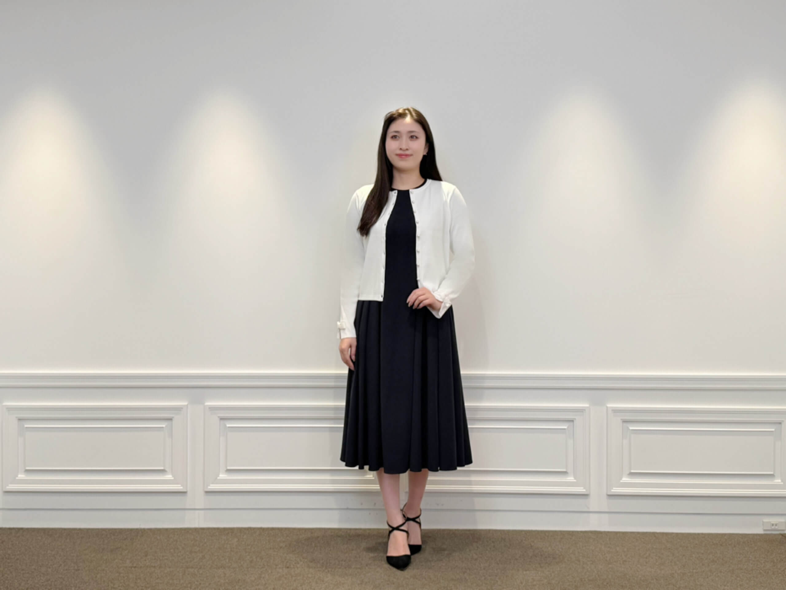 ネイビーのワンピースに白のカーディガンを合わせた、清潔感のあるきれいめスタイル。落ち着いた配色なので甘くなりすぎず、でもどこか華やかさもあって、大人っぽくまとまるのがお気に入りです。
