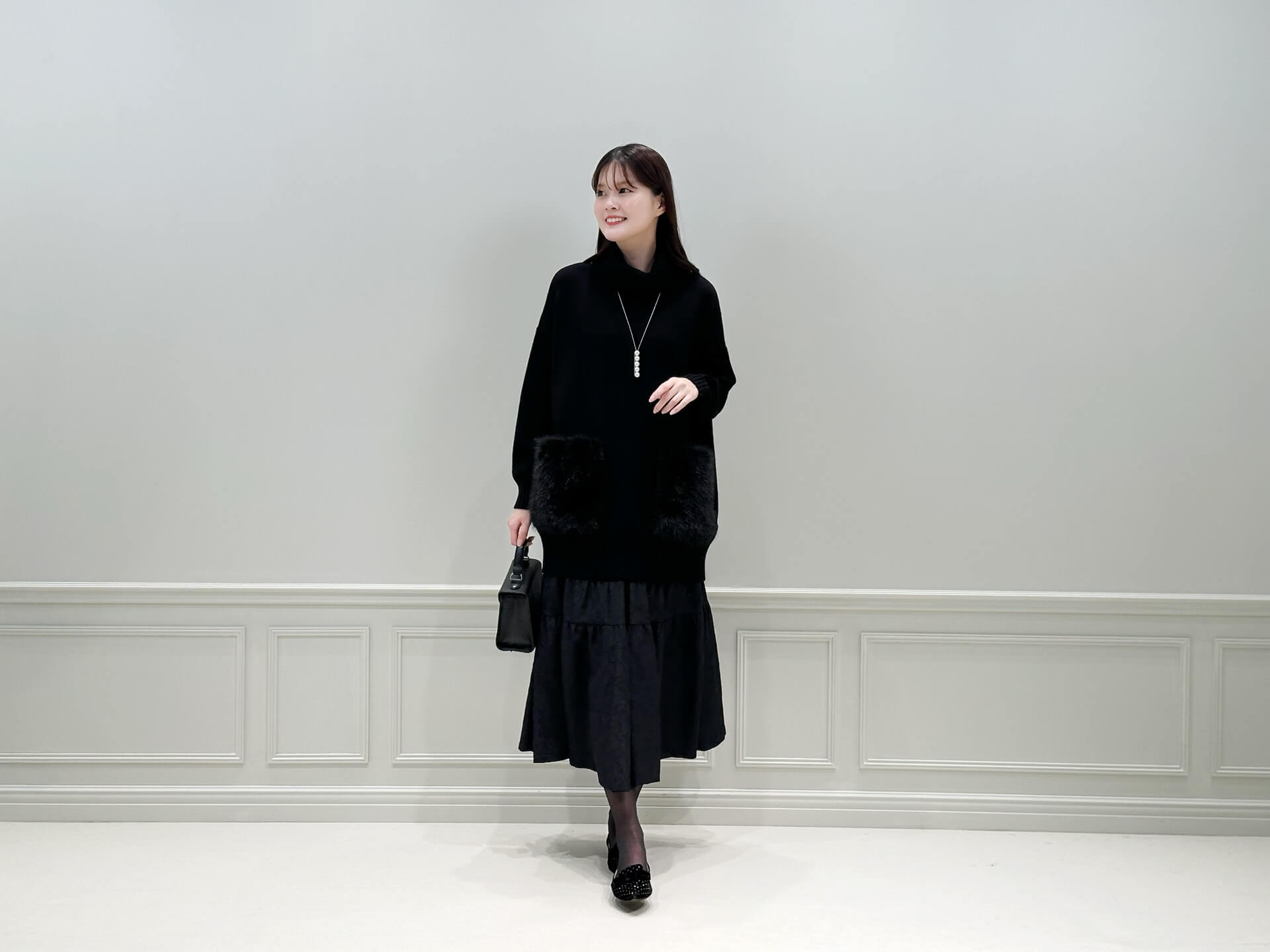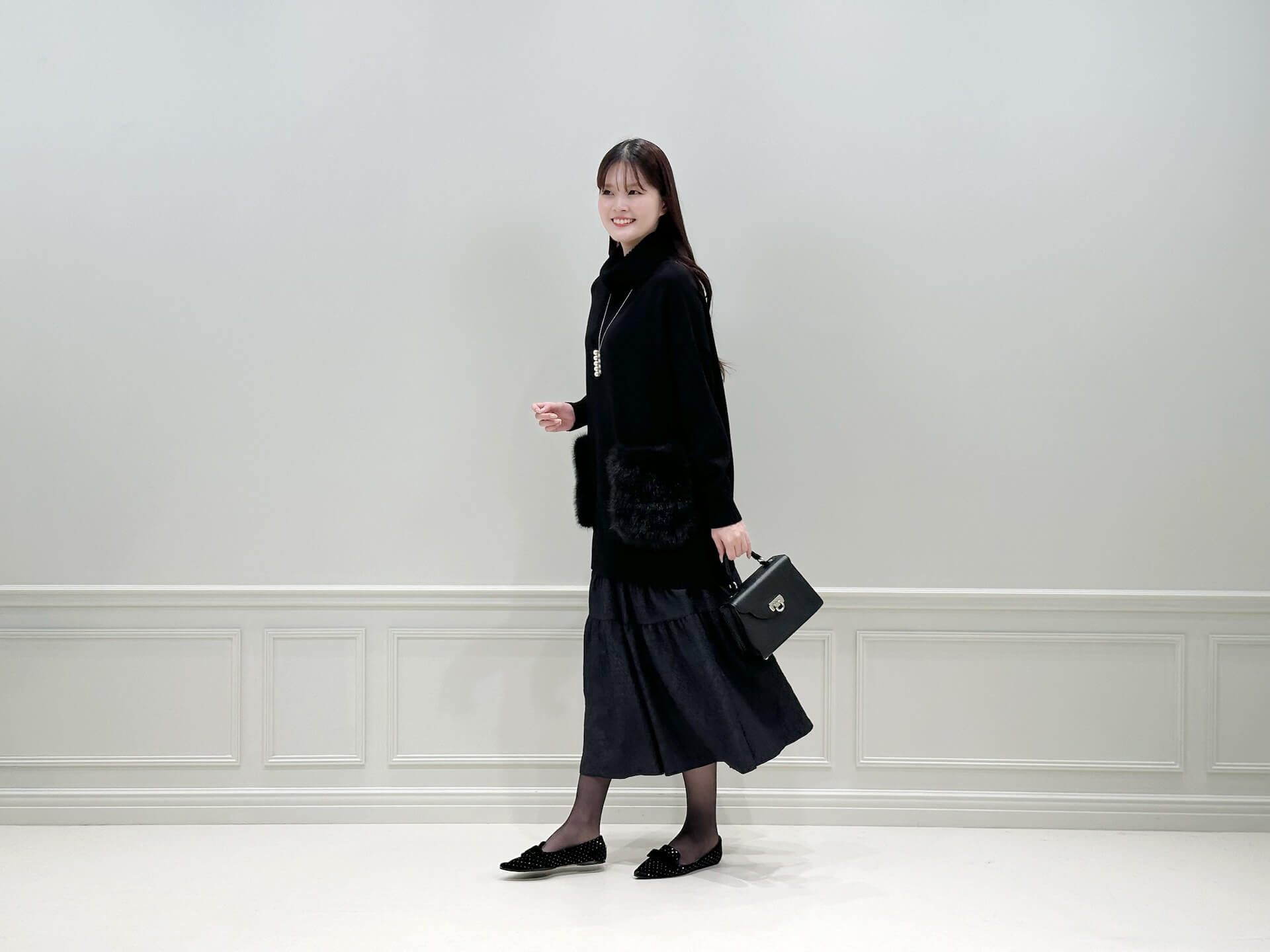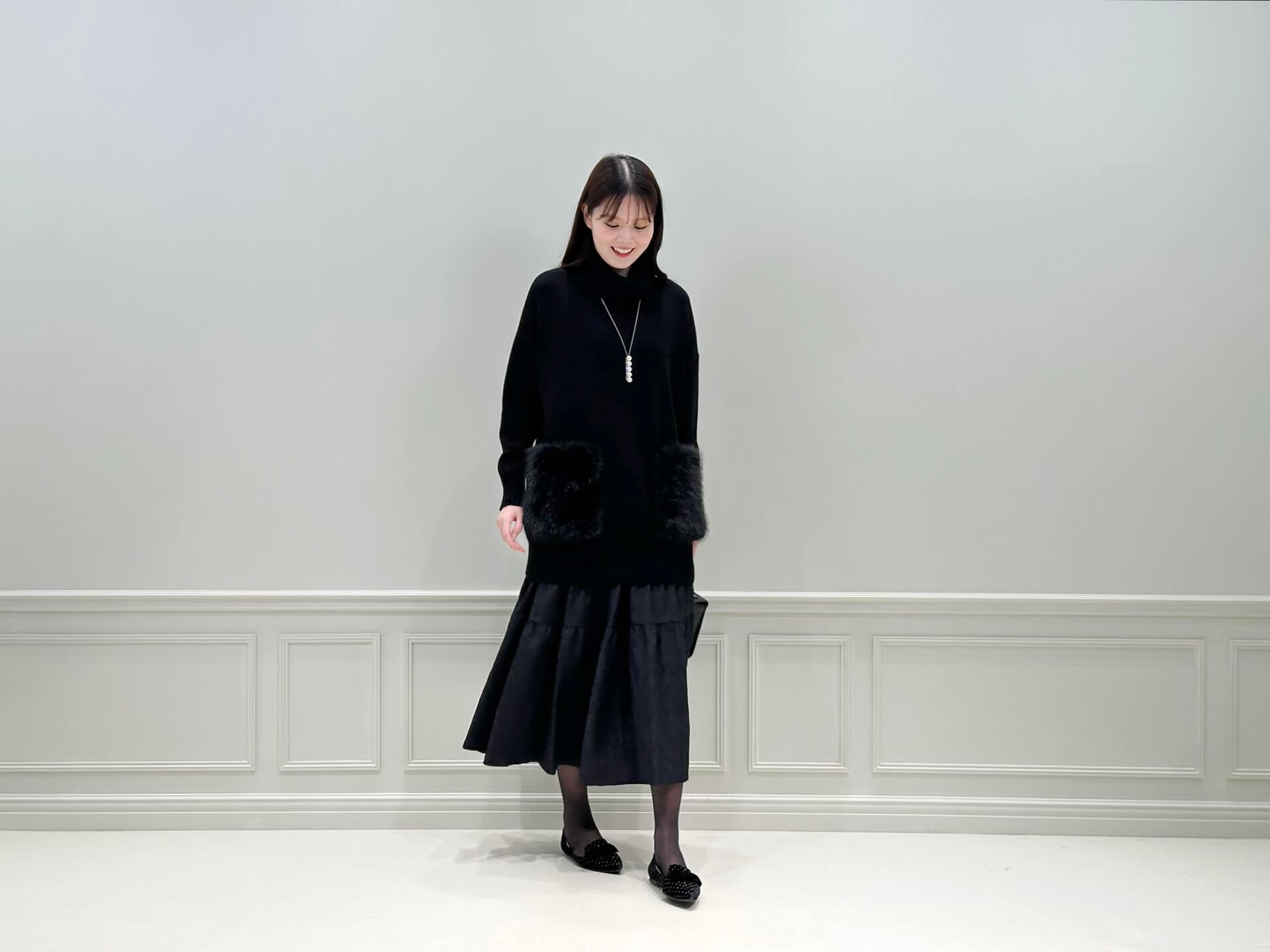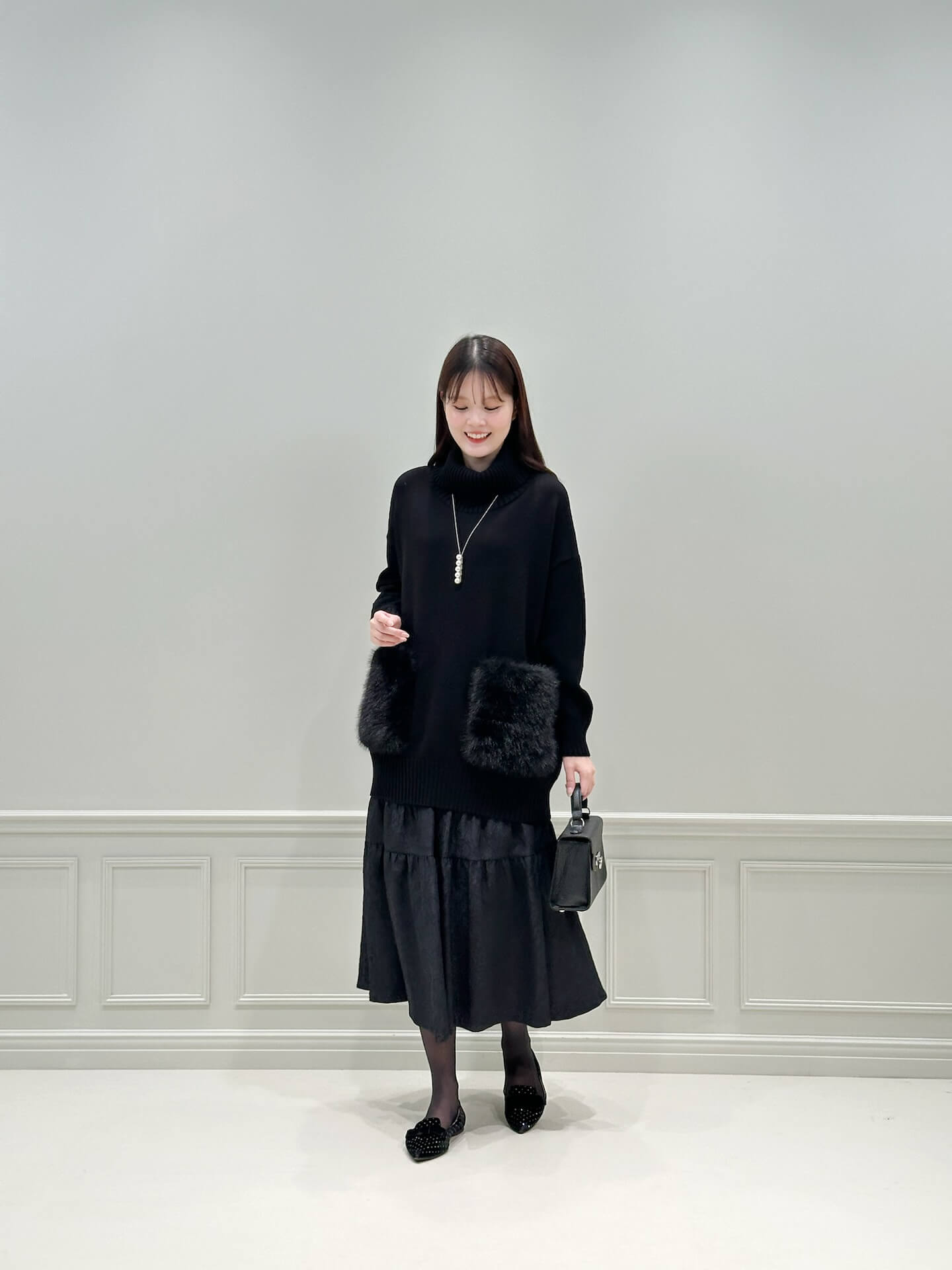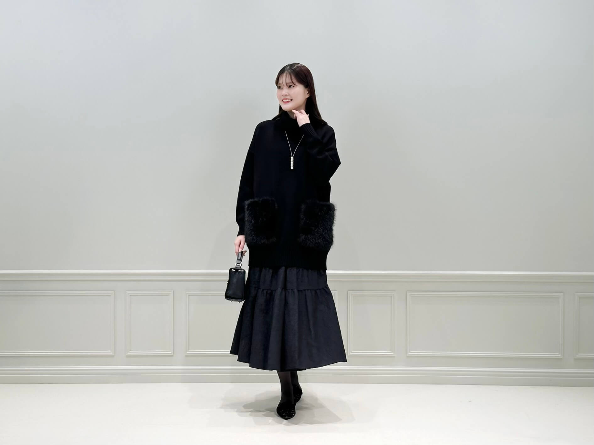 柔らかいファー、シックなジャガード、すとんと落ちるニット。素材の違いを重ねることで“黒ののっぺり感”を回避し、一気に上級者見えに。動くたびに揺れるスカートの表情が加わることで、ゆるっとしたロングニットでも“ちゃんとおしゃれしてる感”が簡単に作れます!