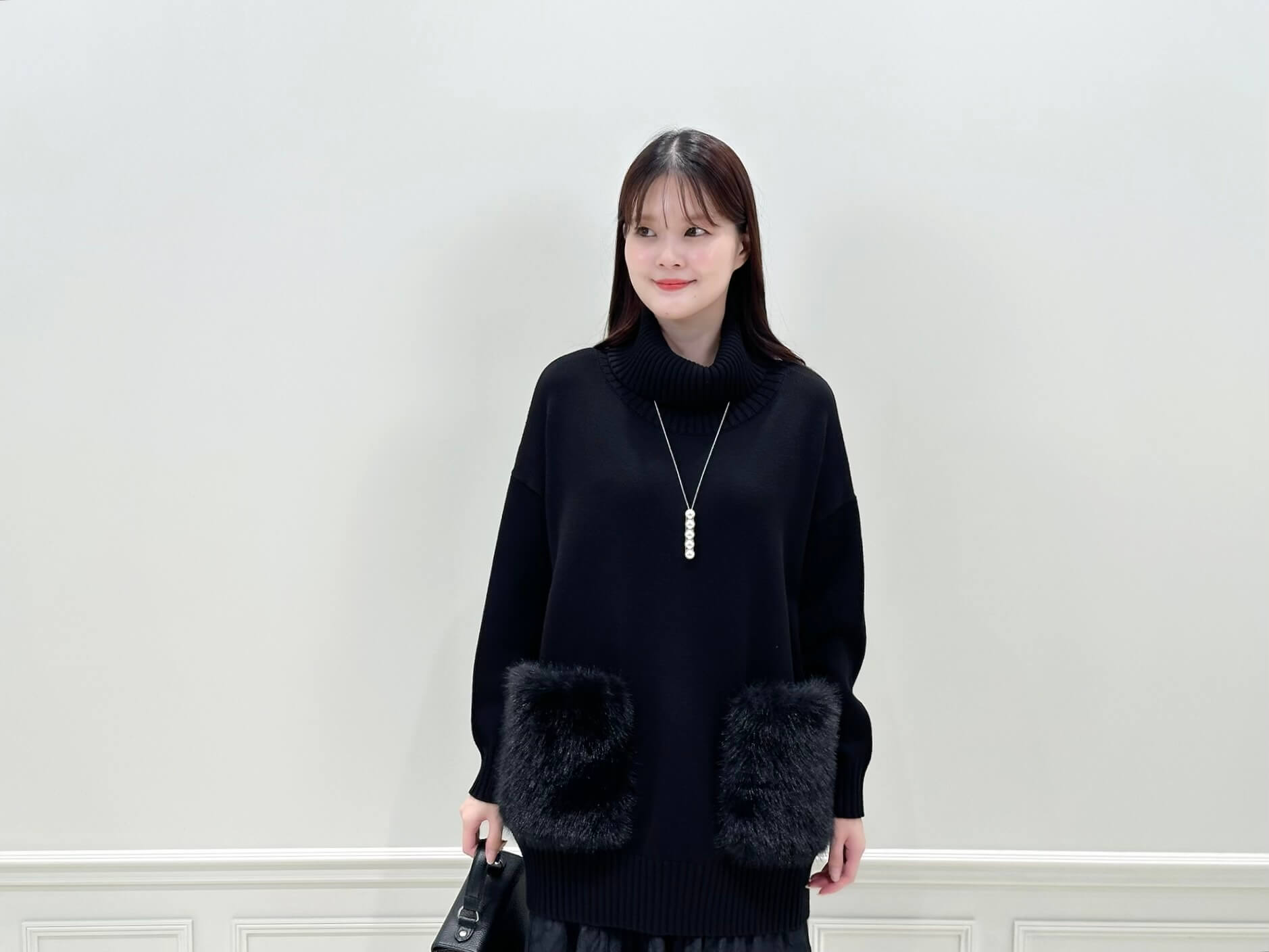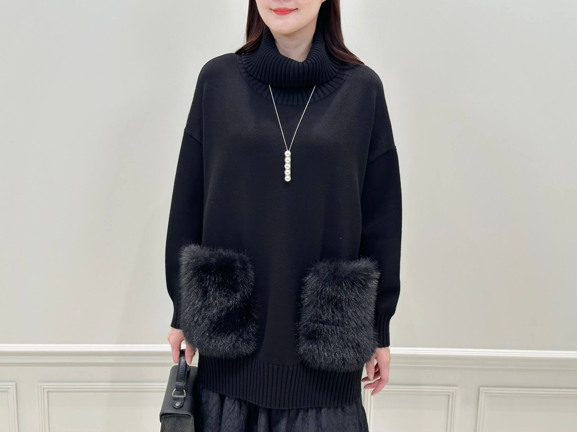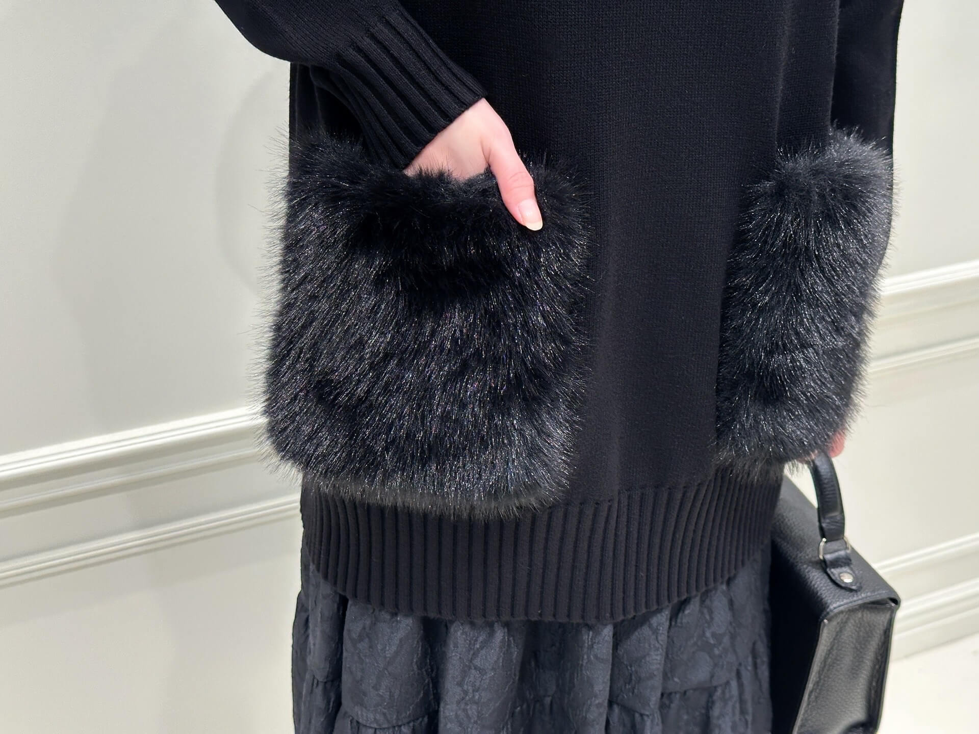主役にしたのは、ふわふわのフェイクファーポケットが目を引くロングニット。