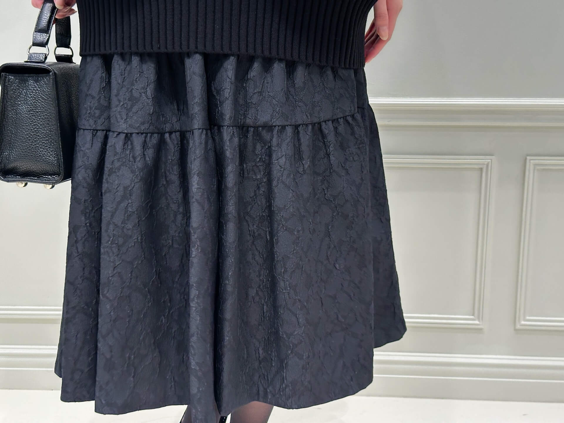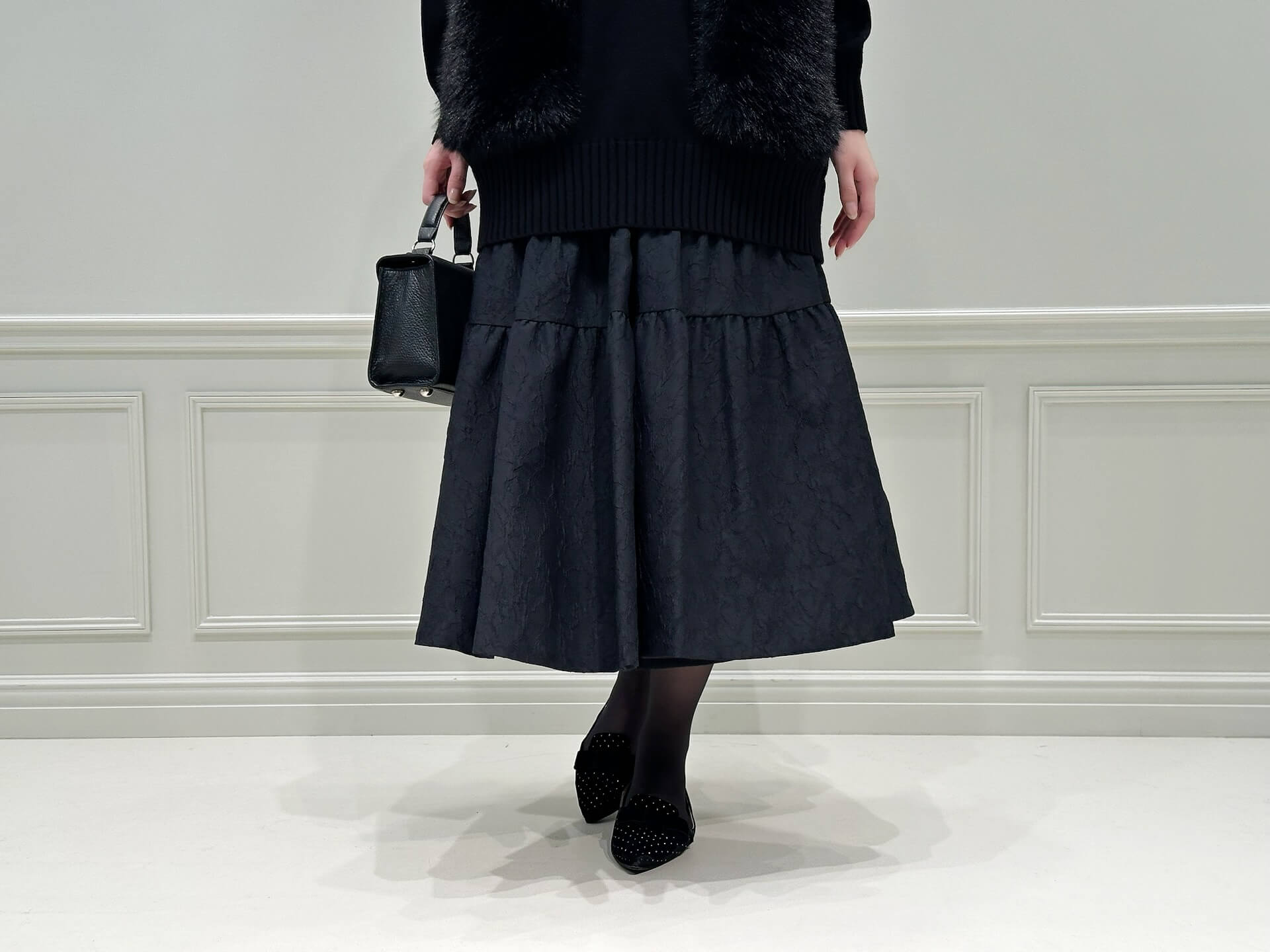 膨れジャガード特有の“ぽこぽこ”とした表面感が、重たくなりがちな真冬の黒コーデに華やかな奥行きを添えてくれます。三段のギャザー切替で自然な縦ラインが生まれ、ロングニットとの重ねでも腰位置がぼやけず、すっきりスタイルアップ!