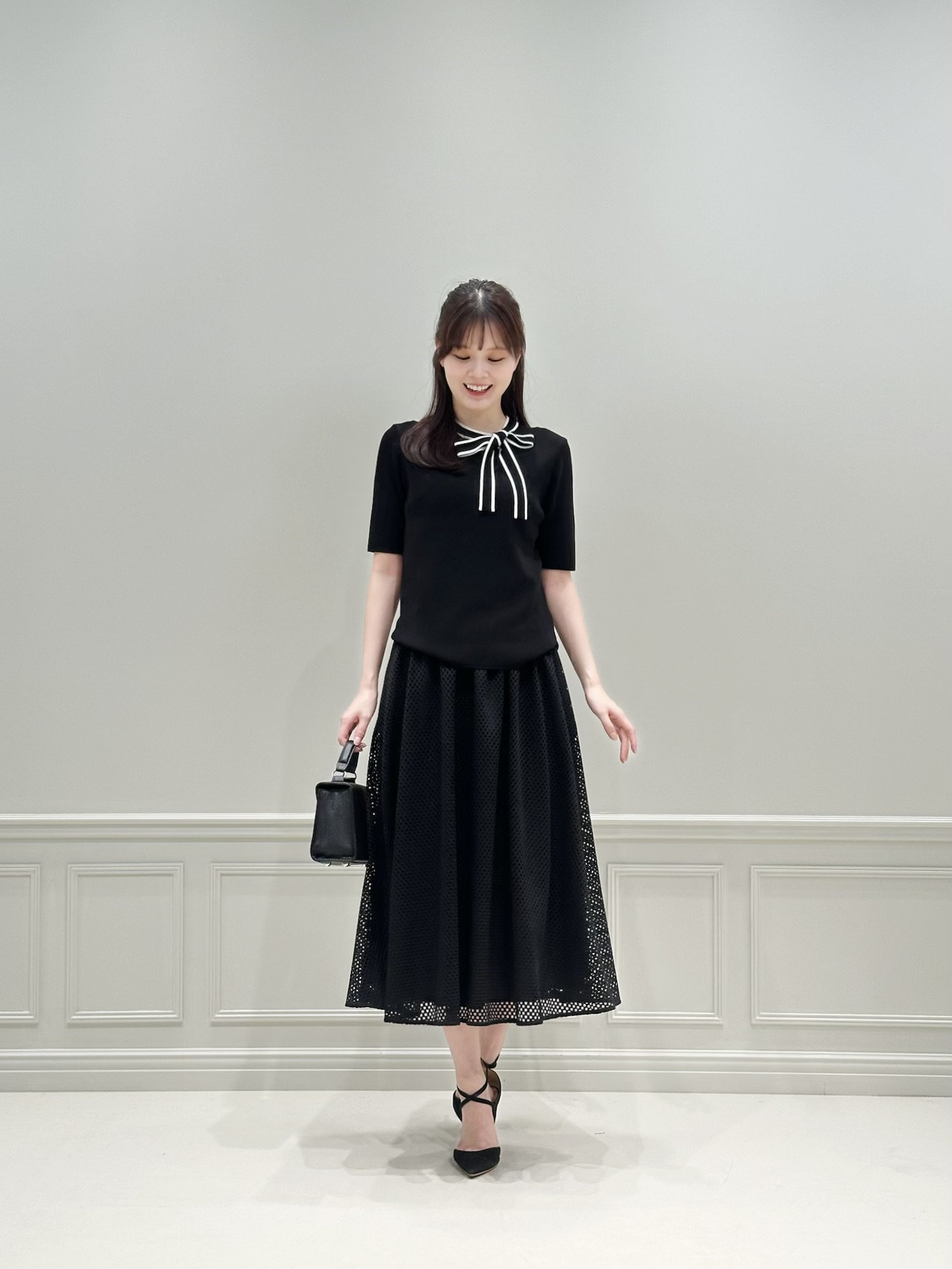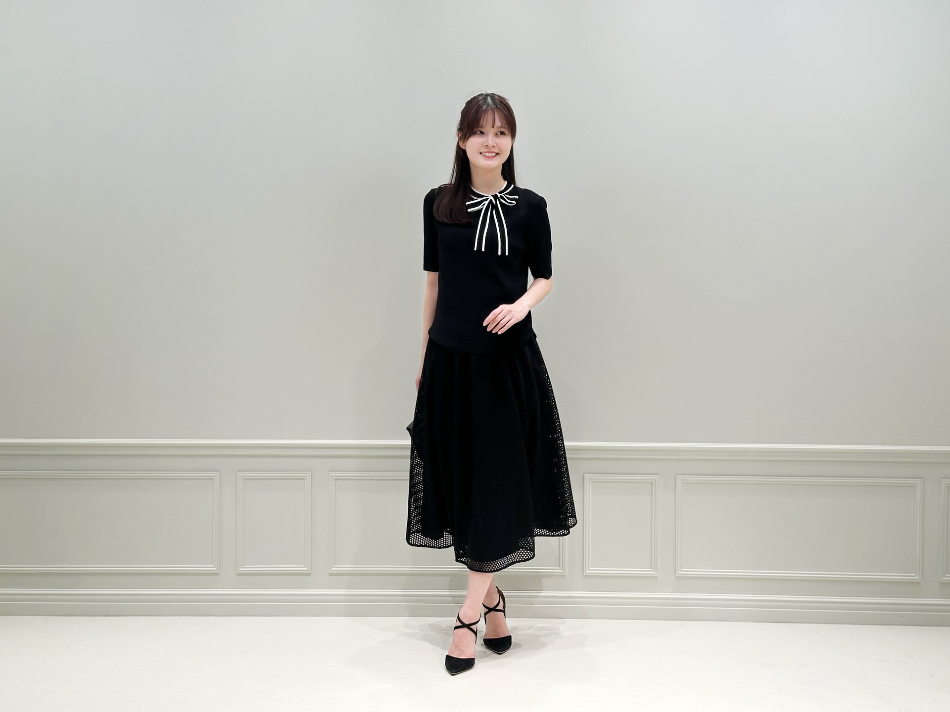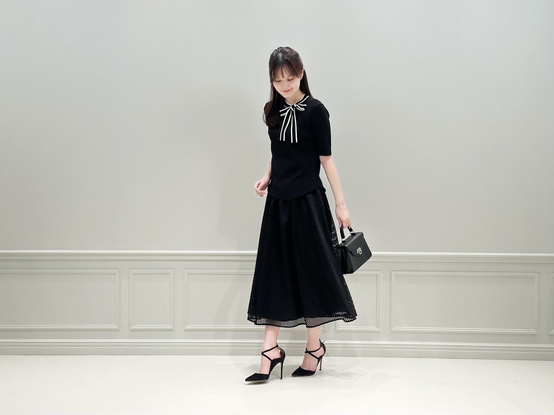 バイカラーリボンタイニットに、メッシュレースフレアスカートを合わせたブラックのワントーンコーデ。コンパクトなトップスにボリュームのあるスカートを合わせることで、自然とメリハリのある美しいシルエットが完成します。