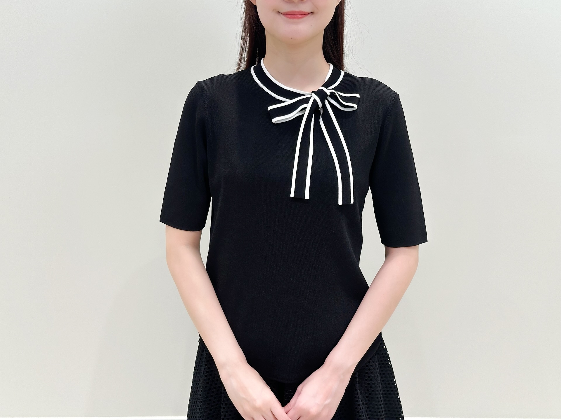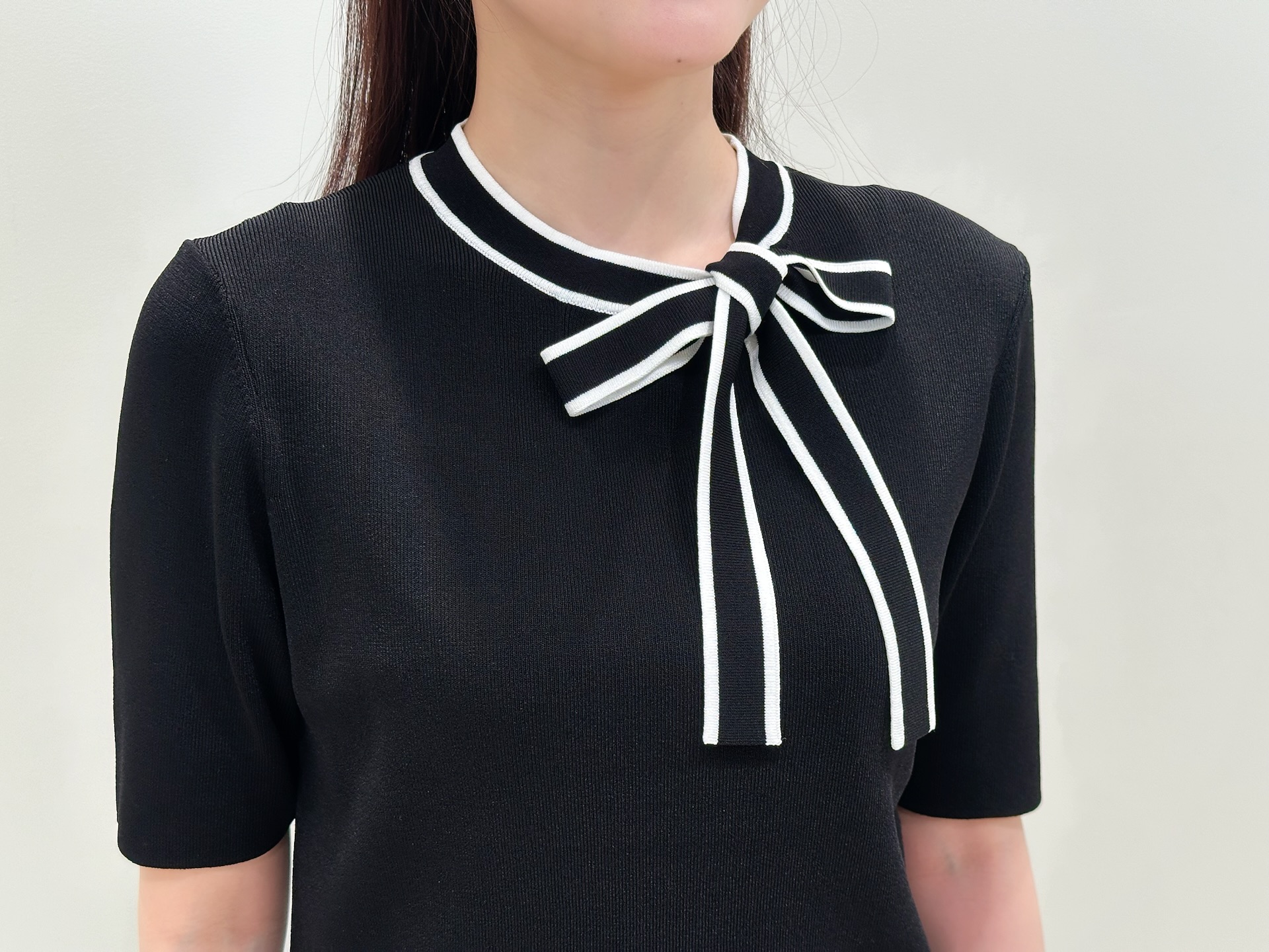 バイカラーリボンタイ半袖ニットプルオーバーは、ネックラインのサイドにあしらわれた華奢なリボンタイが印象的な一枚。さりげない配色デザインが顔まわりを明るく見せ、ブラックでも重たくならず、程よい華やかさをプラスしてくれます。