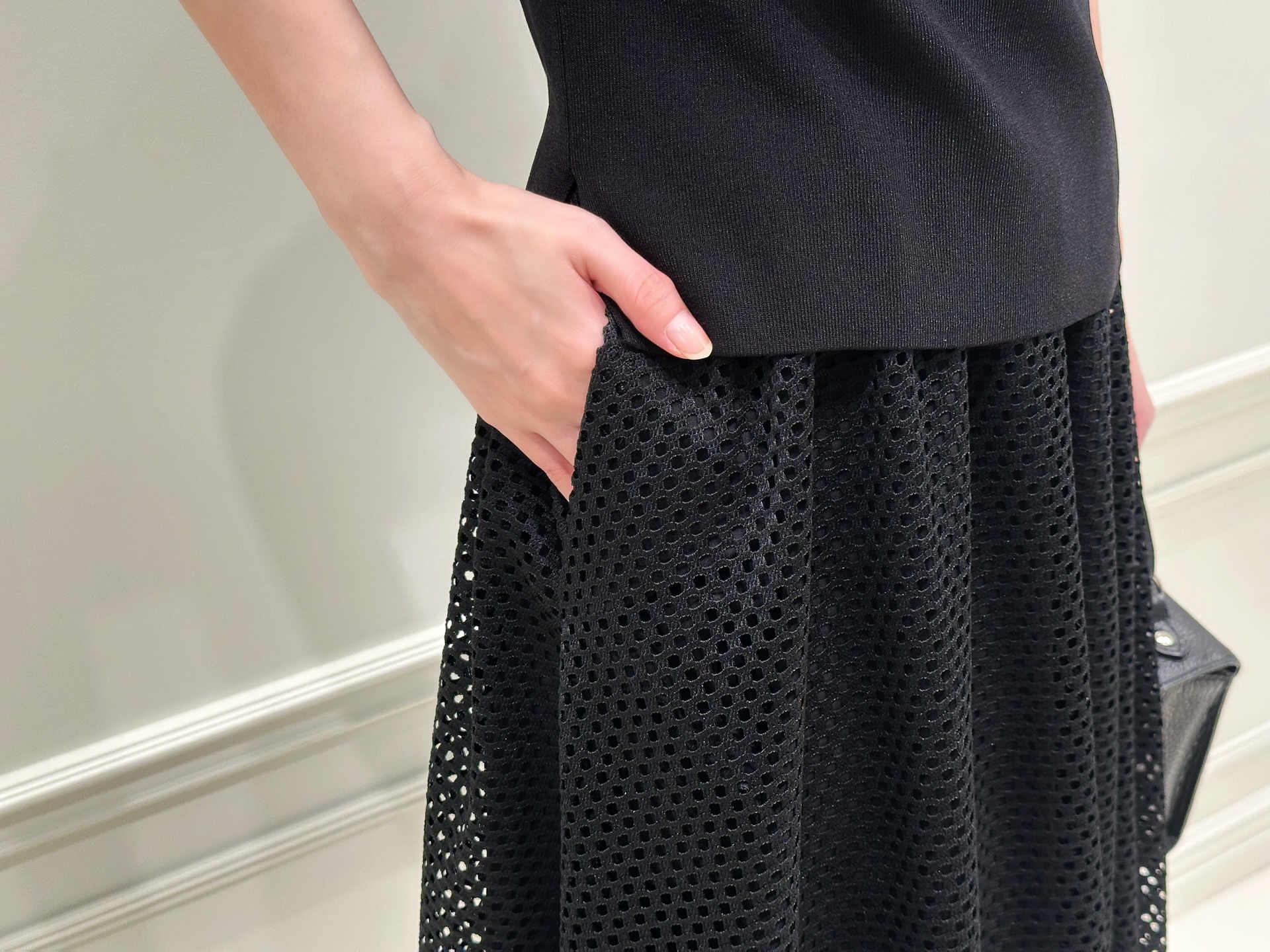 繊細な透け感と軽やかな素材感が魅力の一着。表地に重ねたメッシュレースが奥行きのある表情を生み、歩くたびにふんわりと揺れるシルエットが女性らしさを引き立ててくれます。