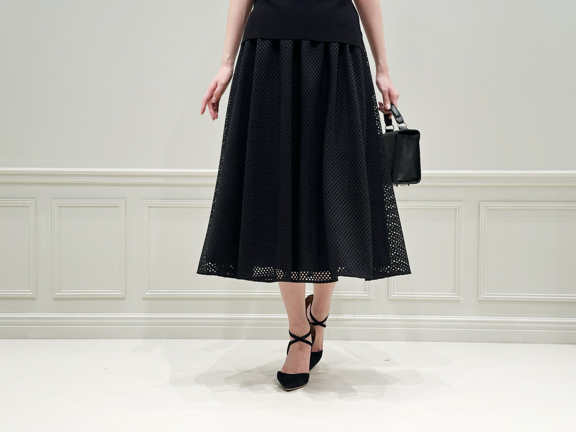 ウエストは総ゴム仕様で、たっぷりと寄せたギャザーが美しいフレアラインを演出。程よいボリュームがありながらも軽やかで、ブラックでも重たい印象にならず、上品な存在感を放ちます。裏地付きで安心感のある着心地も嬉しいポイント!
