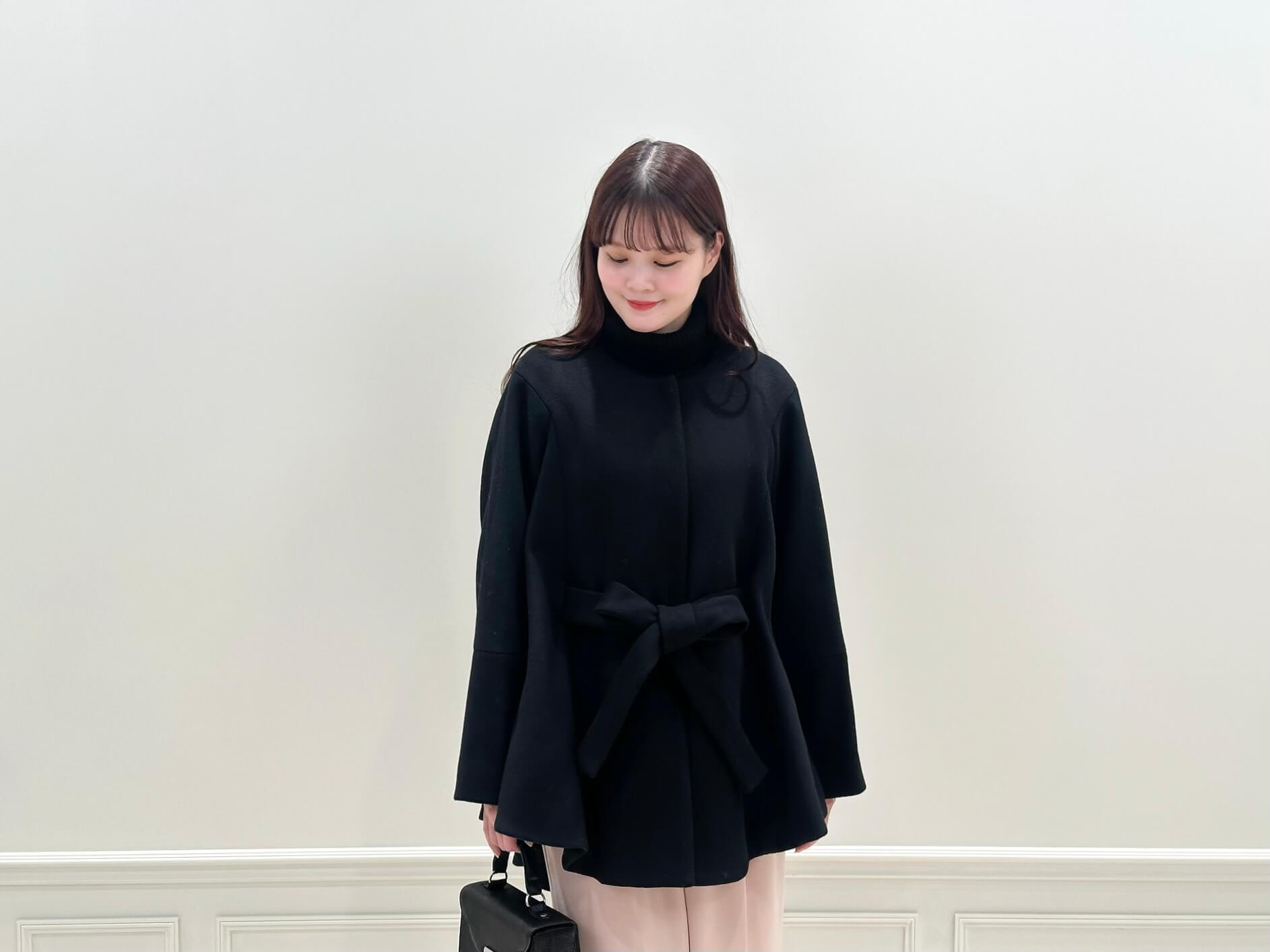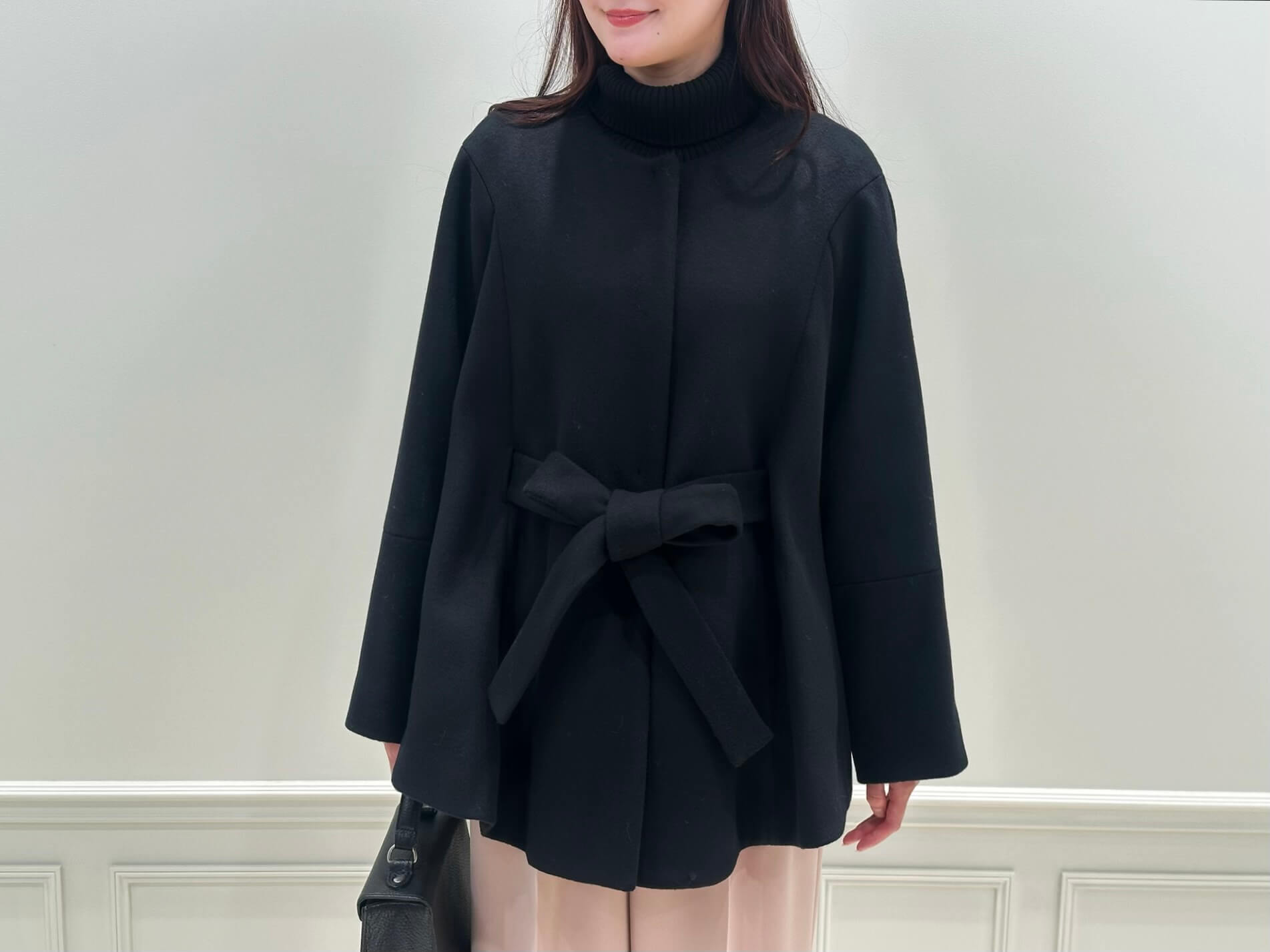 コート・ニット・バッグをブラックで揃えることで、全体に統一感を持たせつつ、ウエスト位置で結んだリボンベルトが女性らしいメリハリをプラス!シンプルな配色だからこそ、素材の上質さやシルエットの美しさが引き立ち、きちんと感のある冬スタイルに仕上がります。