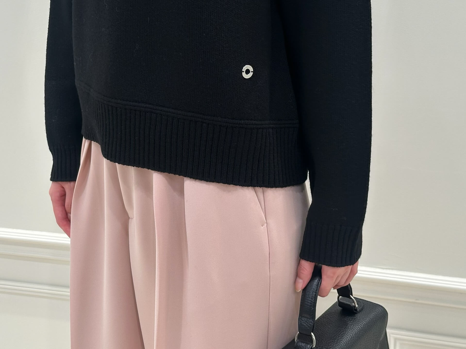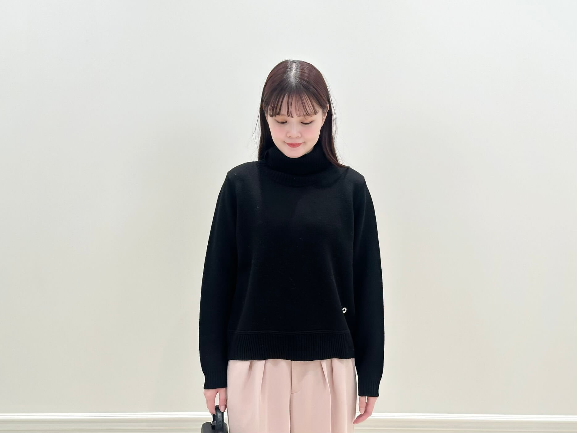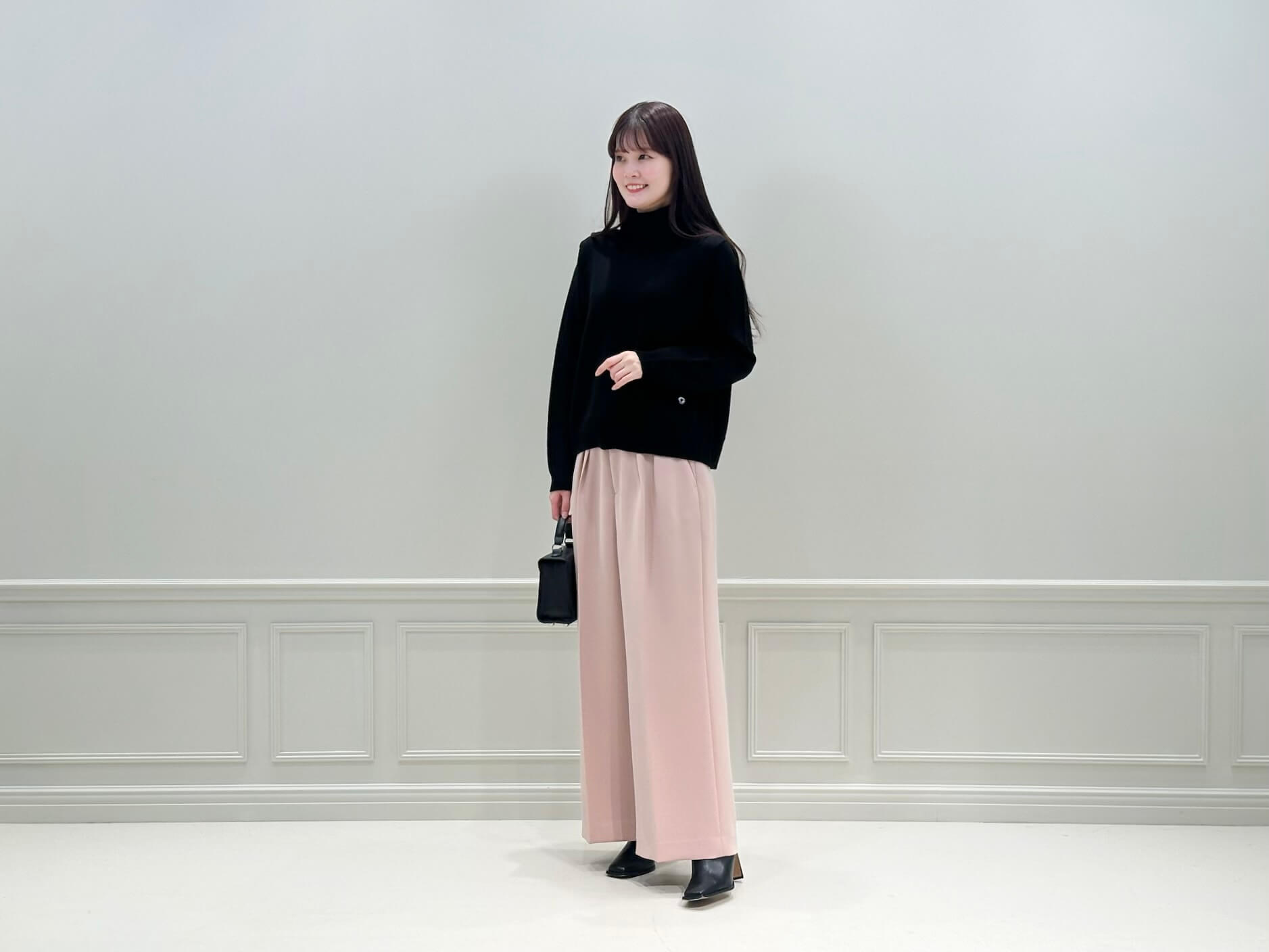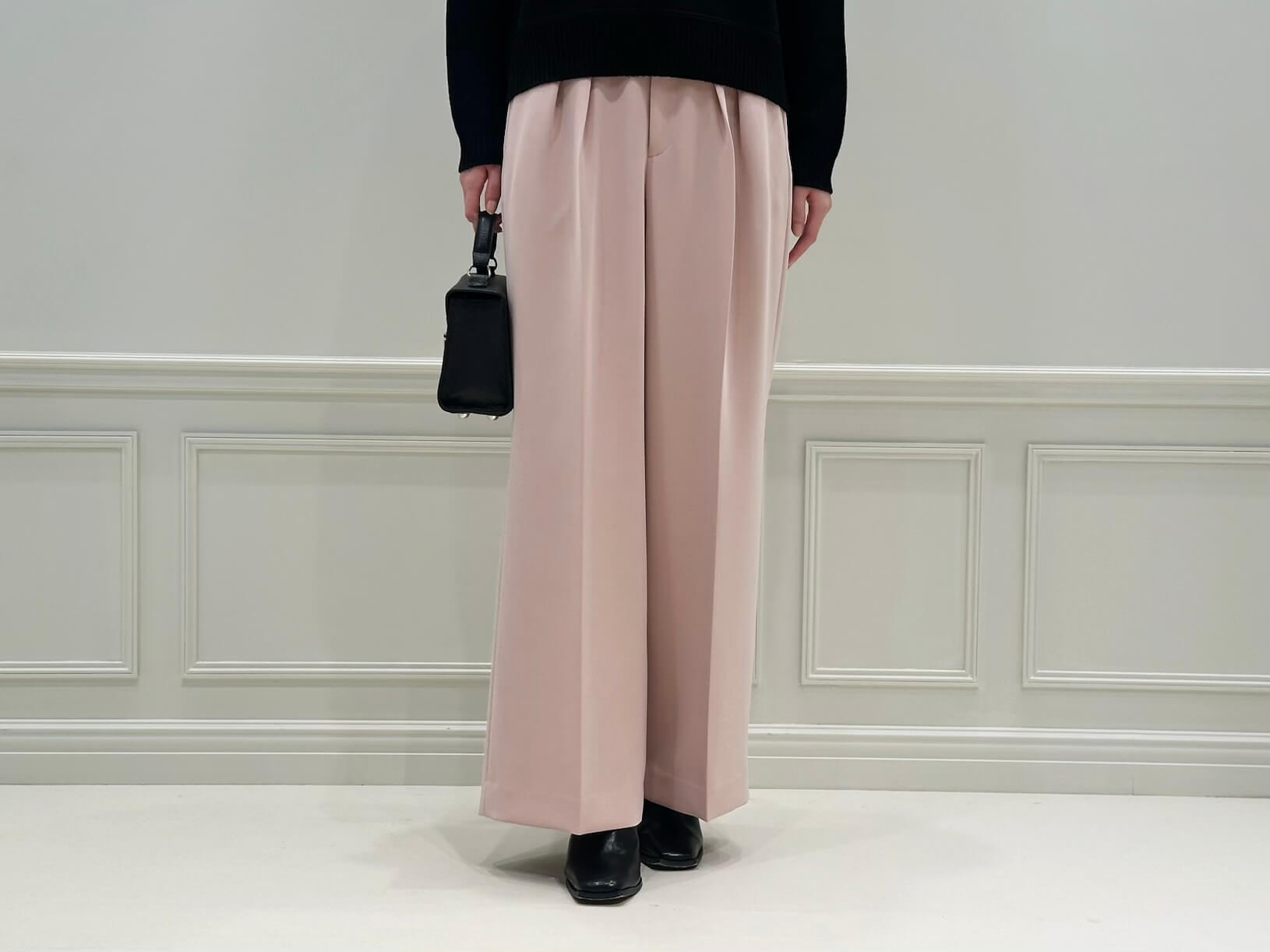 コートを脱いだ時も、ブラックのニットとピンクベージュのパンツのコントラストが効いた、洗練されたスタイリングに。重くなりがちな冬の室内スタイルも、程よく軽やかで、女性らしい印象をキープできます。