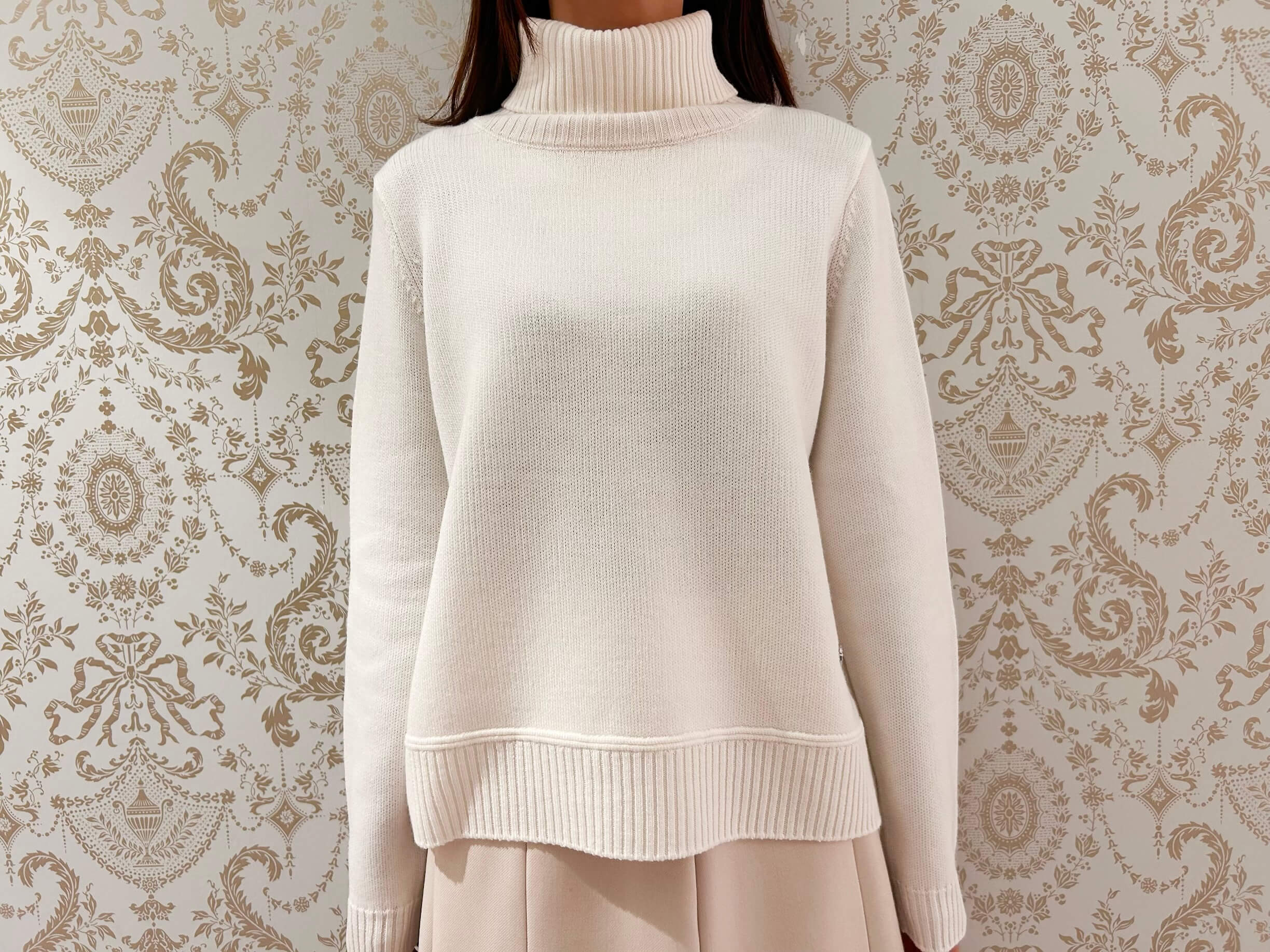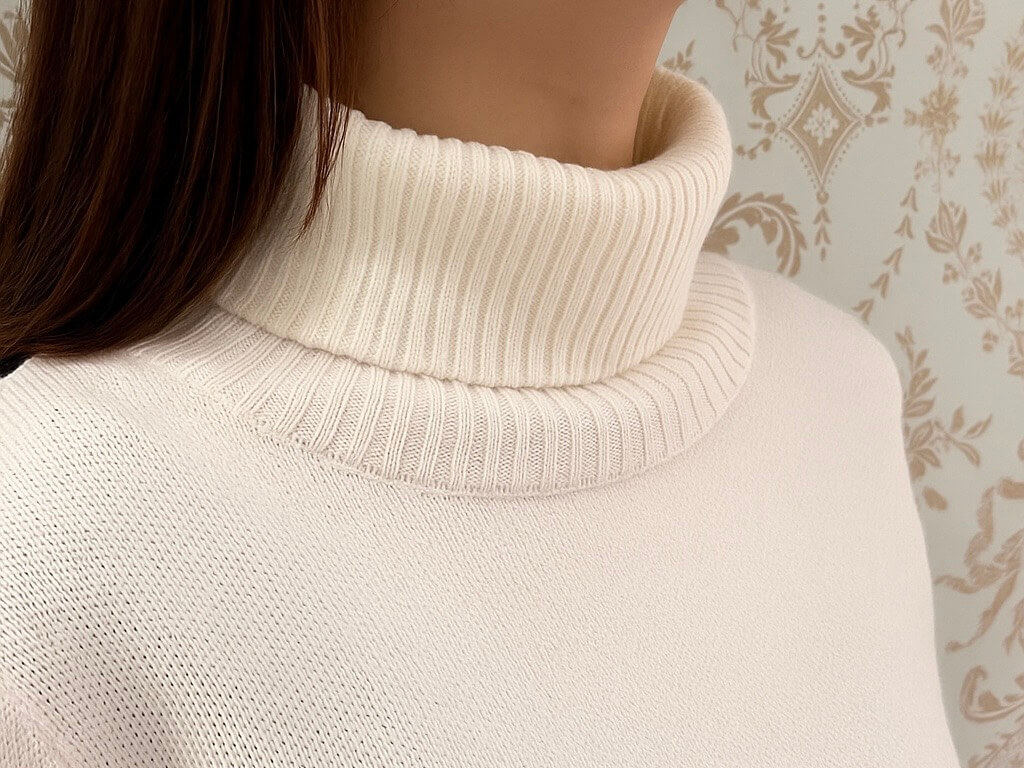 上品なオフホワイトが冬らしく温かみのある印象を与えてくれるタートルネックニット。