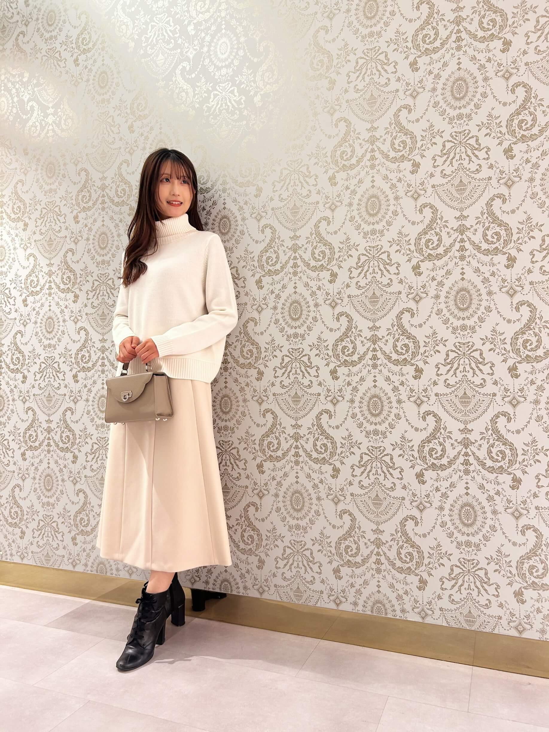 落ち着いたベージュトーンで、どんなトップスにも合わせやすく、冬の淡色コーディネートにもぴったりです。
