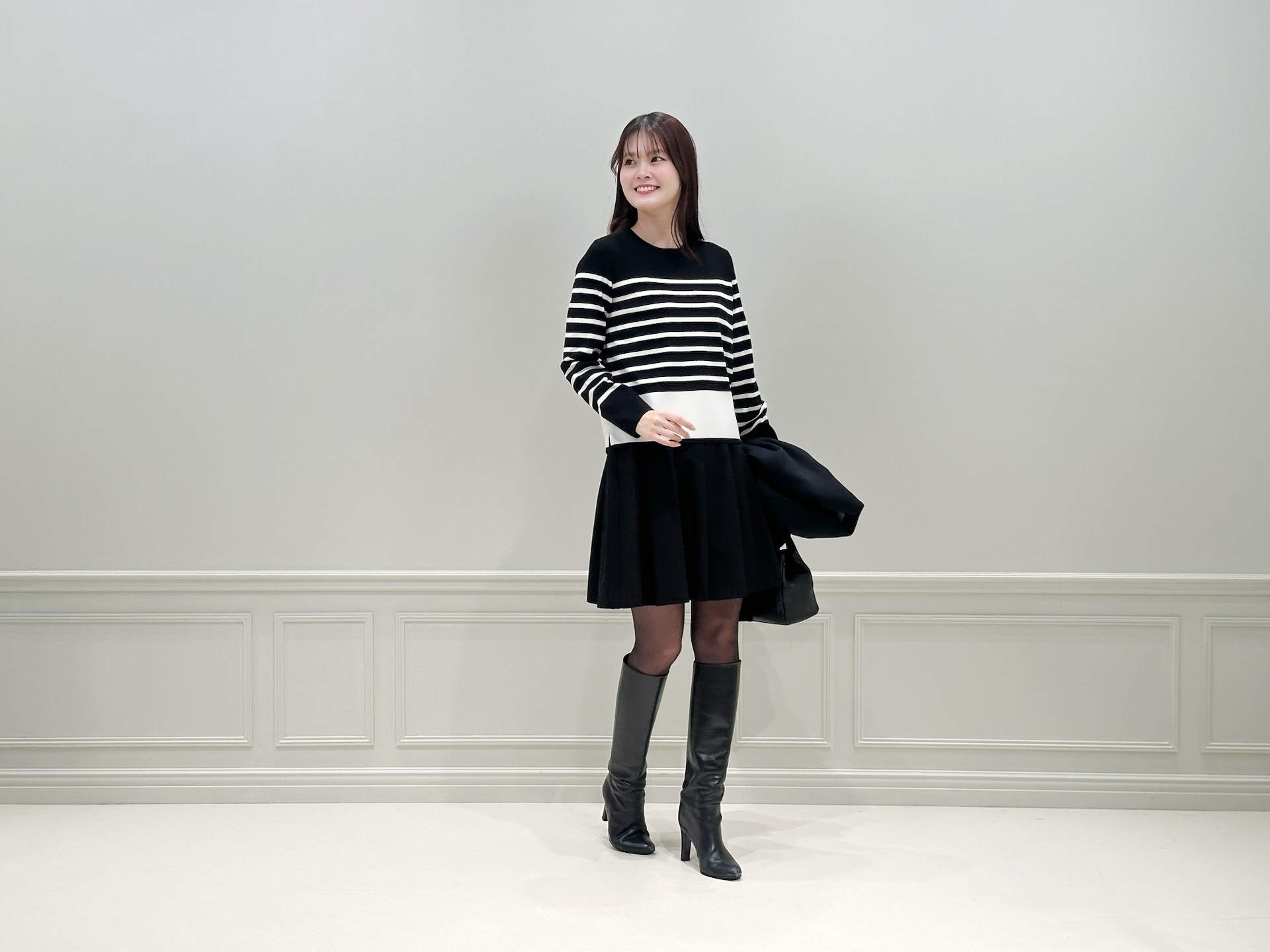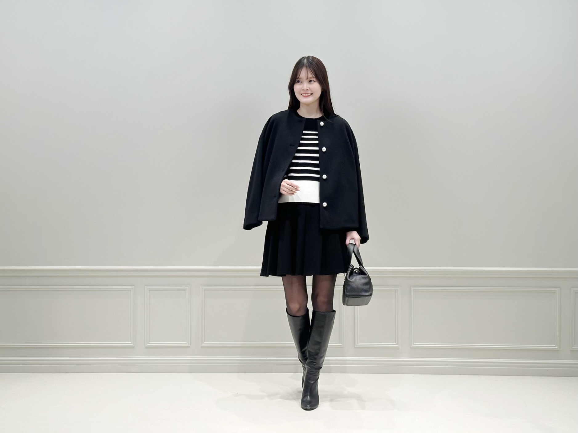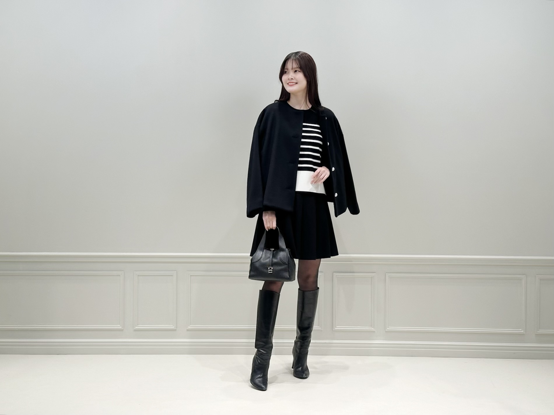 ボーダーの白がアクセントとなり、重くなりがちな冬の黒コーデに抜け感をプラス。ショートパンツ×ロングブーツで縦ラインを強調し、パールのショートコートが視線を上に集めることで、全身のバランスが美しく整います!