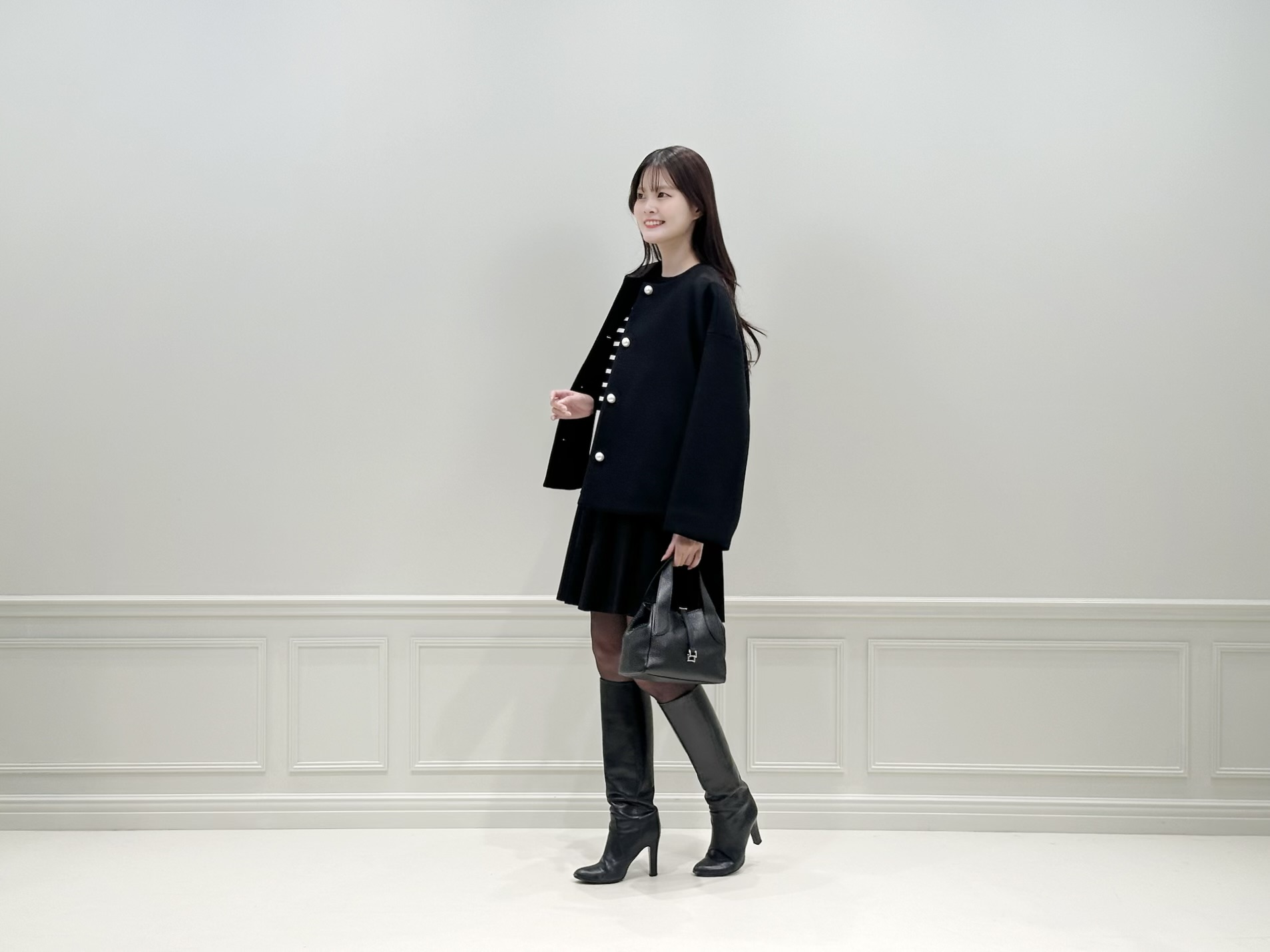 シンプルながら、女性らしさと今っぽさをしっかり仕込める今回のモノトーンコーデ。“ショート丈×パール×ミニボトム”というキーワードは、この冬の気分にぴったりです!