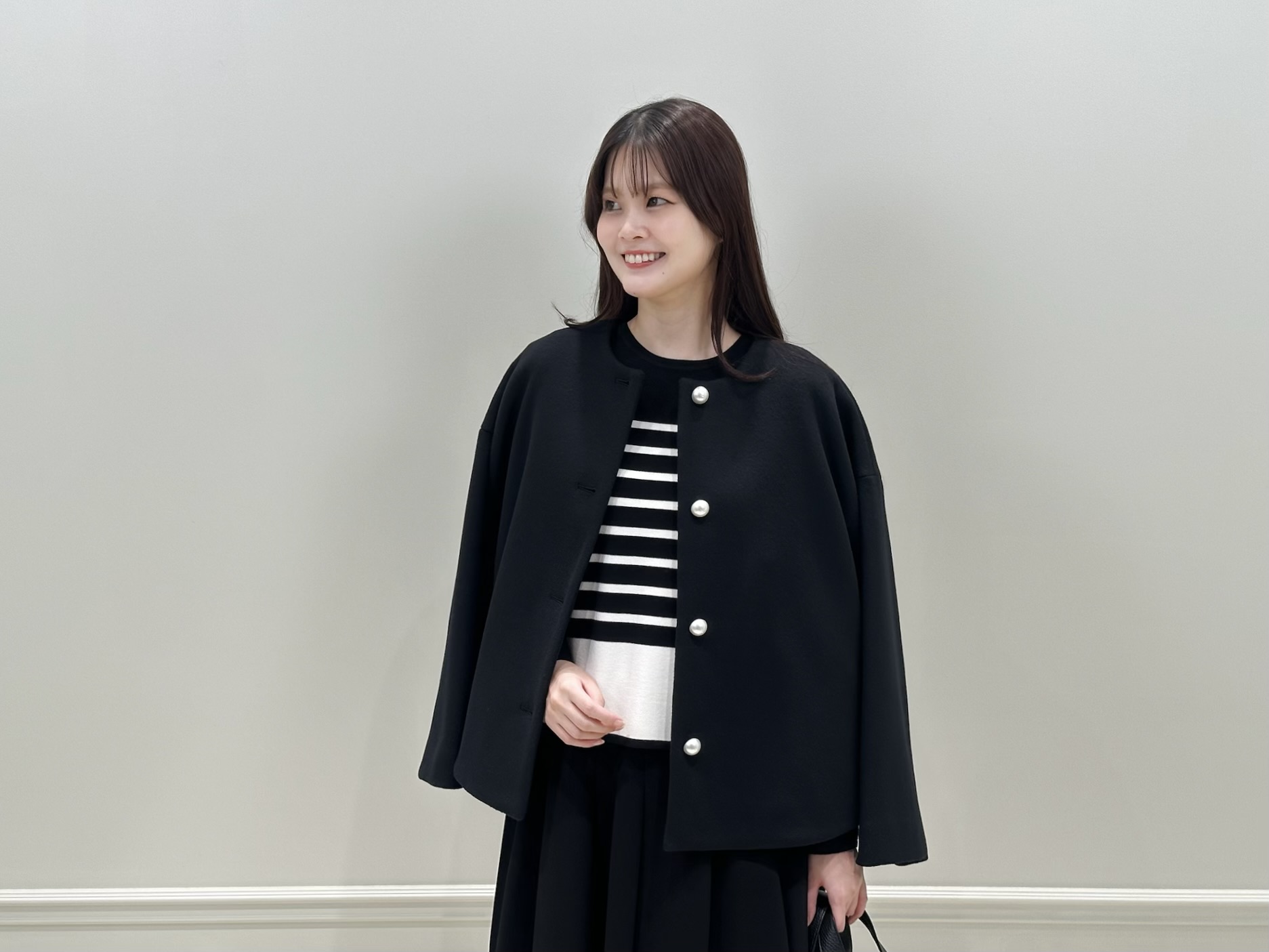 ふっくらとしたフォルムでも着膨れせず、シルエットが美しい一枚。大粒パールが冬の装いに華やぎを添え、顔まわりを品よく明るくみせてくれて、ショート丈でどんなボトムとも相性抜群。特にミニやワイドパンツと好バランス!