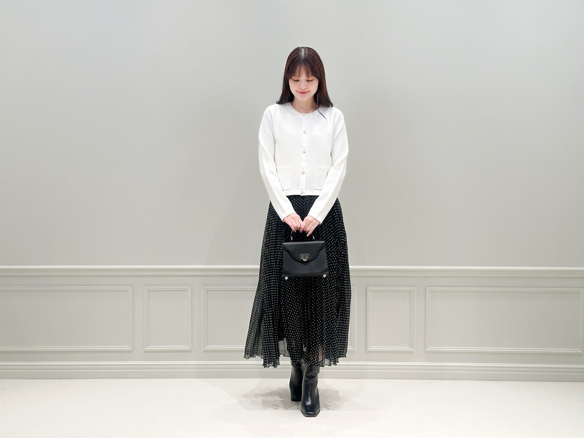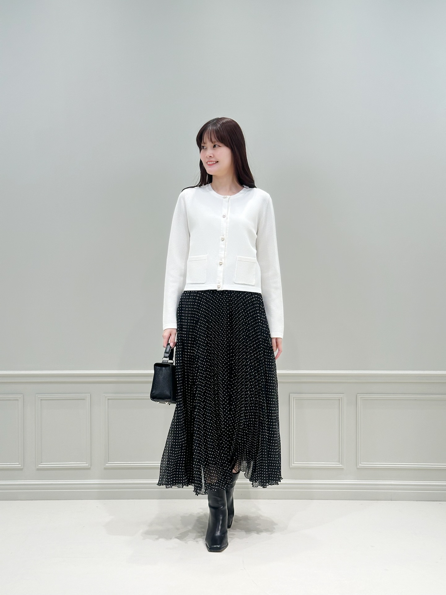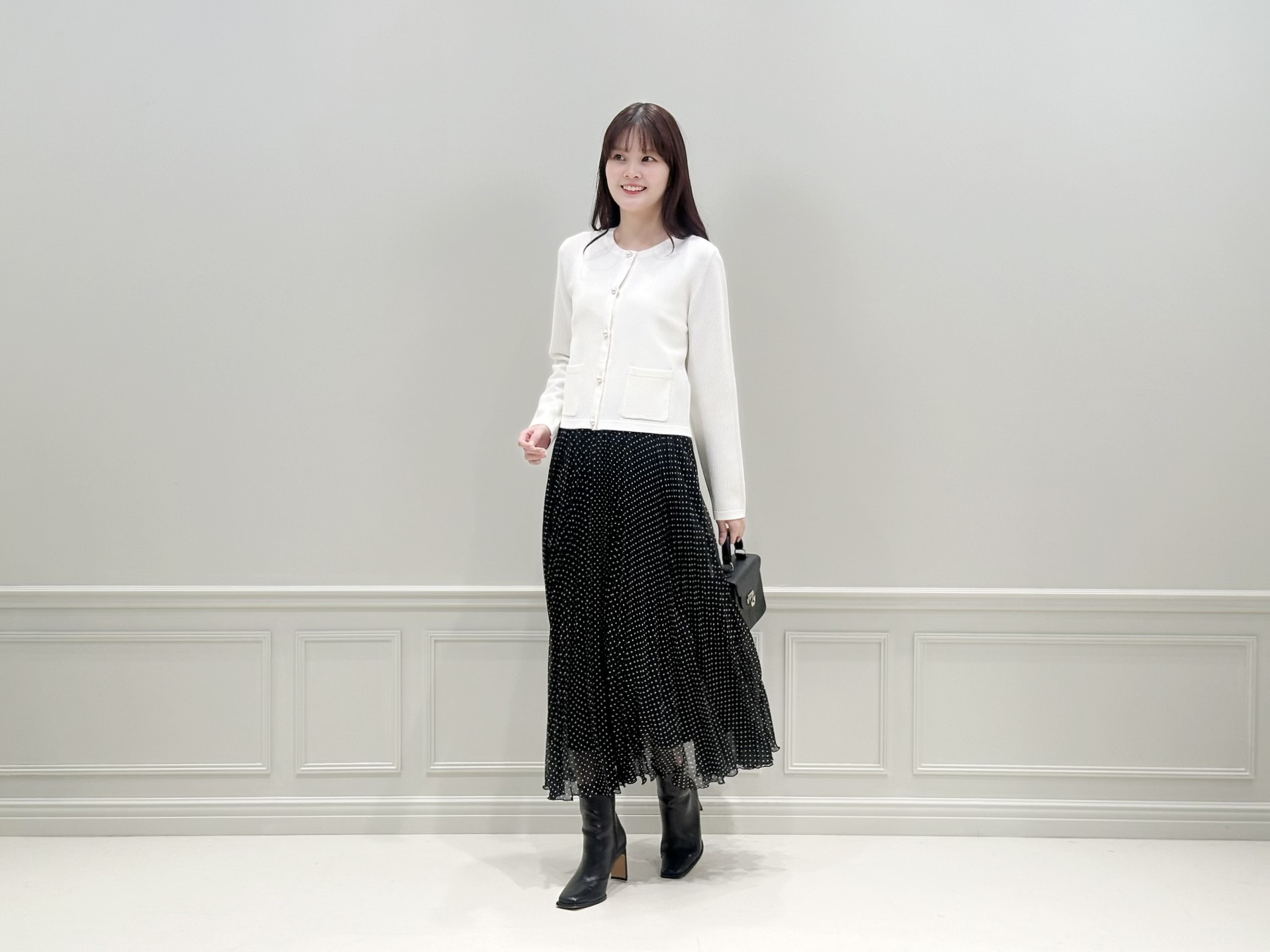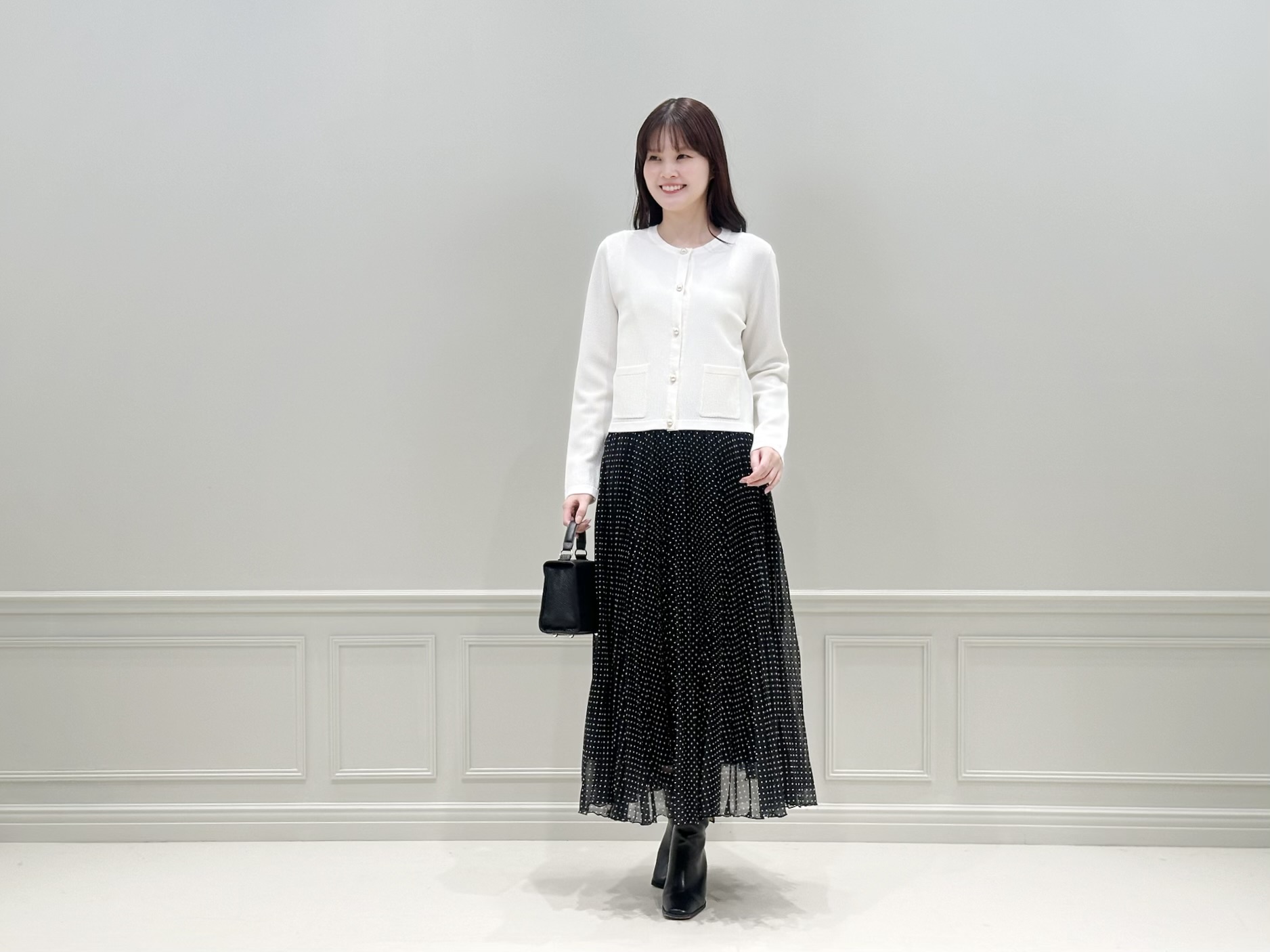 ホワイトのニットカーディガンにドット柄のプリーツスカートを合わせた、きれいめフェミニンなスタイル。足元はあえてショートブーツを合わせることで、全体を引き締めたバランスに仕上げました。