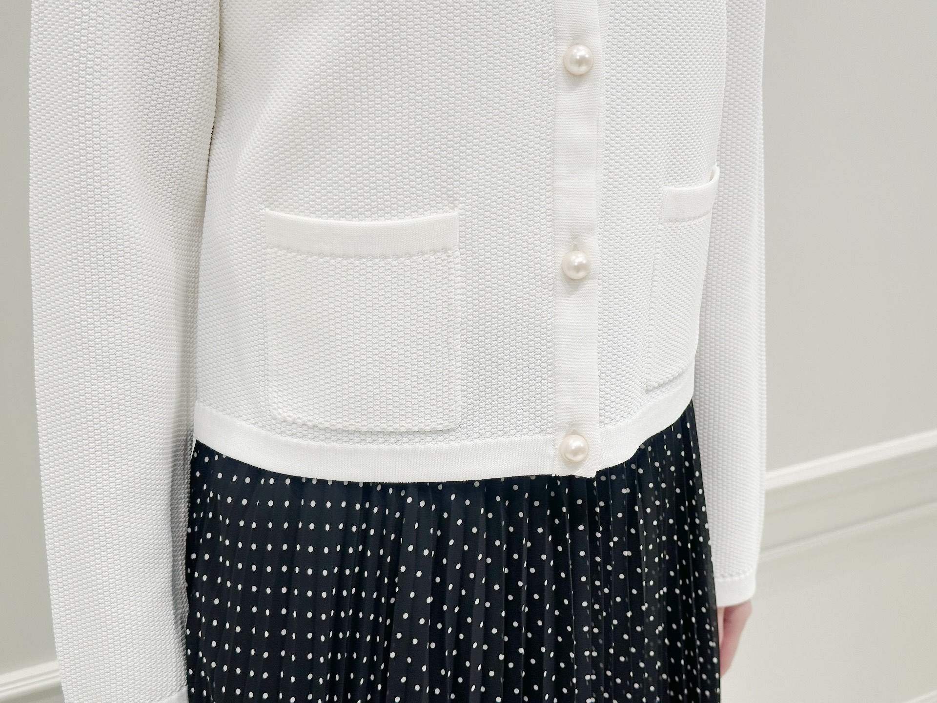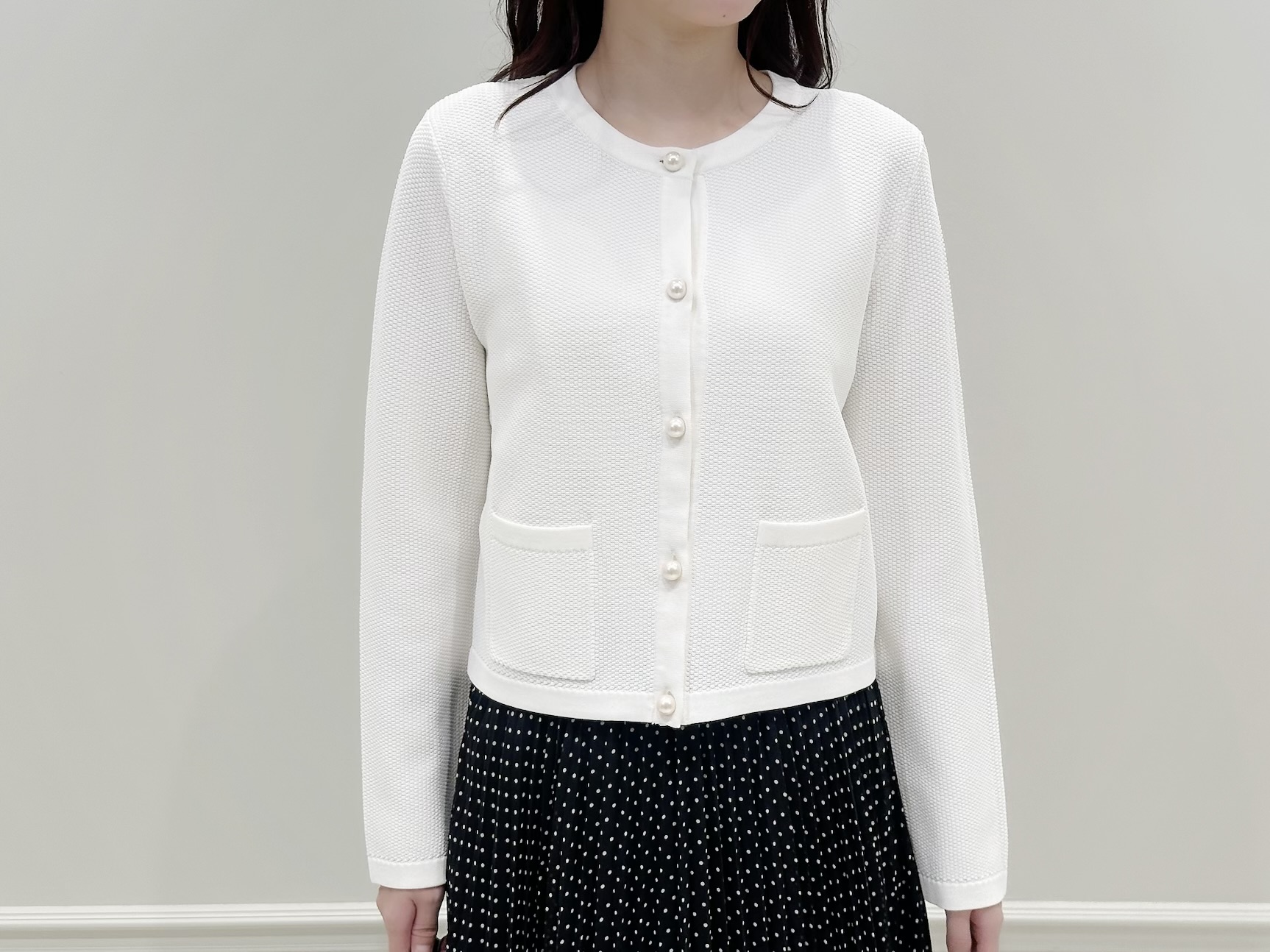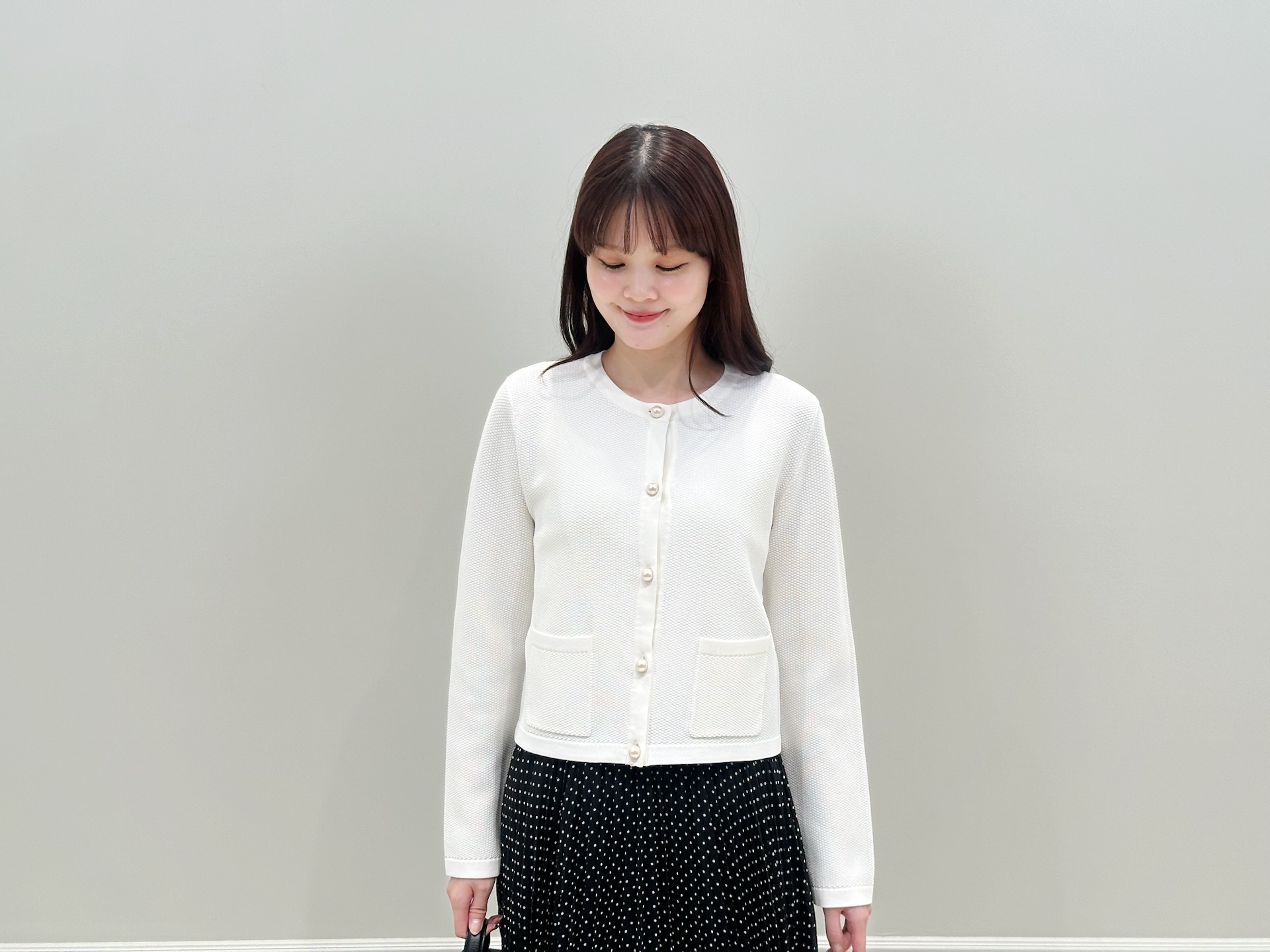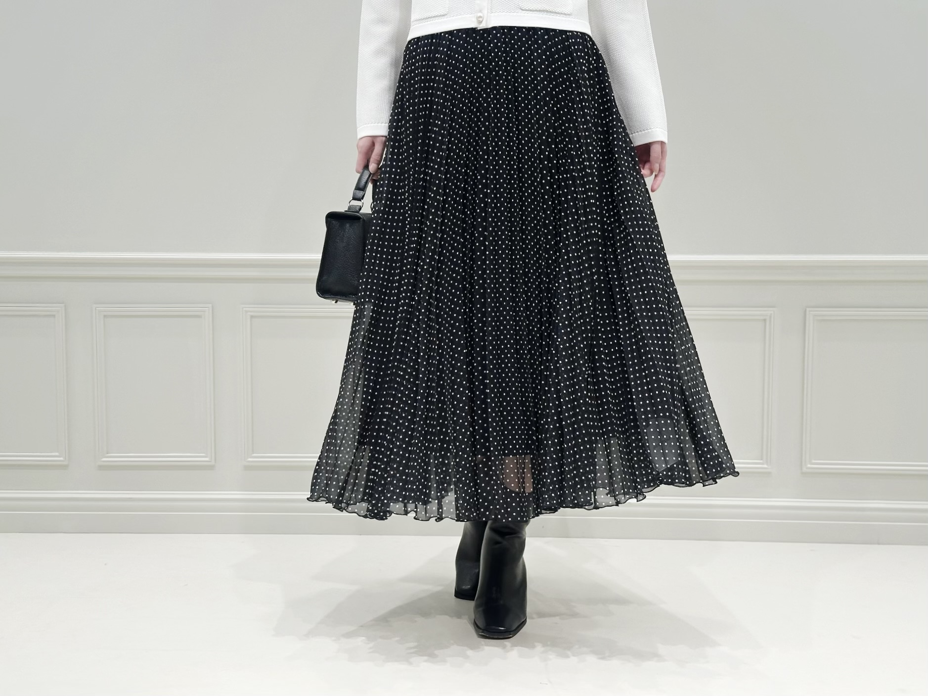 ホワイトのニットカーディガンにドット柄のプリーツスカートを合わせた、きれいめフェミニンなスタイル。足元はあえてショートブーツを合わせることで、全体を引き締めたバランスに仕上げました。