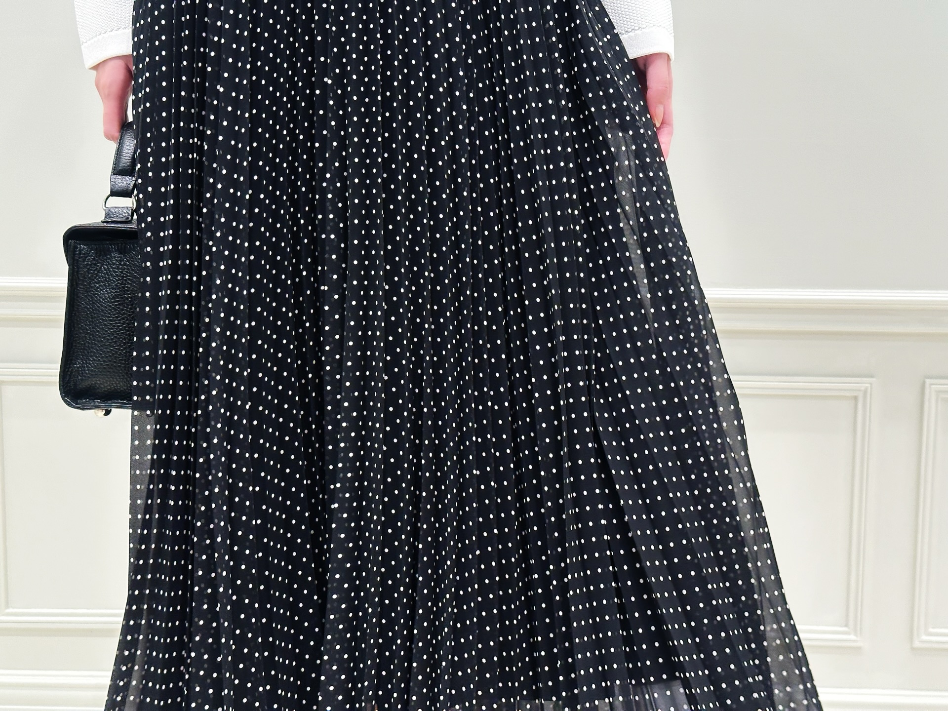シフォン素材の軽やかな揺れ感と、細かく入ったプリーツが歩くたびに表情を生み出してくれます。BLACK地のドット柄ですが、動きのあるシルエットのおかげで、重たく見えないのが魅力。