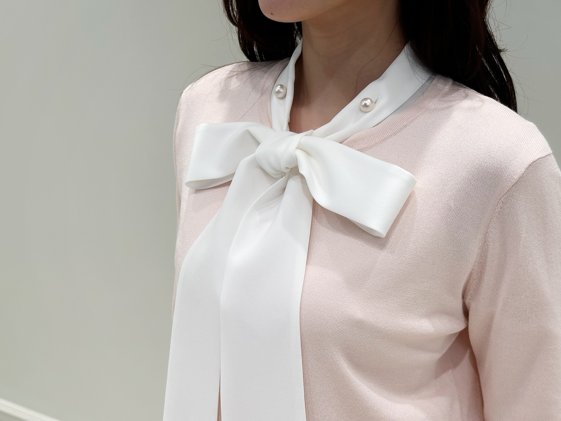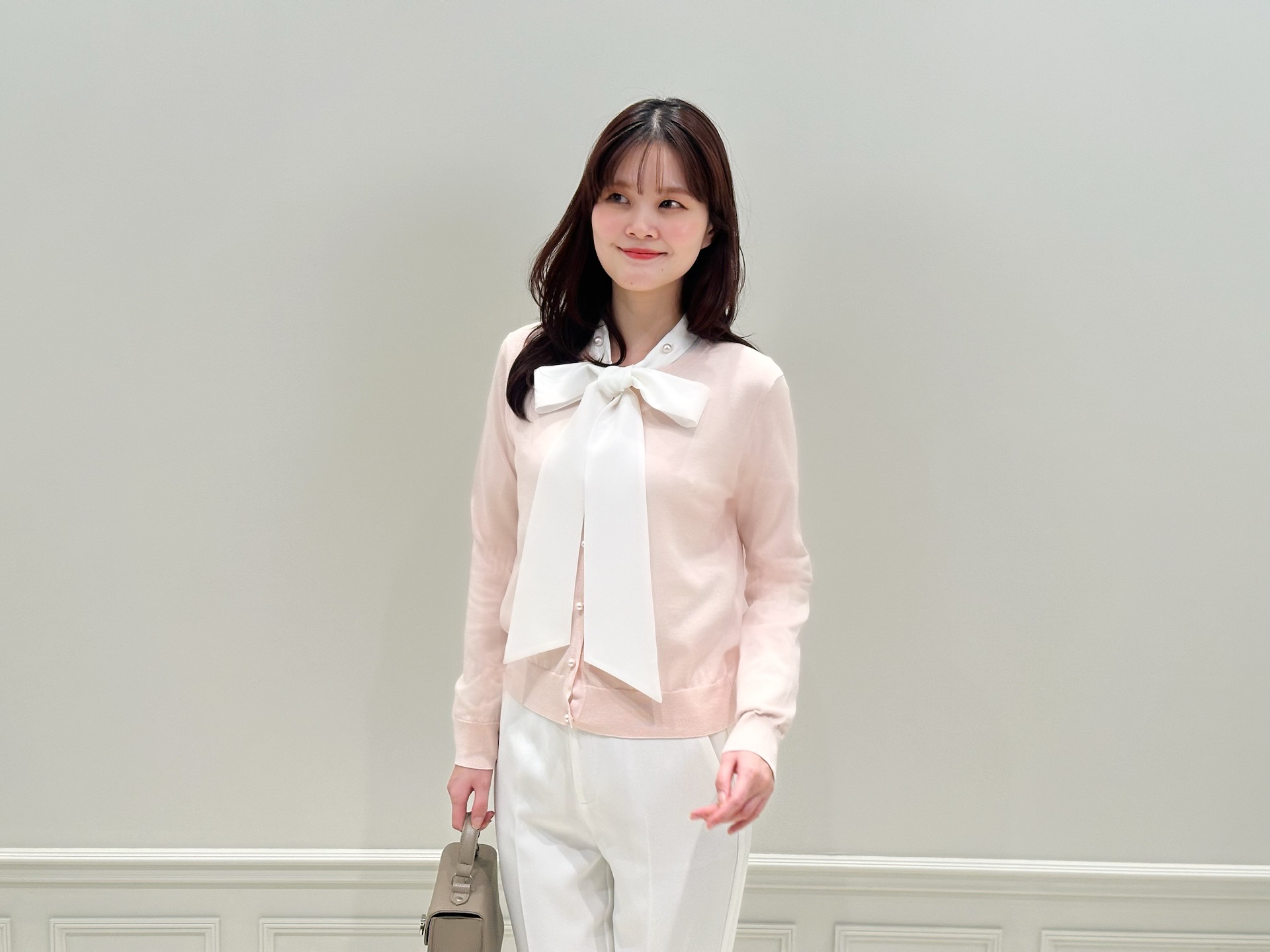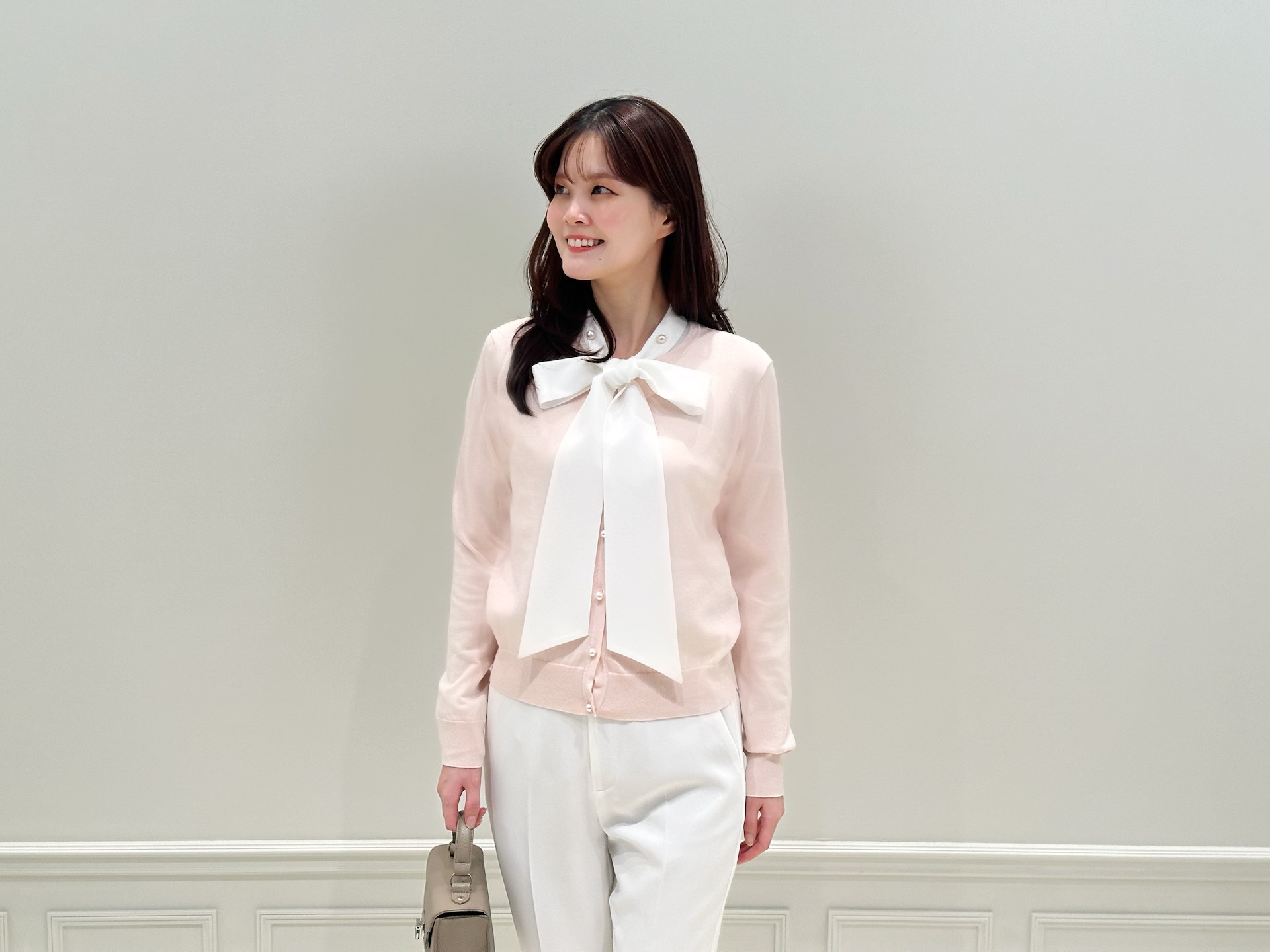 主役はライトピンクのカーディガン!リボンブラウスをレイヤードし、顔まわりに華やぎをプラスしました。大きめのリボンが視線を上へと引き上げ、自然とスタイルアップ。パールディテールが首元にさりげない品を添えてくれます。