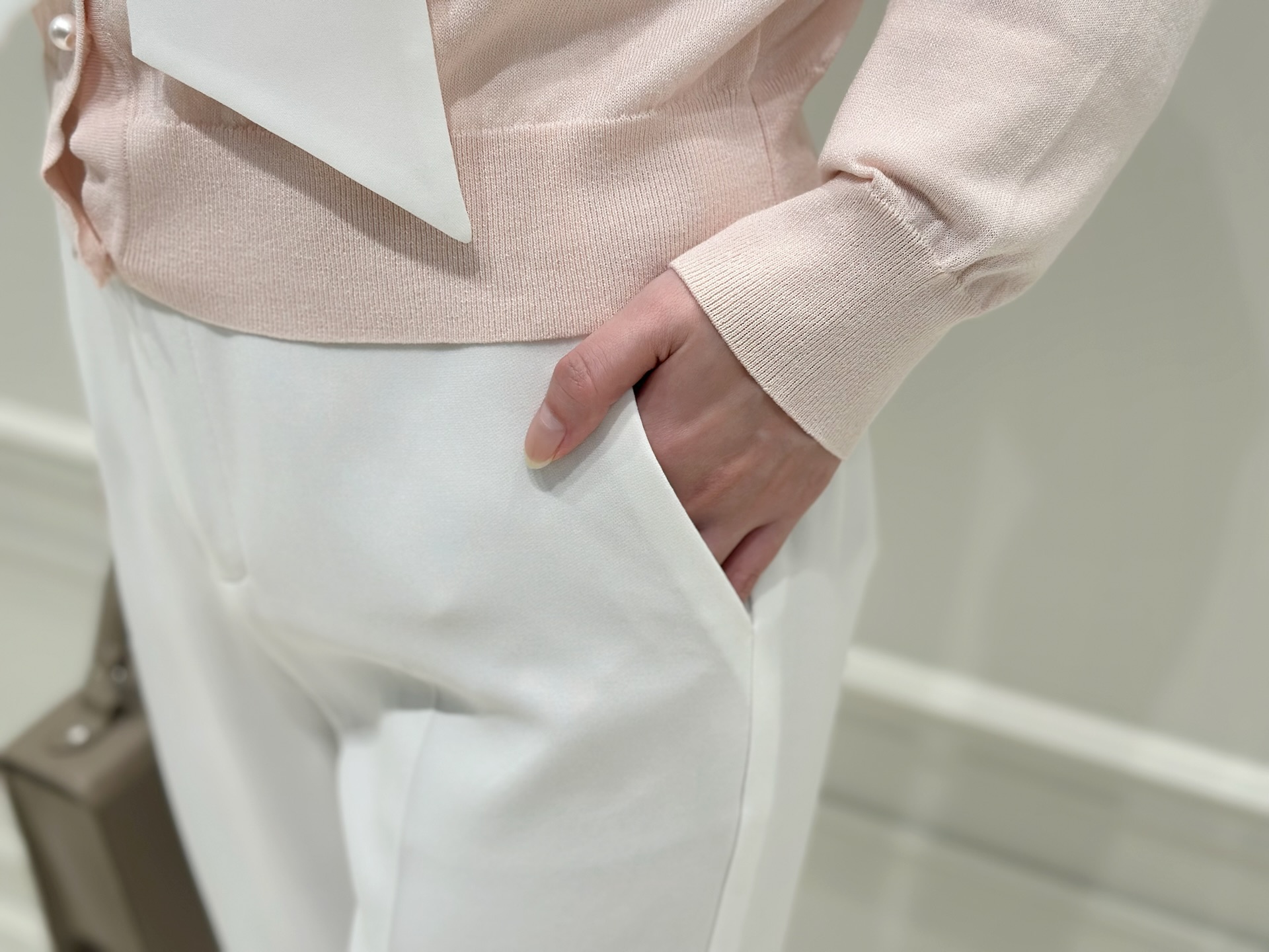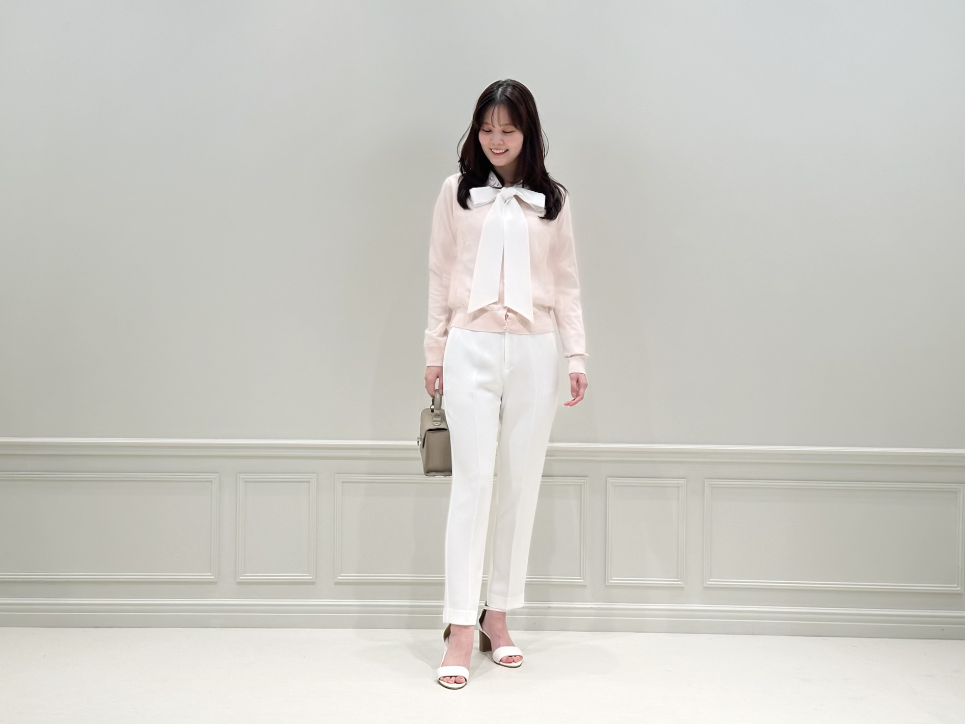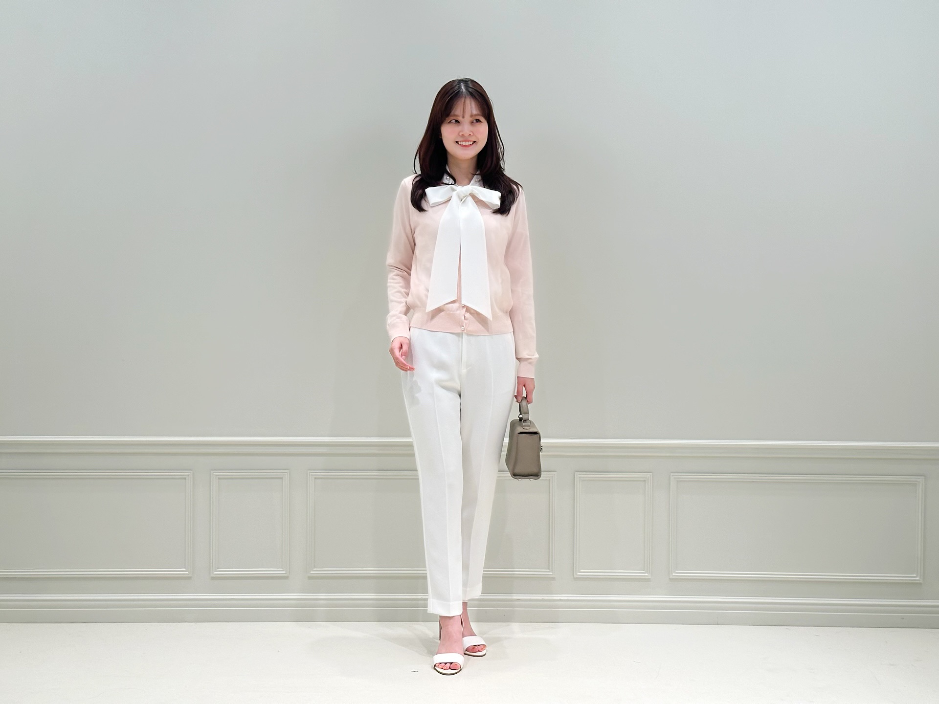 主役はライトピンクのカーディガン!リボンブラウスをレイヤードし、顔まわりに華やぎをプラスしました。大きめのリボンが視線を上へと引き上げ、自然とスタイルアップ。パールディテールが首元にさりげない品を添えてくれます。