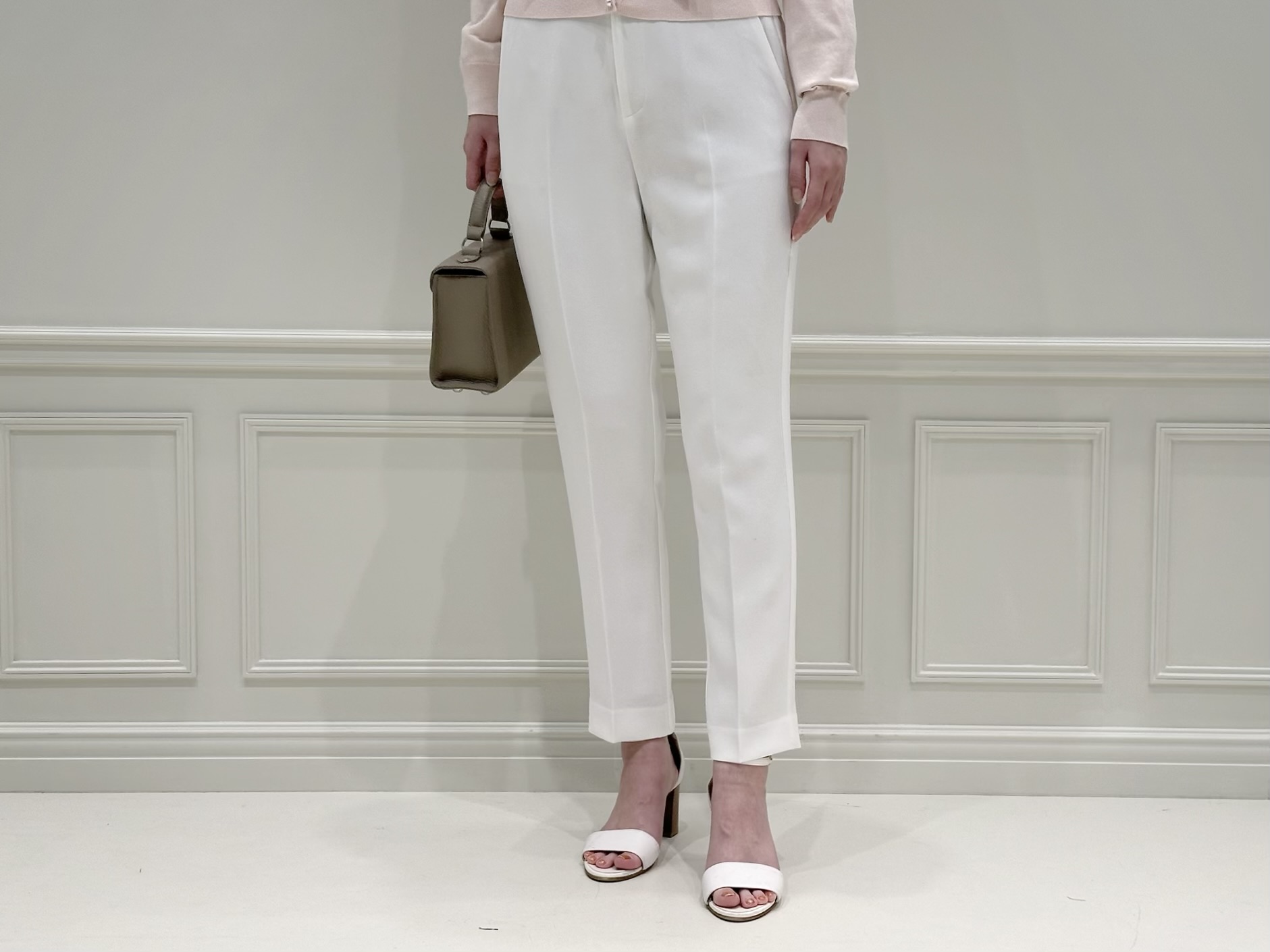 あえて色数は増やさず、ボトムスはブラウスと同色のホワイトパンツをチョイス!ピンク×ホワイトの2色でまとめることで、甘さはありながらもクリーンで洗練された印象に仕上がります。