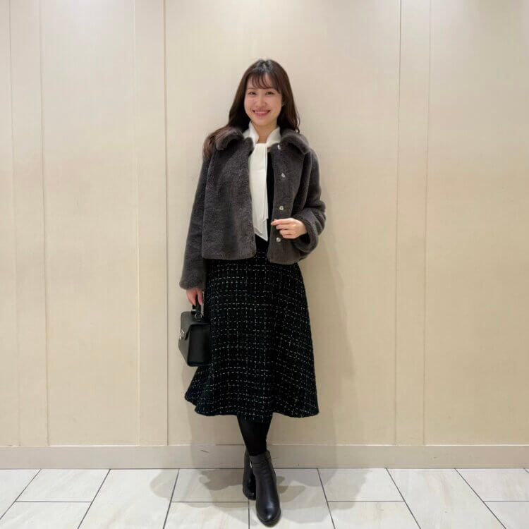 または、カーディガンのベースのカラーのホワイトのスカートを合わせて統一感のあるスタイルはいかがでしょうか?