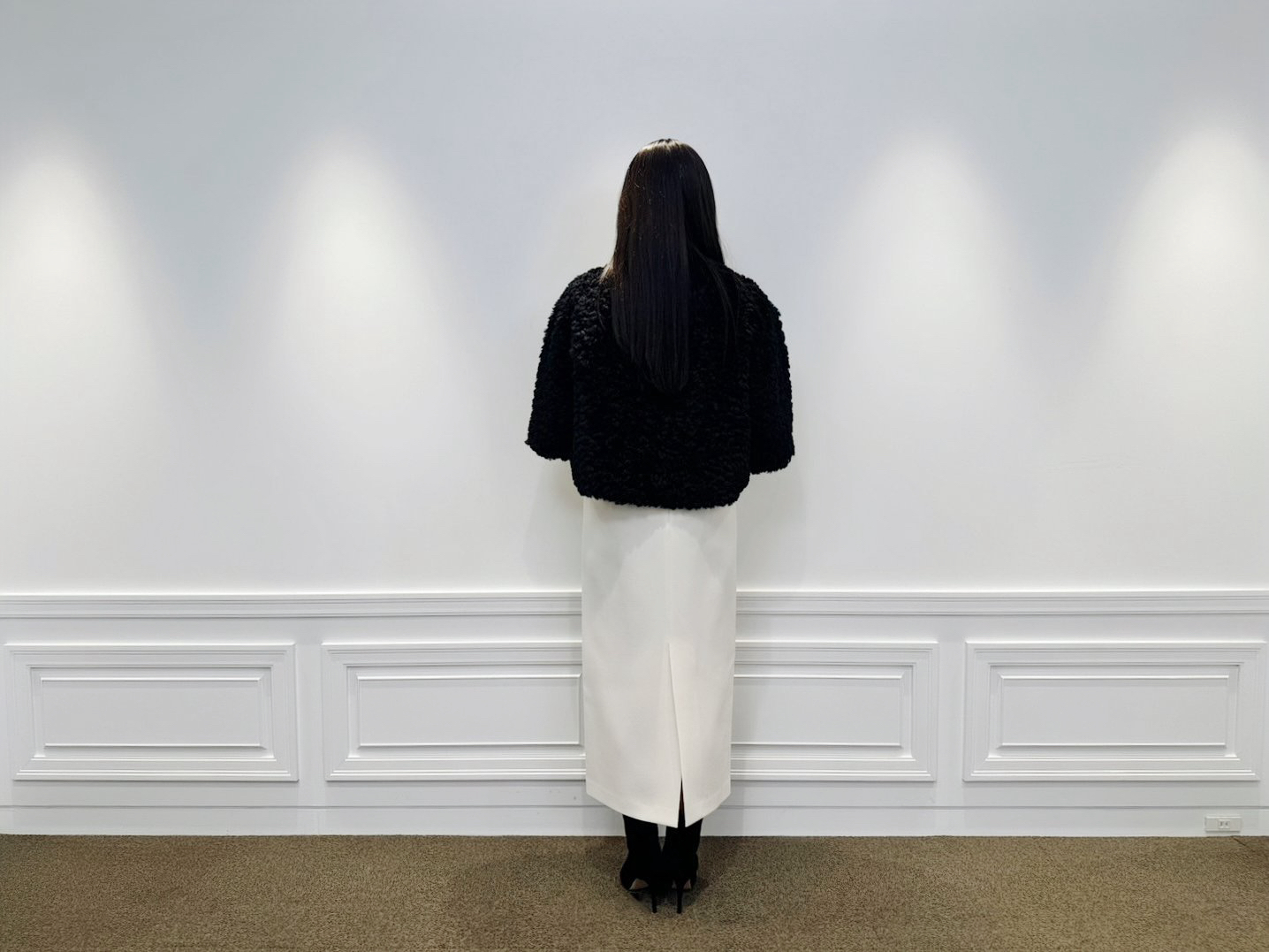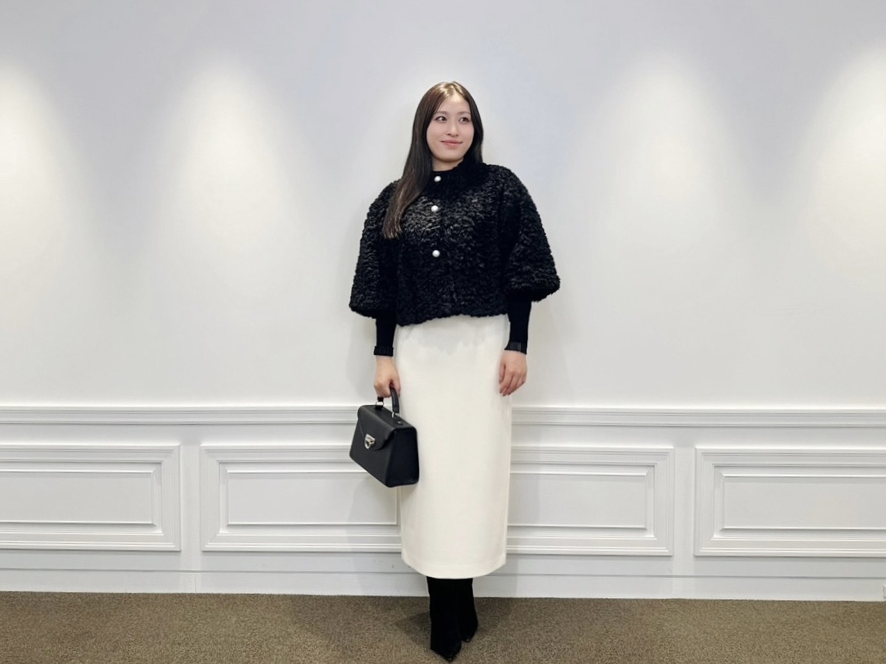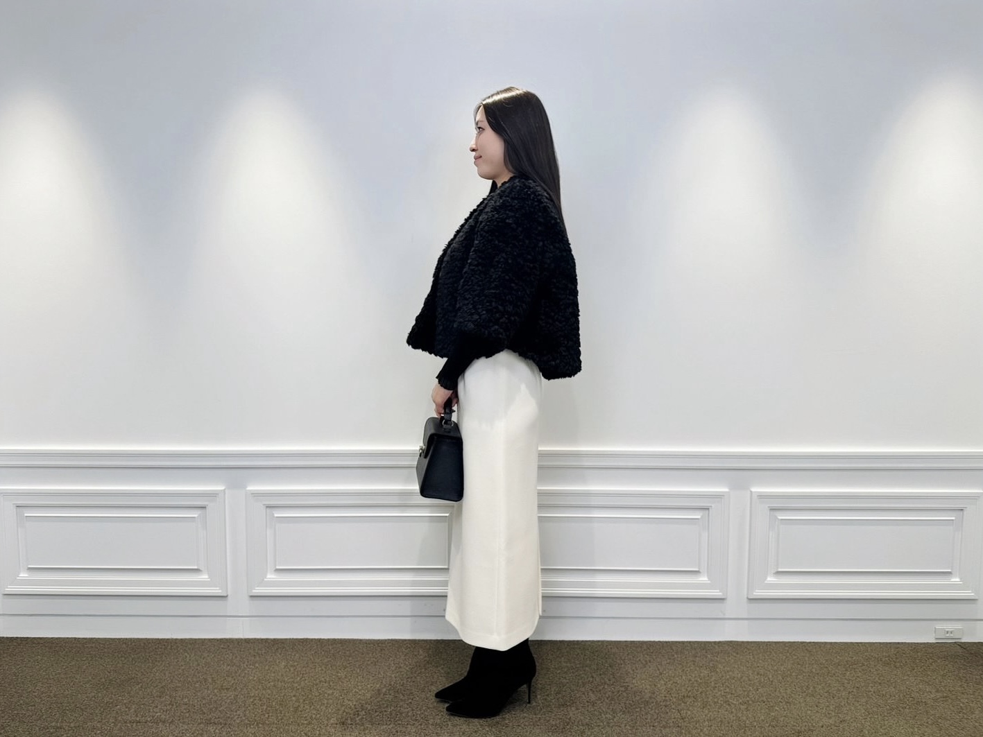 今、大人気のふわふわショートコート。今回はタイトスカートと合わせて、シャープな印象になる着こなしをご紹介いたします。