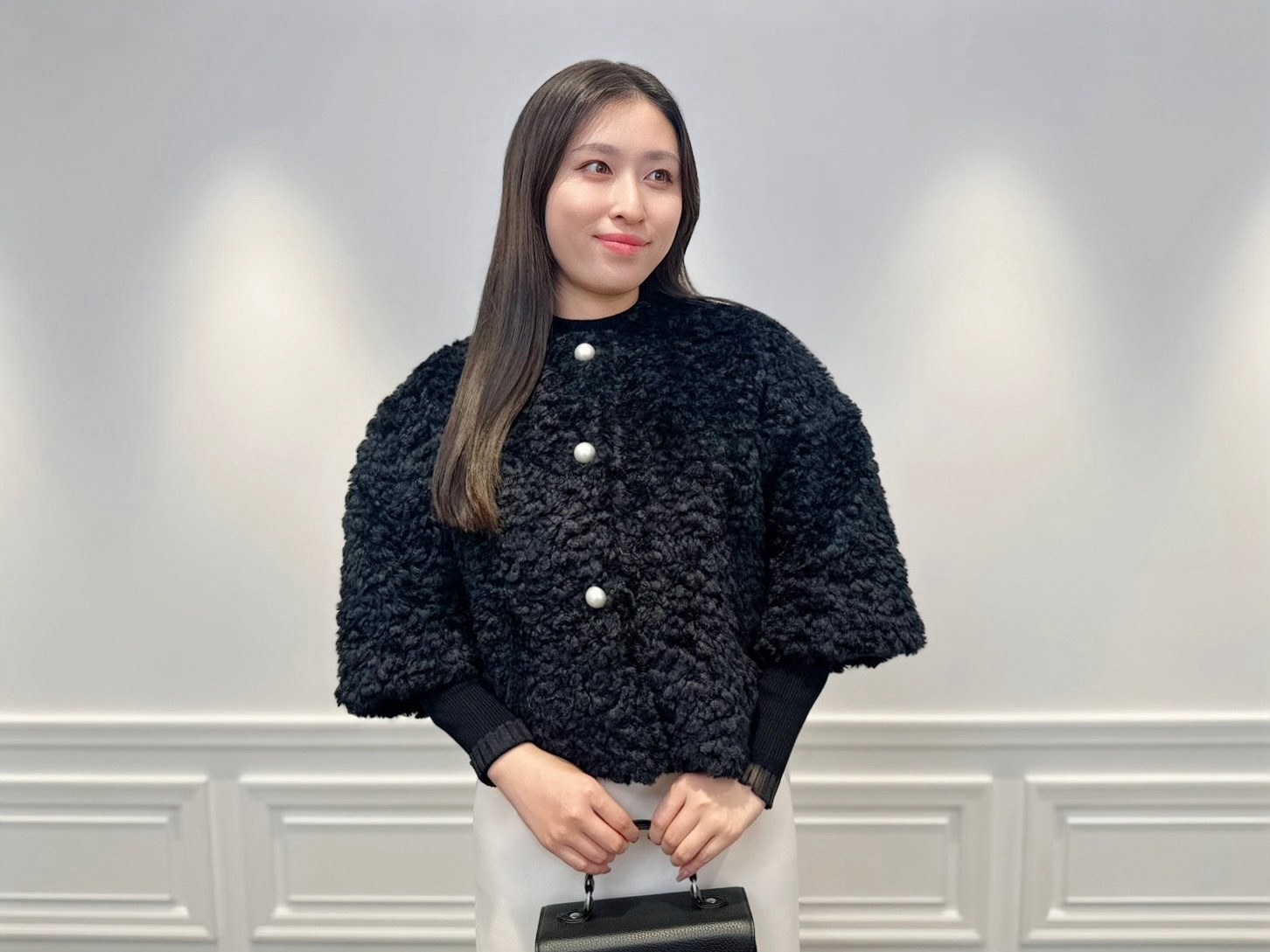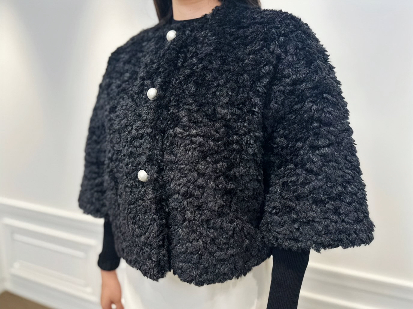 上品な光沢と立体感のあるカールファー素材が印象的なショートコート。