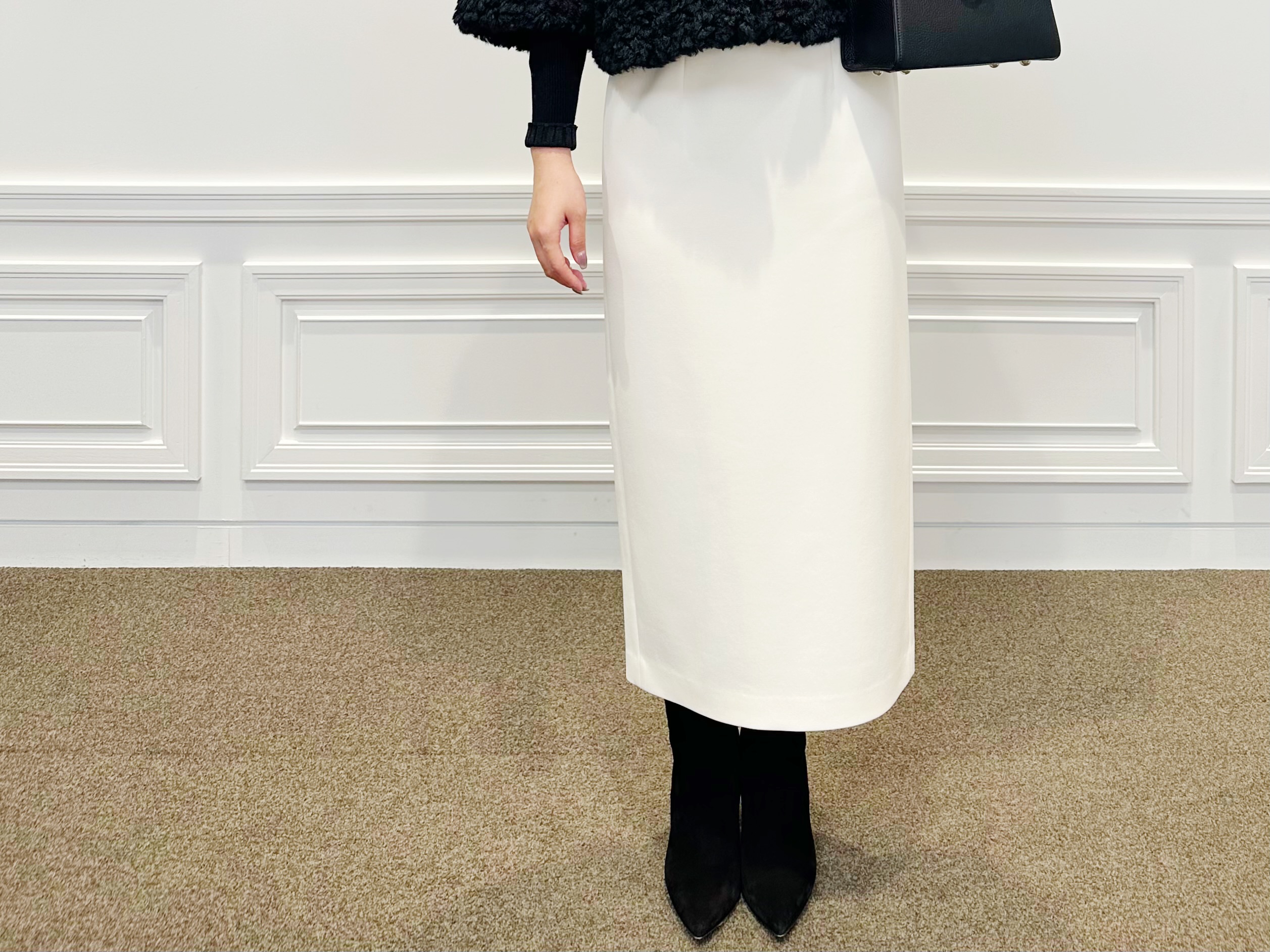 程よいハリとしなやかさを併せ持つダブルクロス素材を用いたこのタイトスカートは、すっきりとしたシルエットで女性らしいラインを美しく演出します。バックにはベント(裾の切り替え)を設け、歩きやすさとエレガンスを両立。上記ニットと合わせることで、トップスの華やぎとスカートのシンプル&上質感が互いに引き立て合い、「丁寧に作られた装い」というムードが強まります。