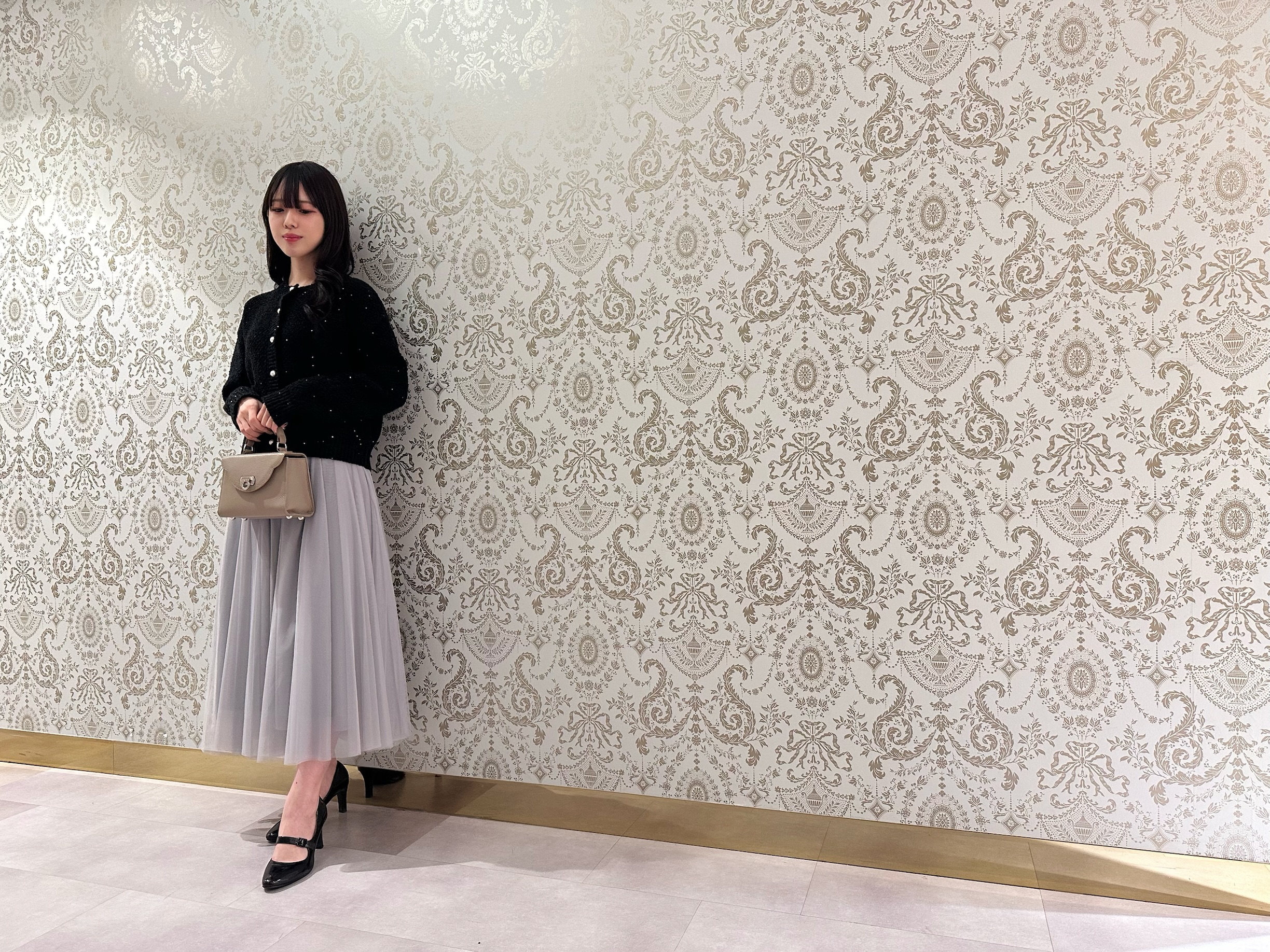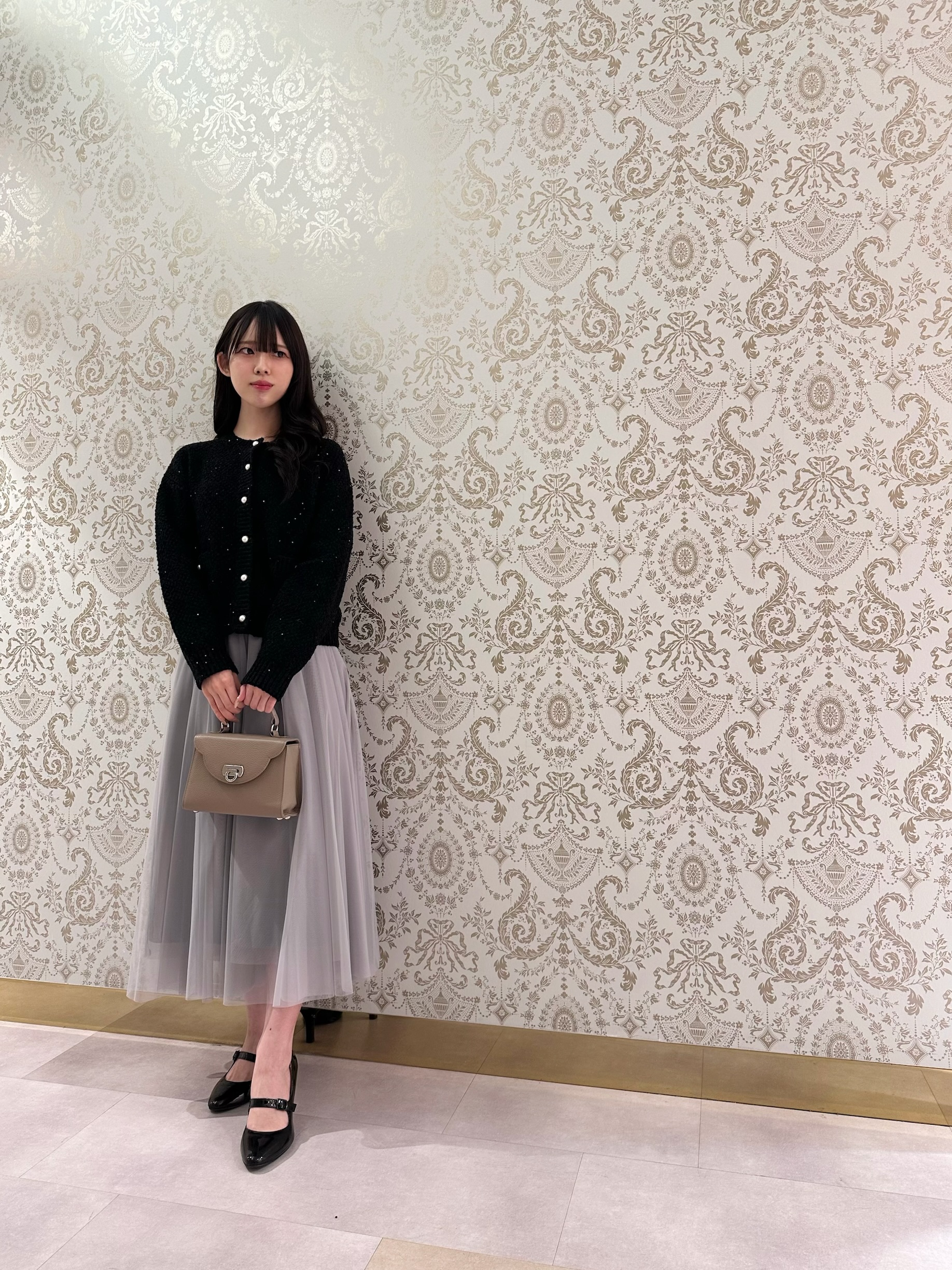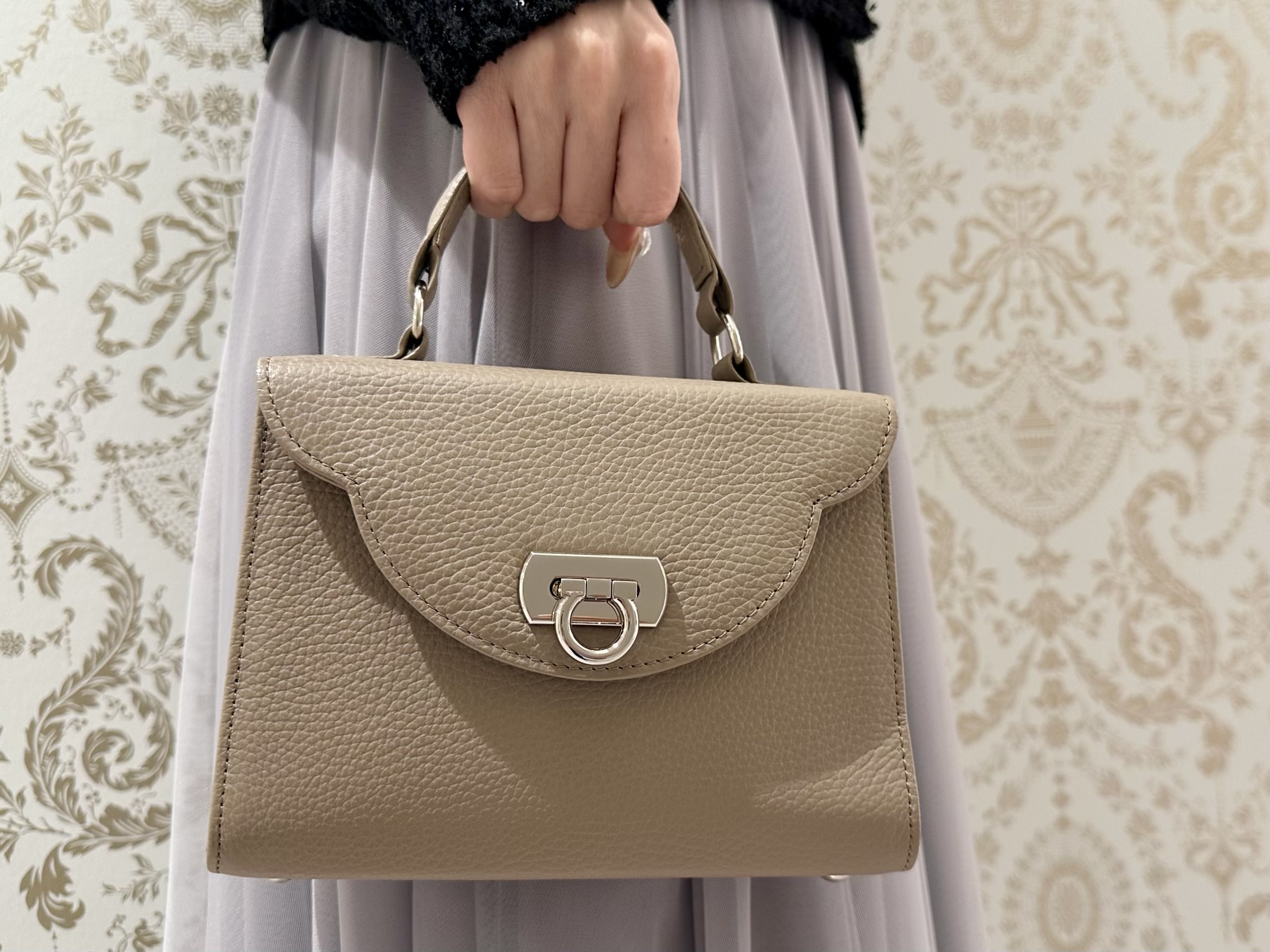 柔らかなグレーのお色味が、コーディネートをより華やかに導きます。女子会やパーティーシーンにもぴったりです。