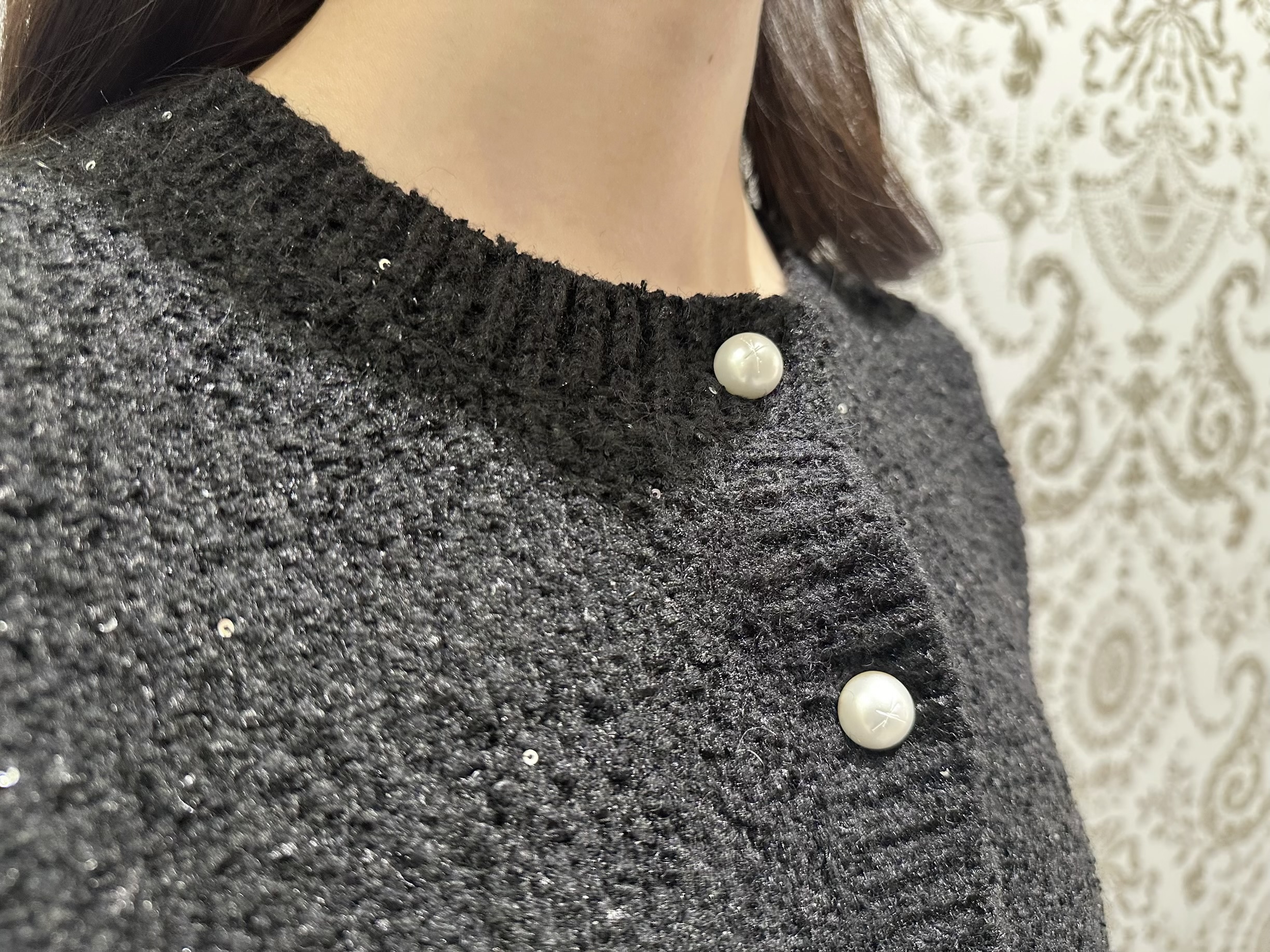スパンコールが全面に散りばめられたニットジャケット。