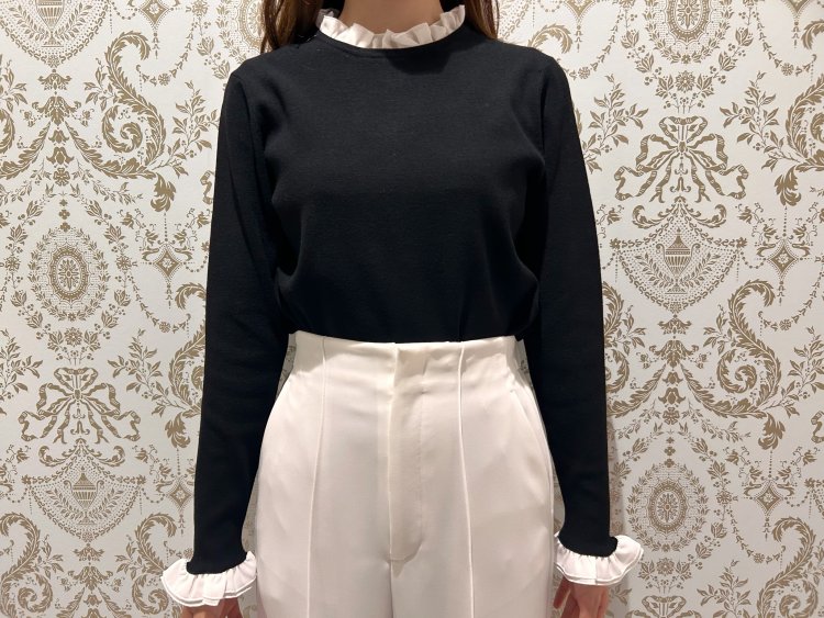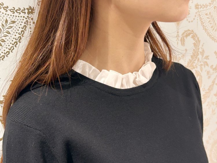 インナーには襟元と袖口にシフォンフリルの施されたニットプルオーバーを合わせて。