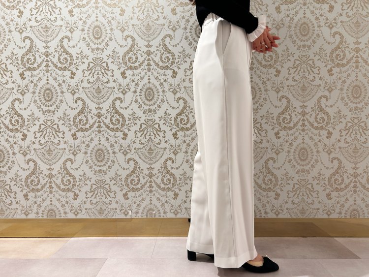 ボトムにはホワイトのワイドパンツで洗練された大人の女性らしいスタイルに。