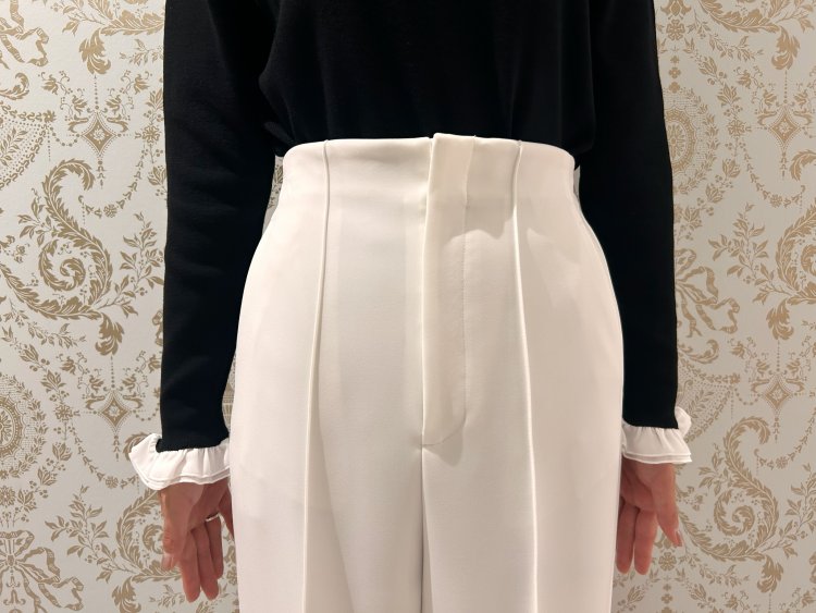 トップスのフリルとリンクさせホワイトのボトムを選ぶことで、まとまり感のあるコーディネートに仕上がります。