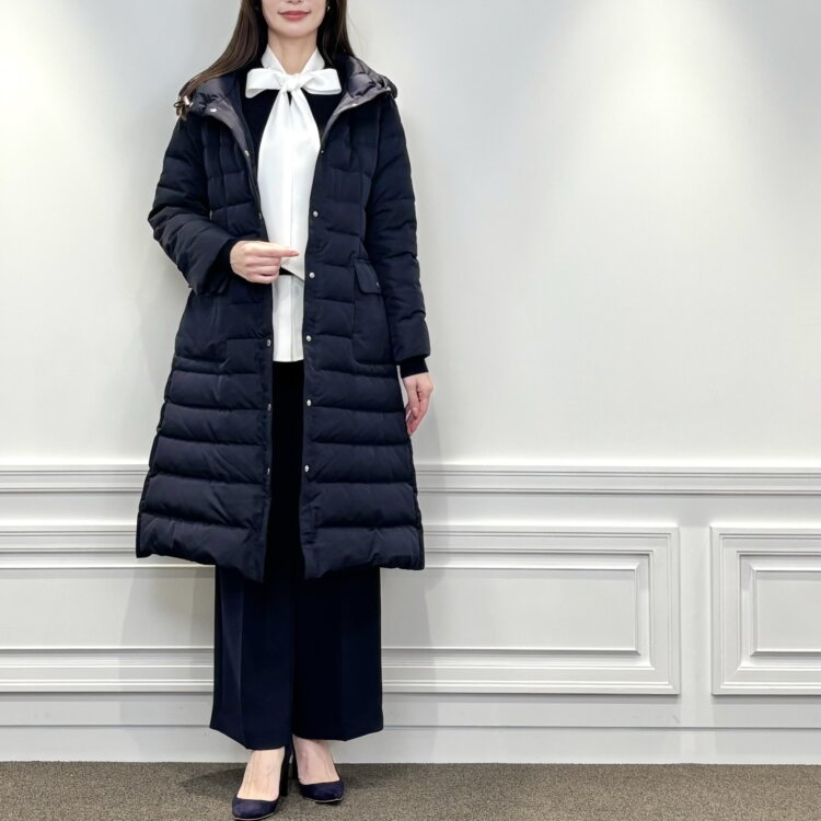 ①上質な素材とシャツカラーによって、1枚で品格ある洗練された印象に