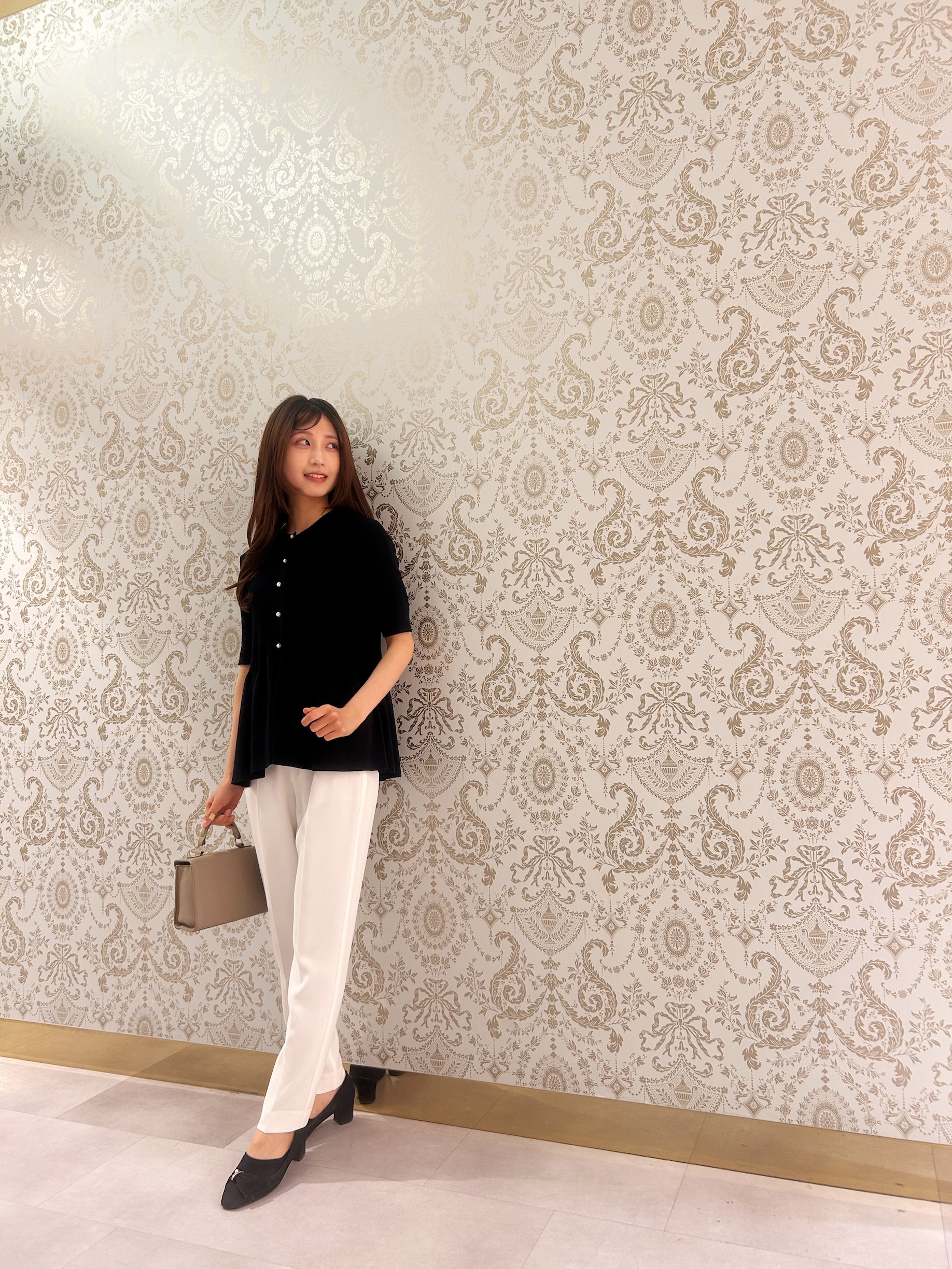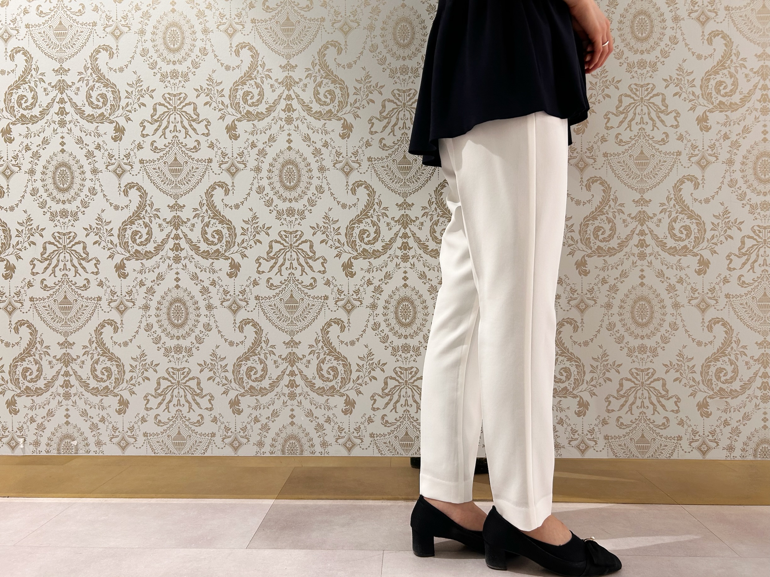ボトムには、ホワイトのセンタープレス入りテーパードパンツを合わせて。縦のラインを強調するデザインがすっきりとした印象を与え、脚のラインを拾いすぎず自然にカバーしてくれます。クリーンなホワイトが全体に軽やかな抜け感をプラスし、ネイビーとのコントラストが洗練された雰囲気を演出。