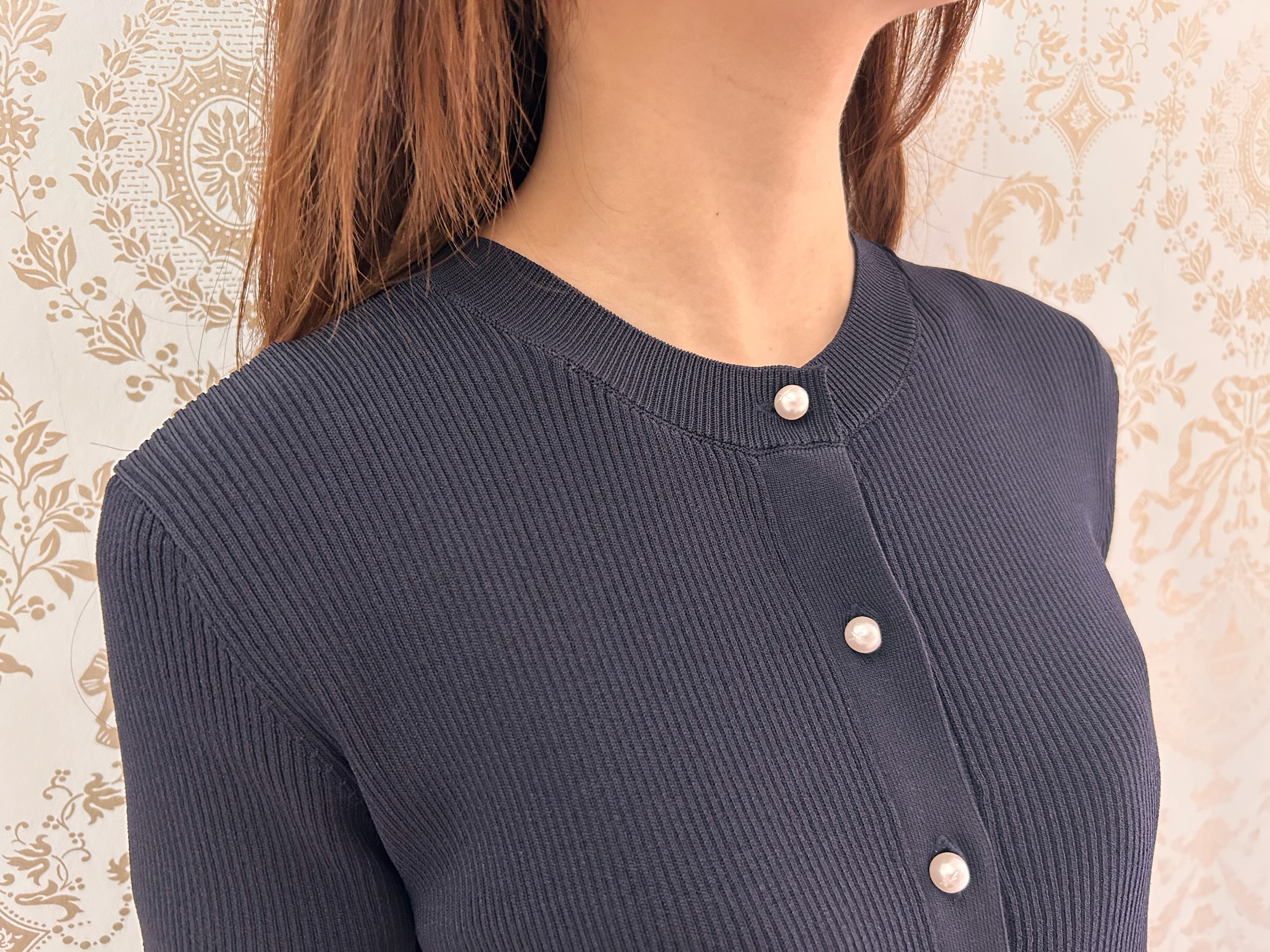 フロントにあしらわれたパールボタンにはさりげなくブランドロゴが刻まれ、細部までこだわりを感じる仕上がりに。