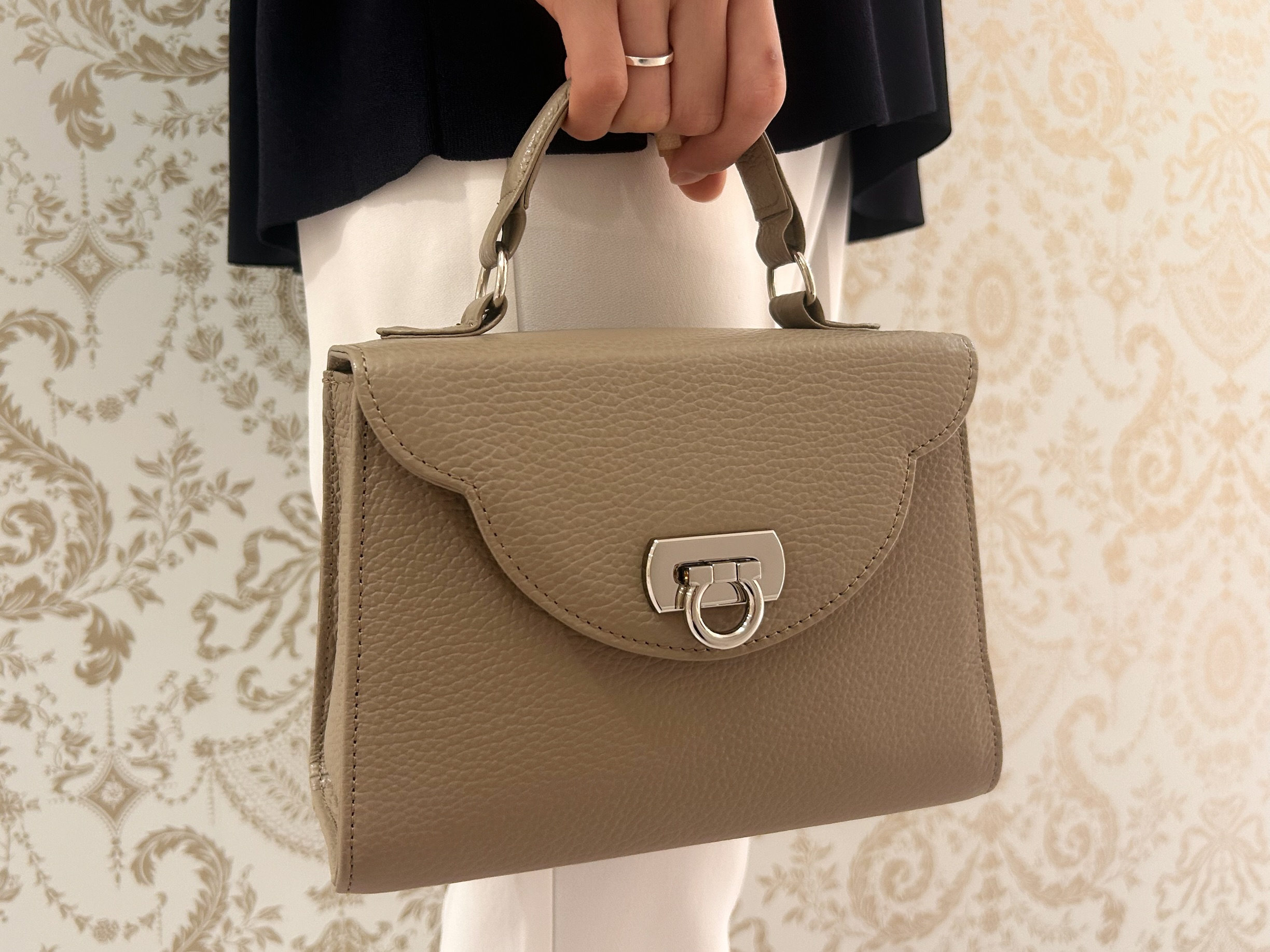 仕上げには、ベージュのレザーバッグを。シルバーの金具がさりげないアクセントとなり、小ぶりなサイズ感が上品なバランスを保ってくれます。