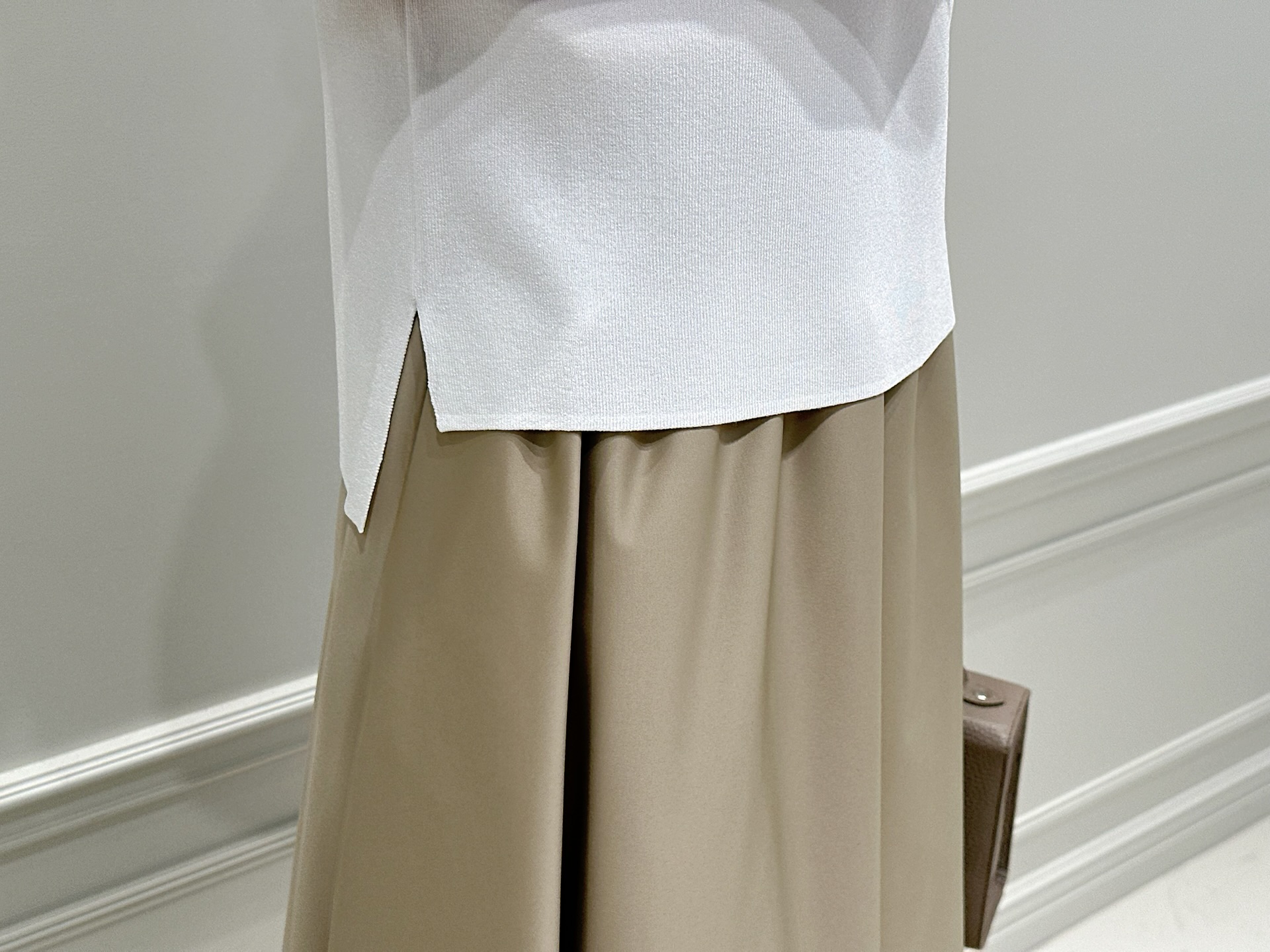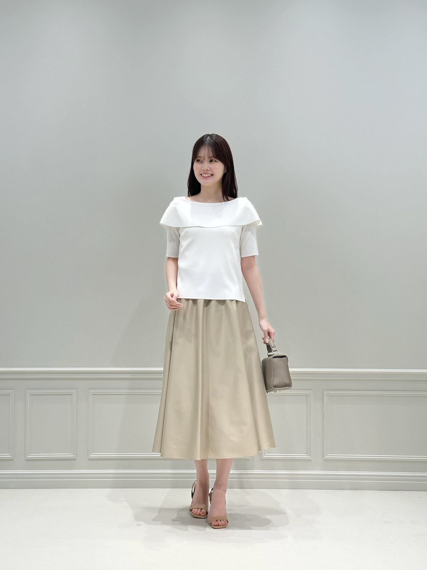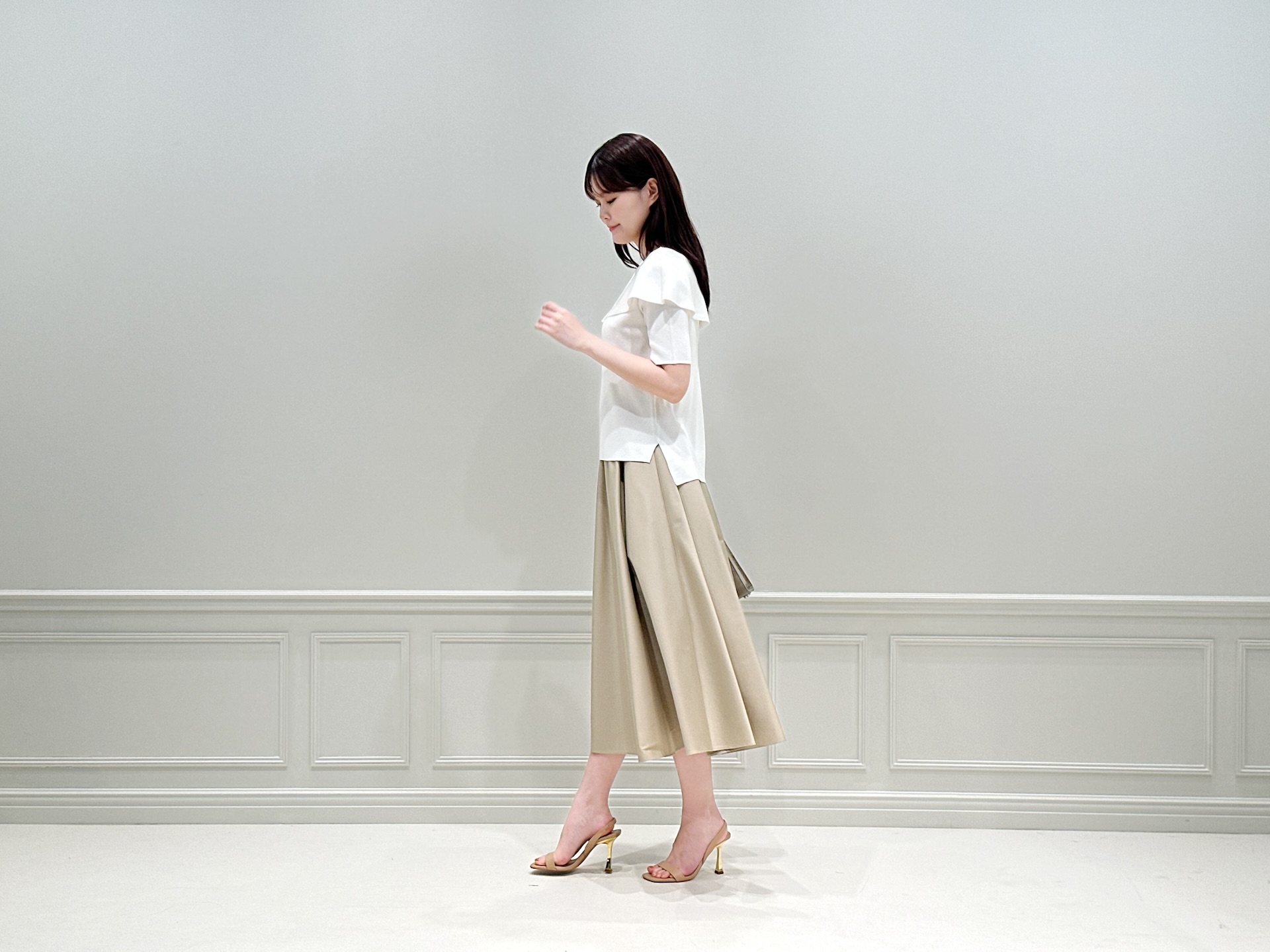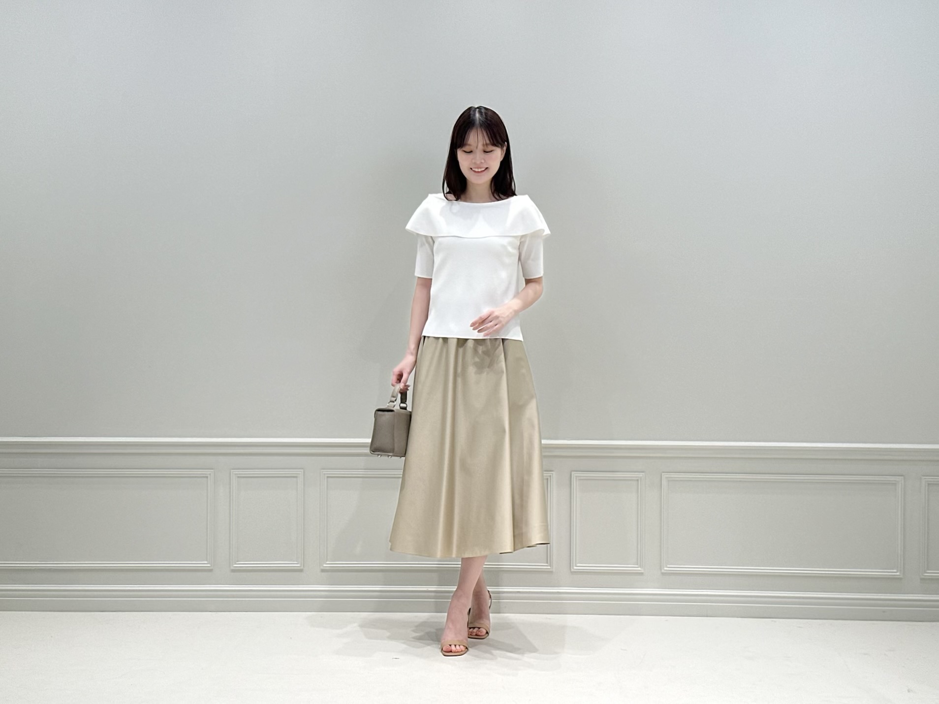 コンパクトなトップスとボリュームのあるボトムの組み合わせは、スタイルアップ効果もあり、自然と美しいシルエットに。ホワイト×ベージュの柔らかな配色が、春らしい軽やかさと上品さを演出してくれます。