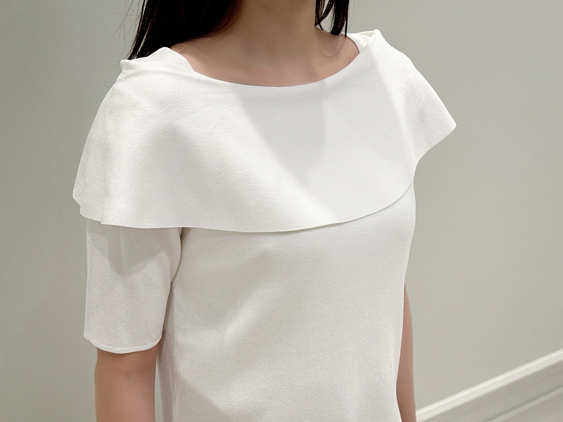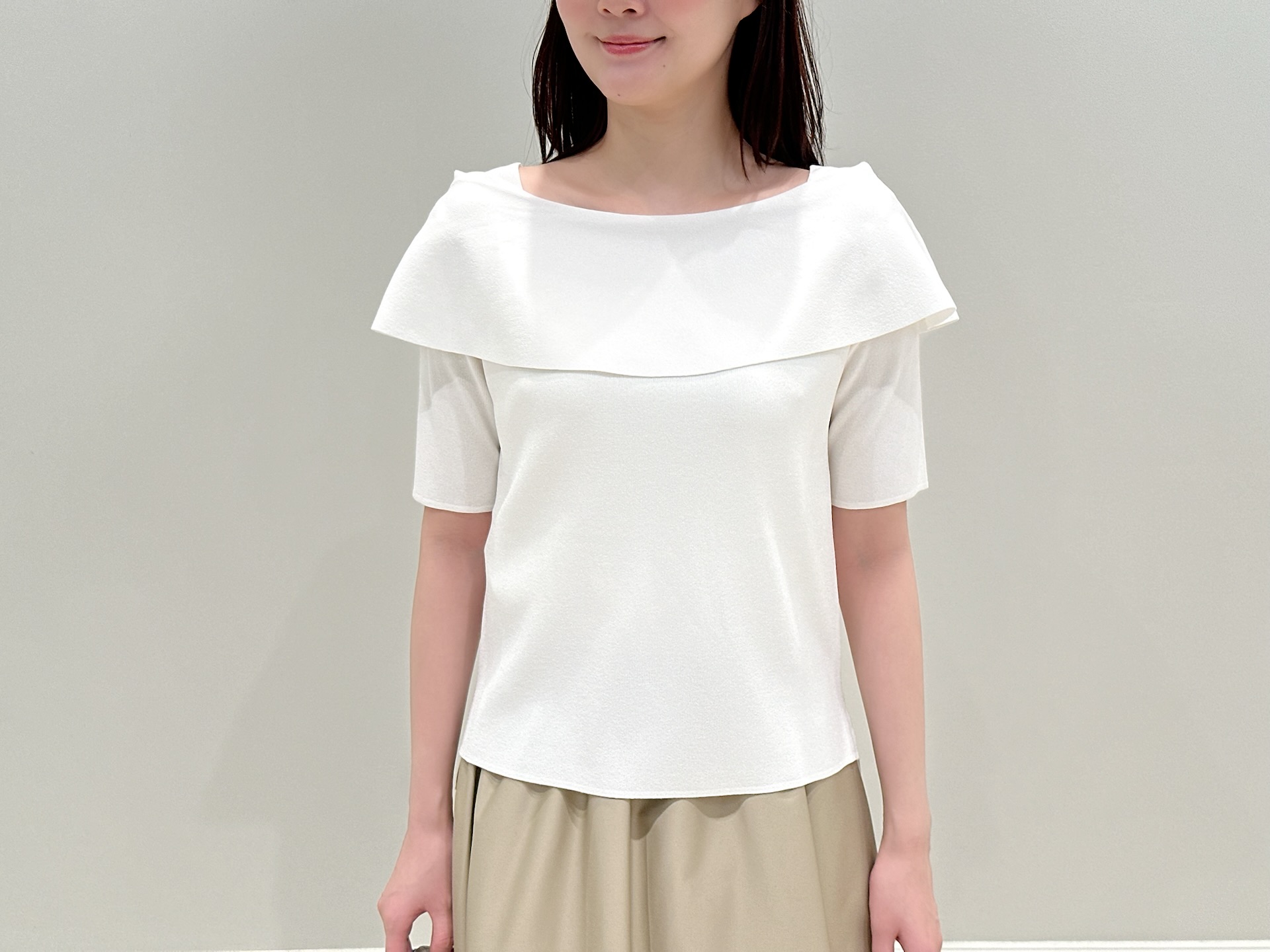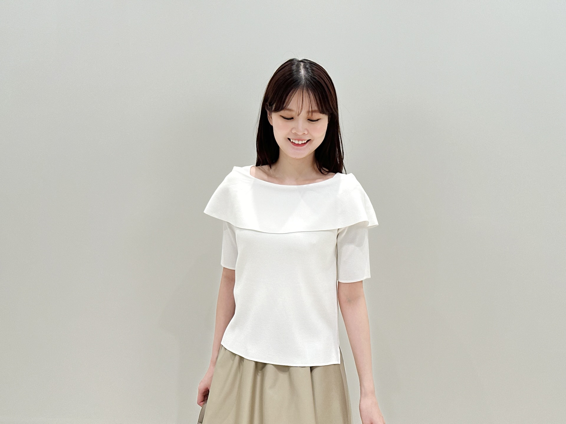 オフショルダーデザインでありながら、肩部分は生地が重なった仕様になっているため、肌の露出を抑えつつ、さりげない抜け感をプラス。デコルテラインを自然に美しく見せてくれるので、女性らしさたっぷりな大人にぴったりな一枚です!