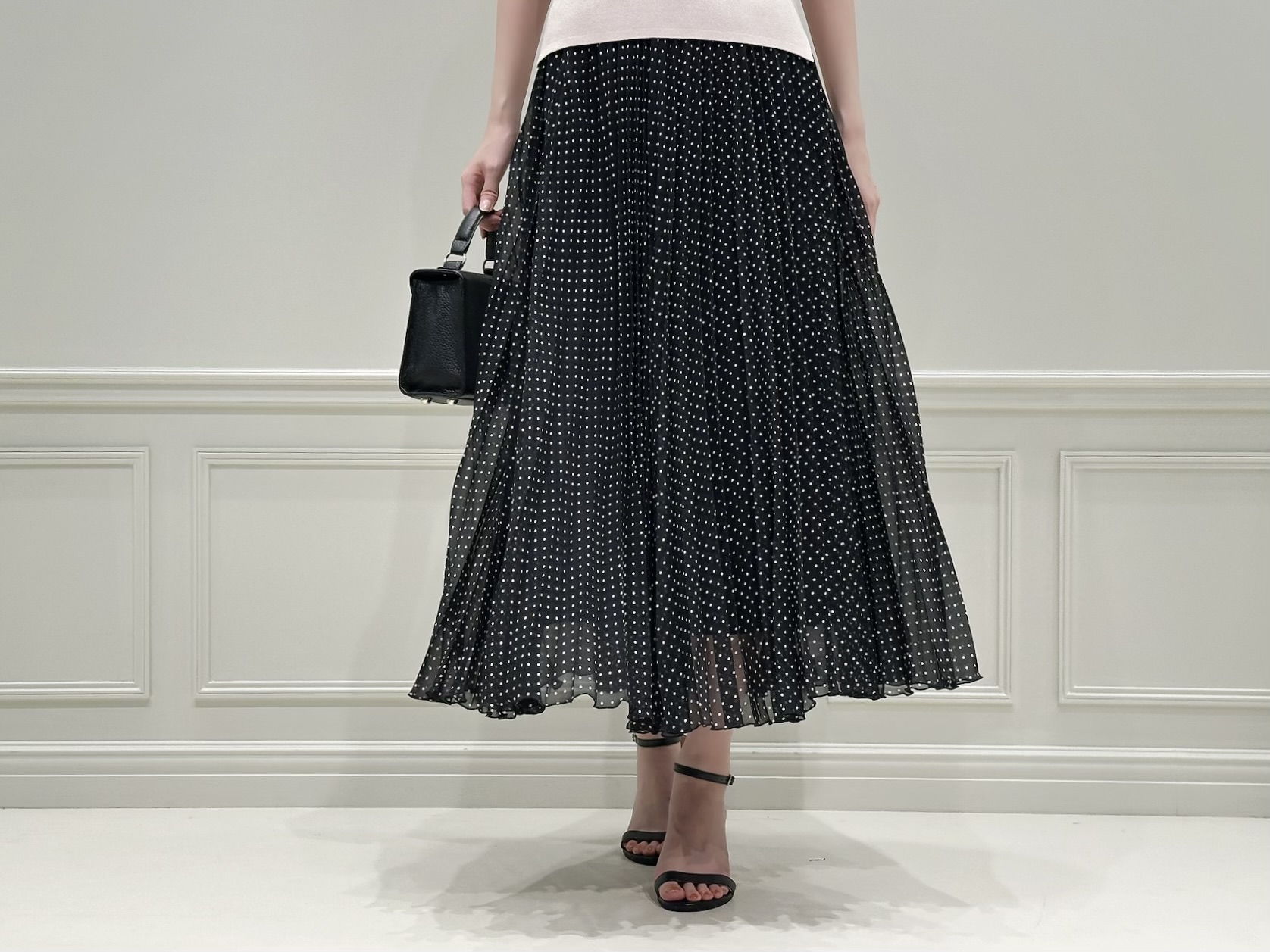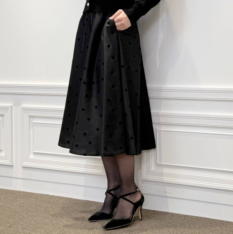 合わせたのは、細かなドットが散りばめられた軽やかなプリーツスカート。動くたびにふんわりと揺れるシルエットがとても綺麗で、ブラックでも重たく見えないのが魅力です。