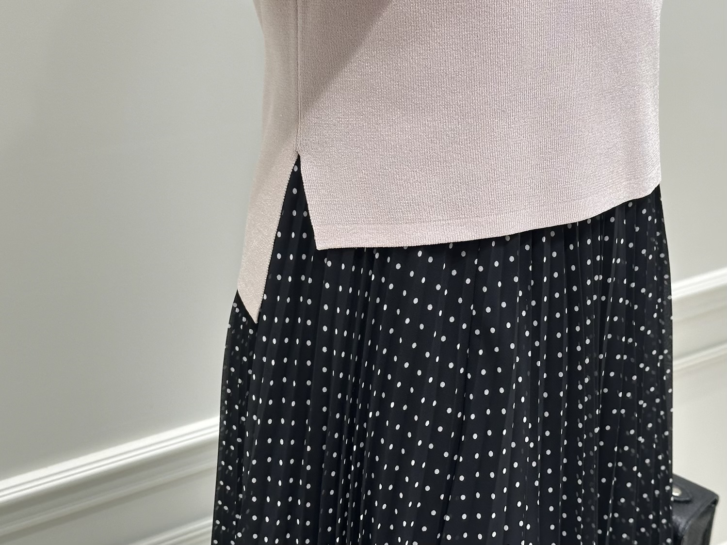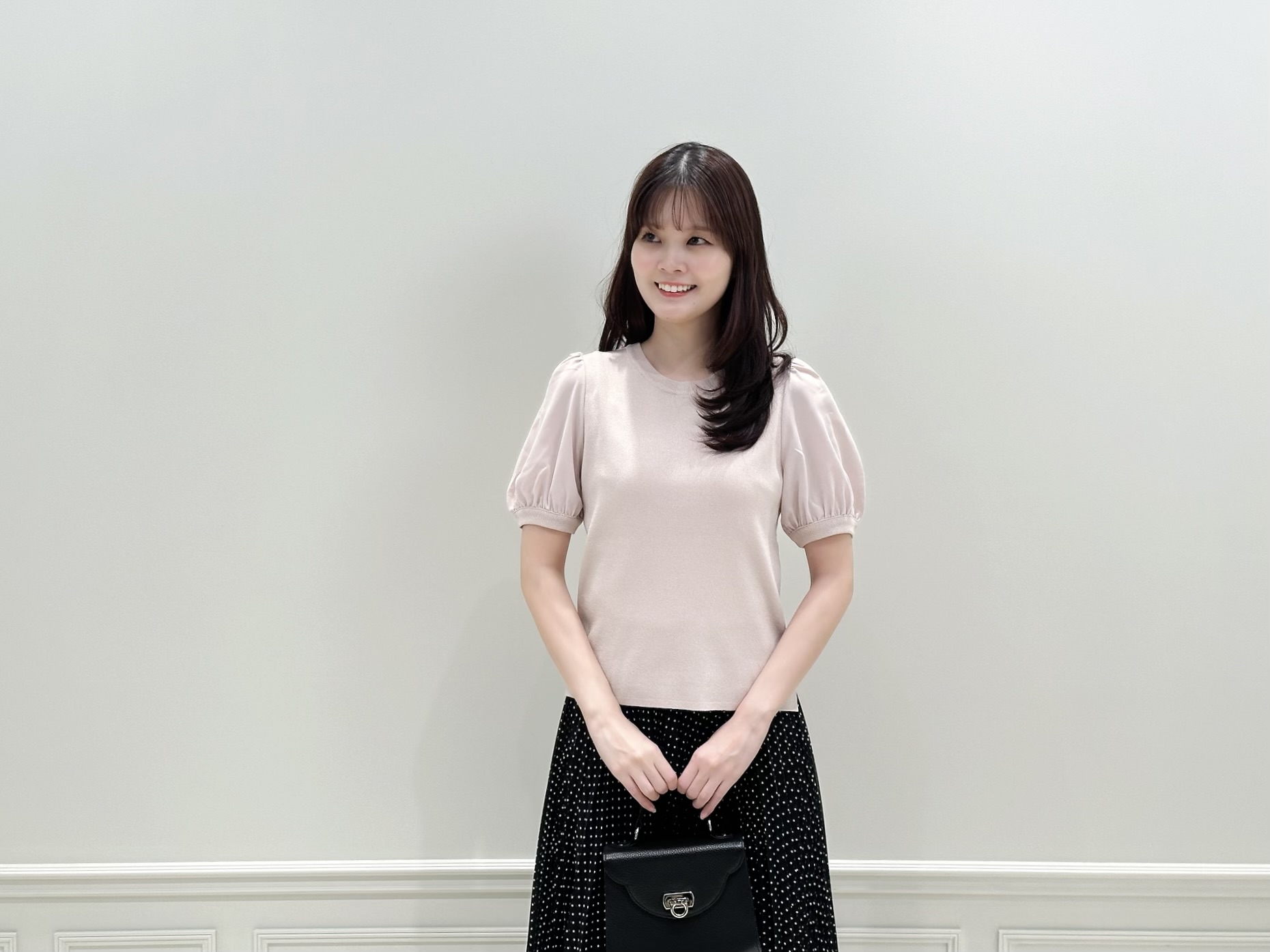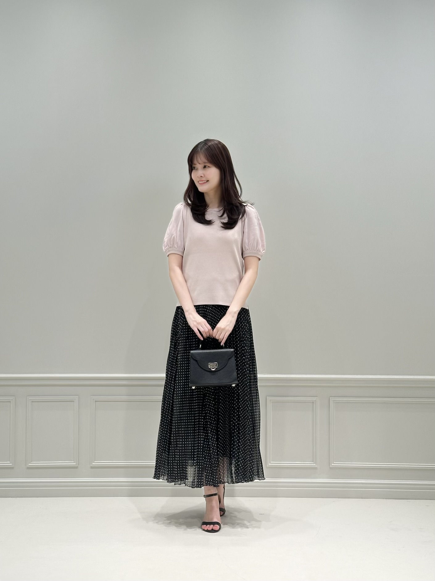 トップスの柔らかなカラーを引き立てるため、ボトムは細かなドット柄のスカートを合わせて、主張しすぎない上品なアクセントをプラス。靴とバッグはスカートと同じブラックでまとめることで、コーディネート全体がきゅっと引き締まり、トップスのアイスピンクがより際立つよう意識しました。