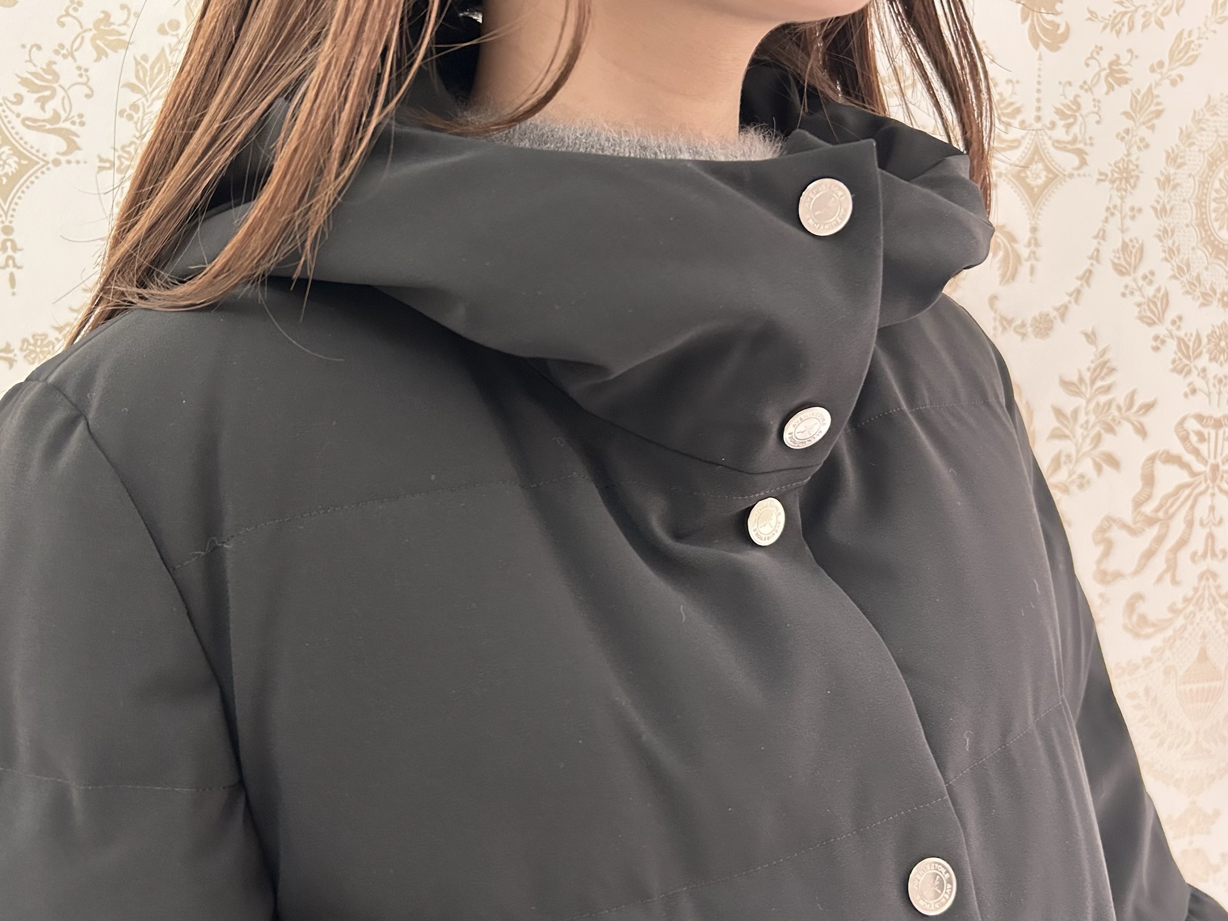 首元までしっかり包み込むフロントデザインは、防寒性と上品さを兼ね備えたポイント。