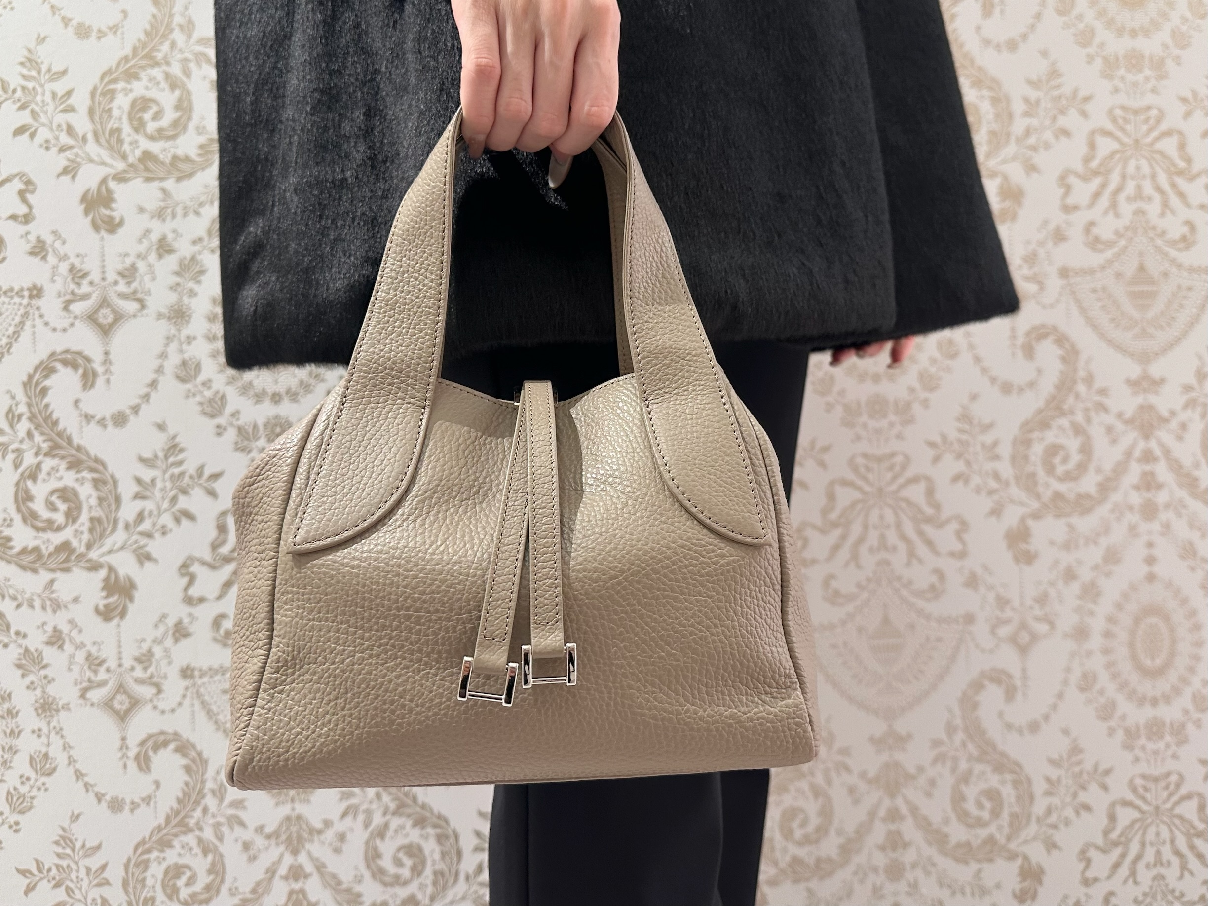 クラシックな雰囲気を纏うカウレザーを使用したバッグをチョイス。