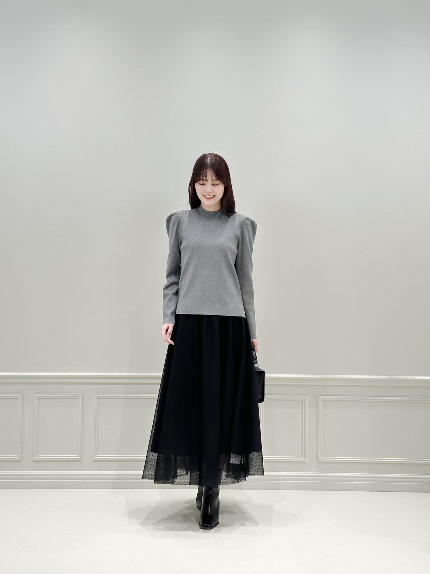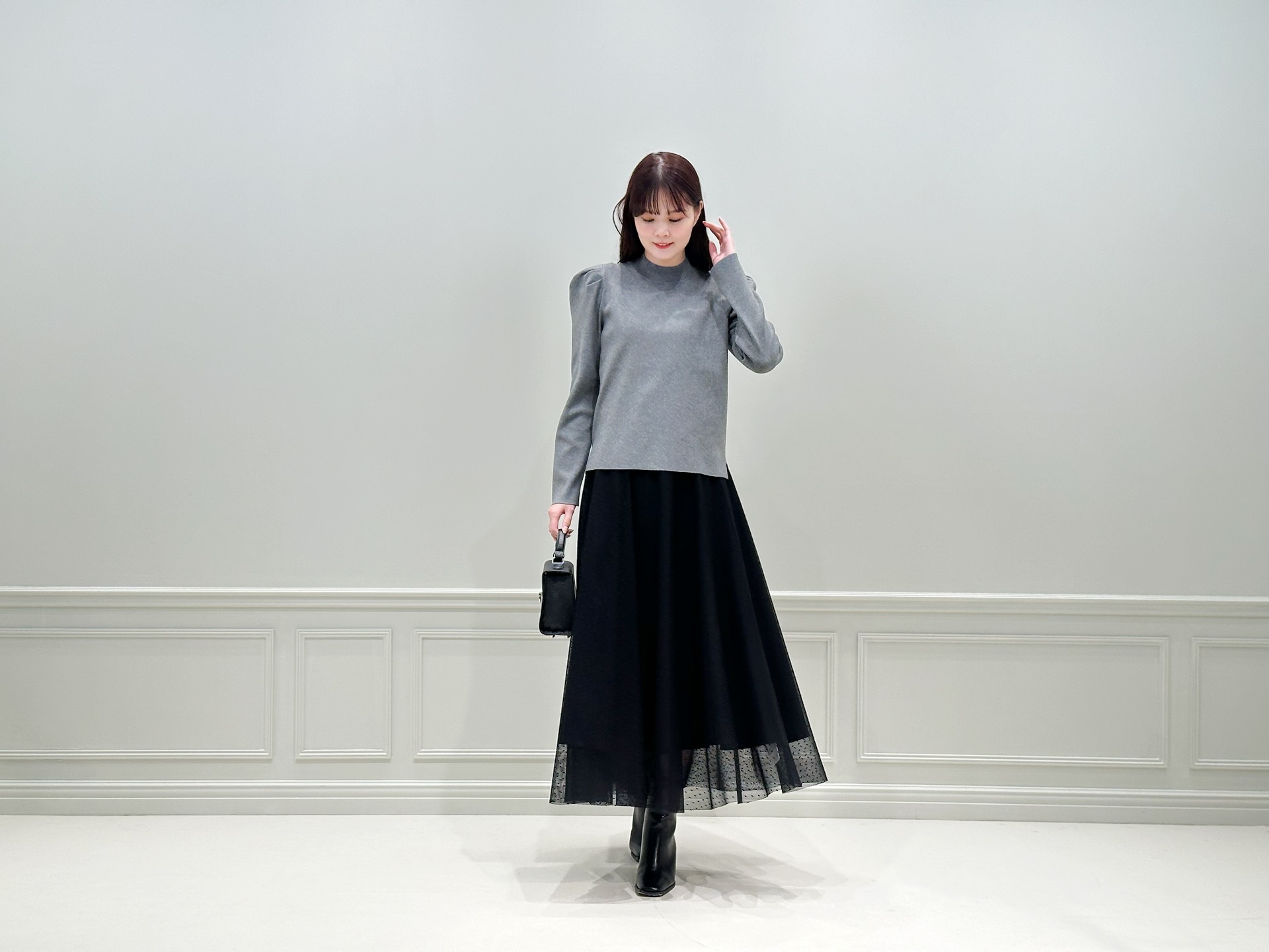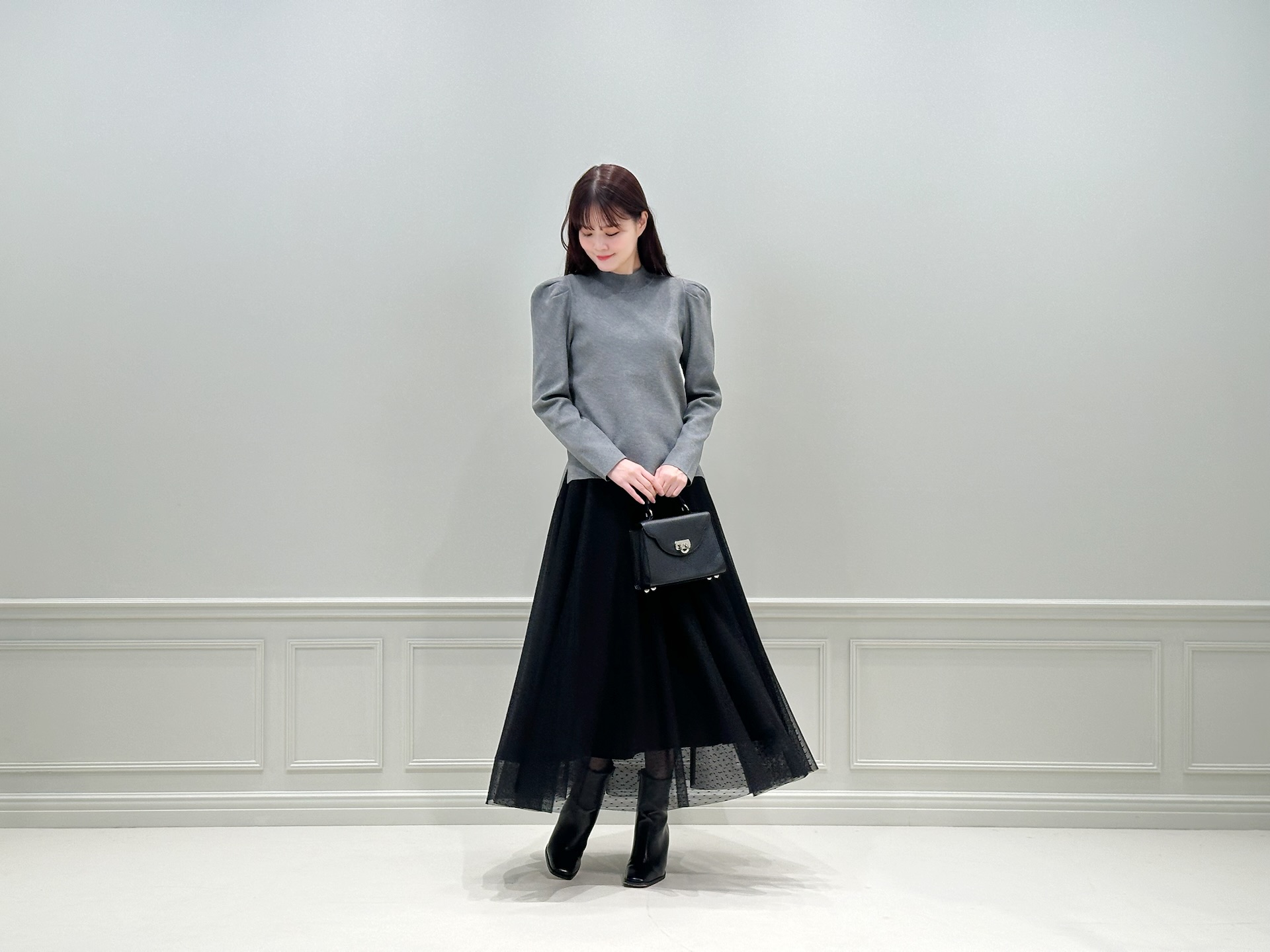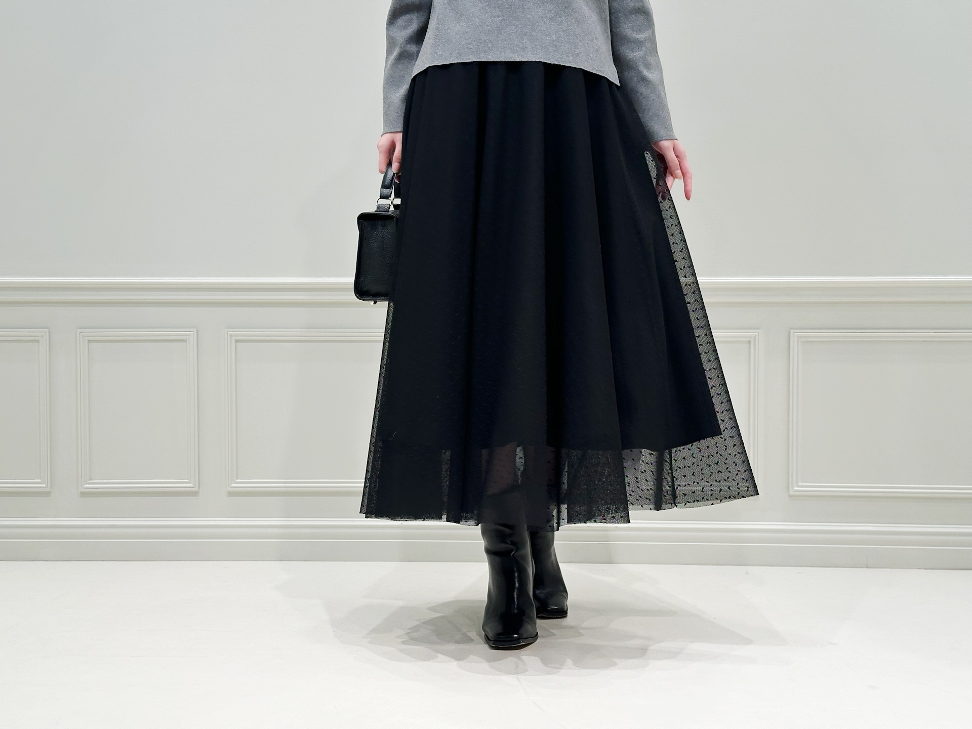 動くたびに揺れる軽やかな素材感が、コーディネートに女性らしい華やぎを添えてくれます。甘くなりがちなチュール素材も、ブラックを選ぶことで大人っぽく、ニットとのコントラストも美しくまとまります。シーズンを問わず着回しやすいのも魅力のひとつです。