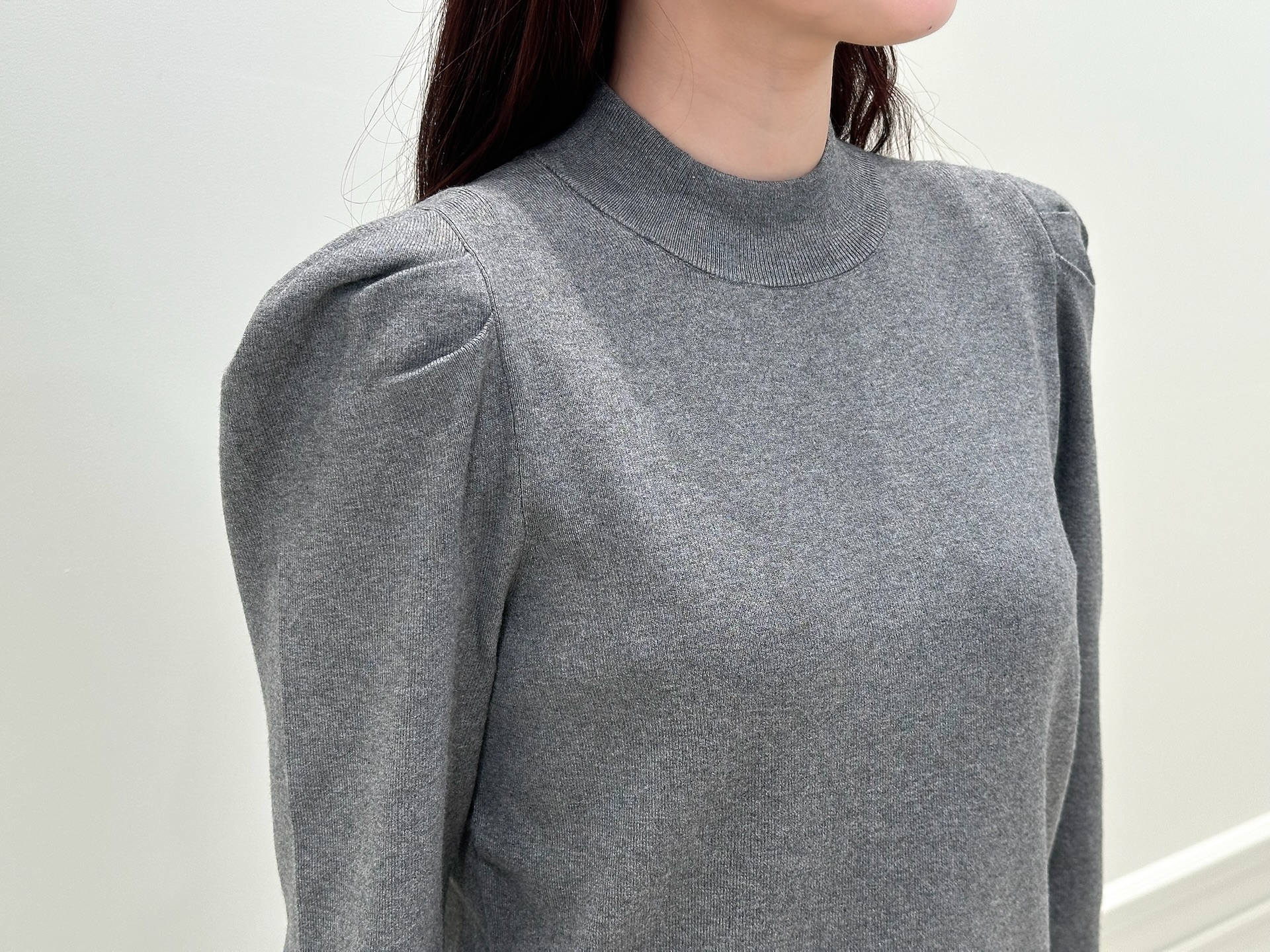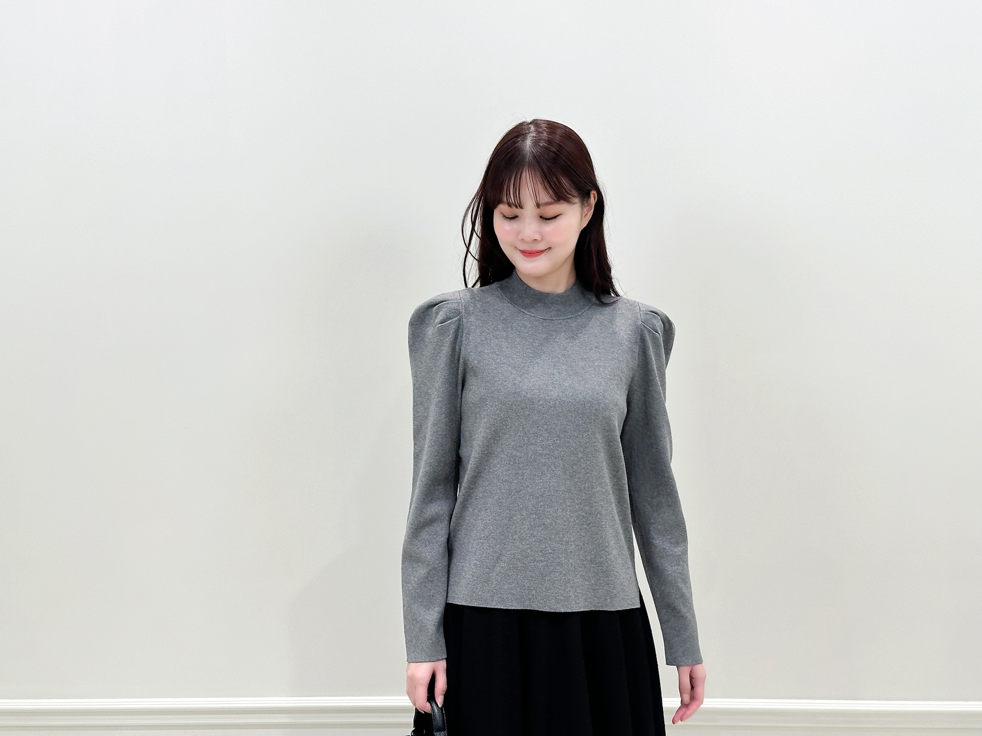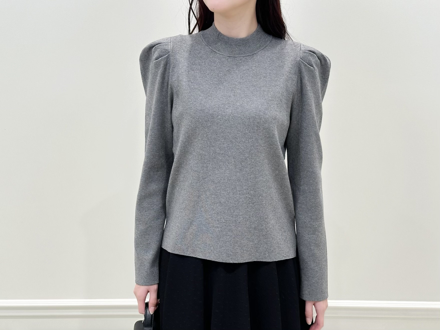 パフスリーブが印象的なハイネックニットをセレクト。程よく立体感のある袖デザインが、シンプルな身頃に表情をプラスしてくれます。総針編みならではのきれいな表面感と、身体のラインを拾いすぎないシルエットで、一枚でも安心感のある着心地。