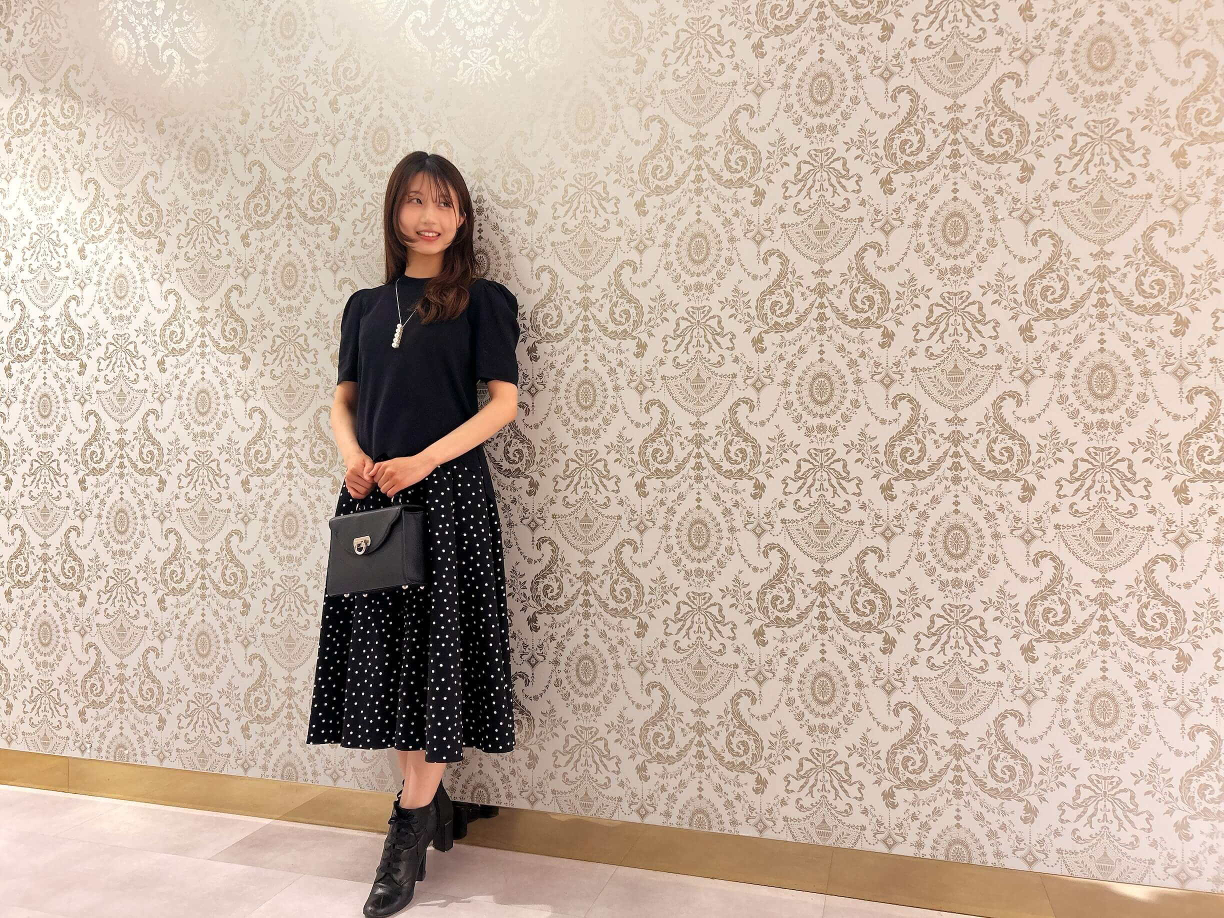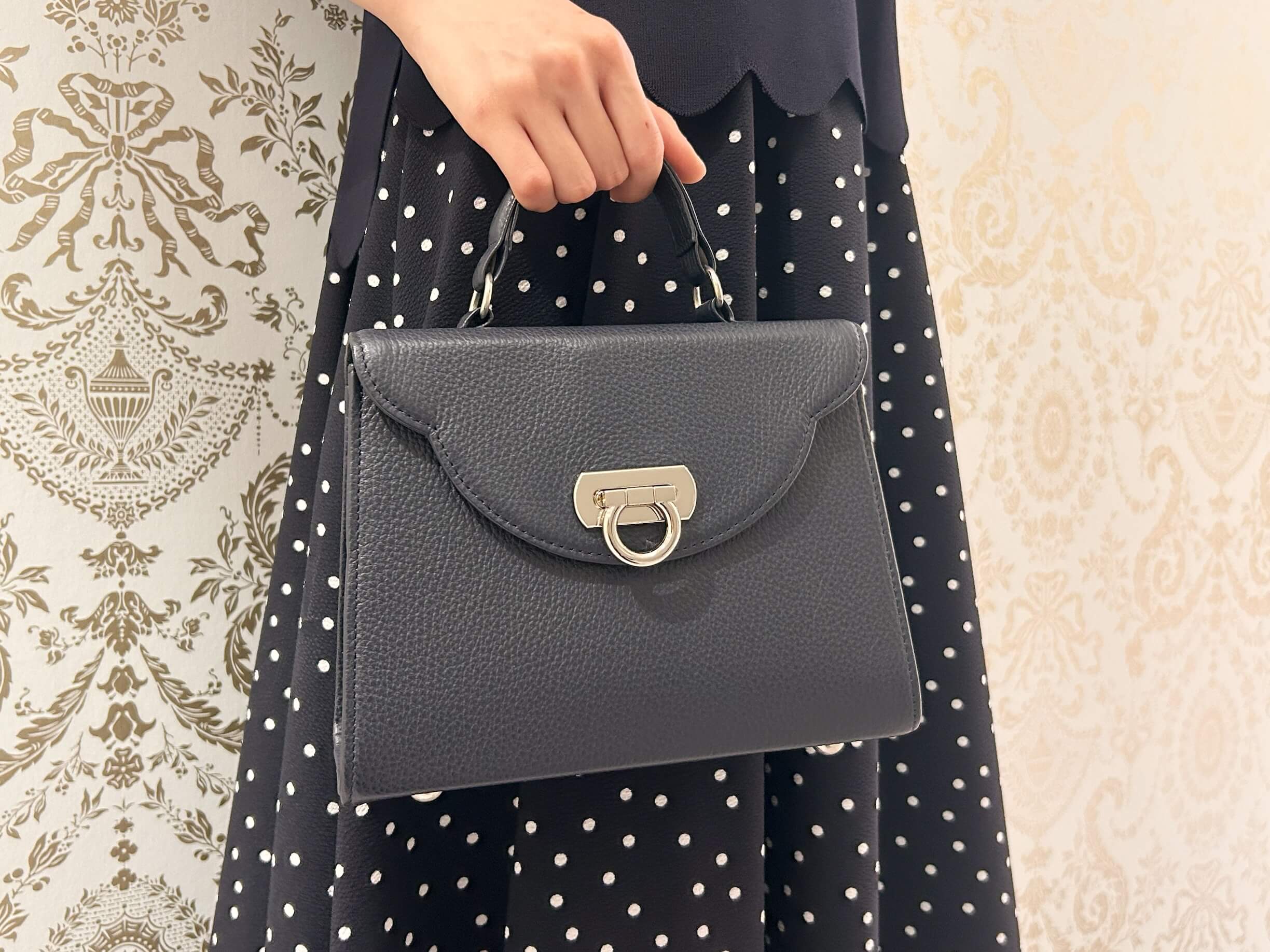 バッグはトップスと同色のネイビーレザーバッグを合わせ、全体を統一感のあるエレガントな初春スタイルに仕上げました。