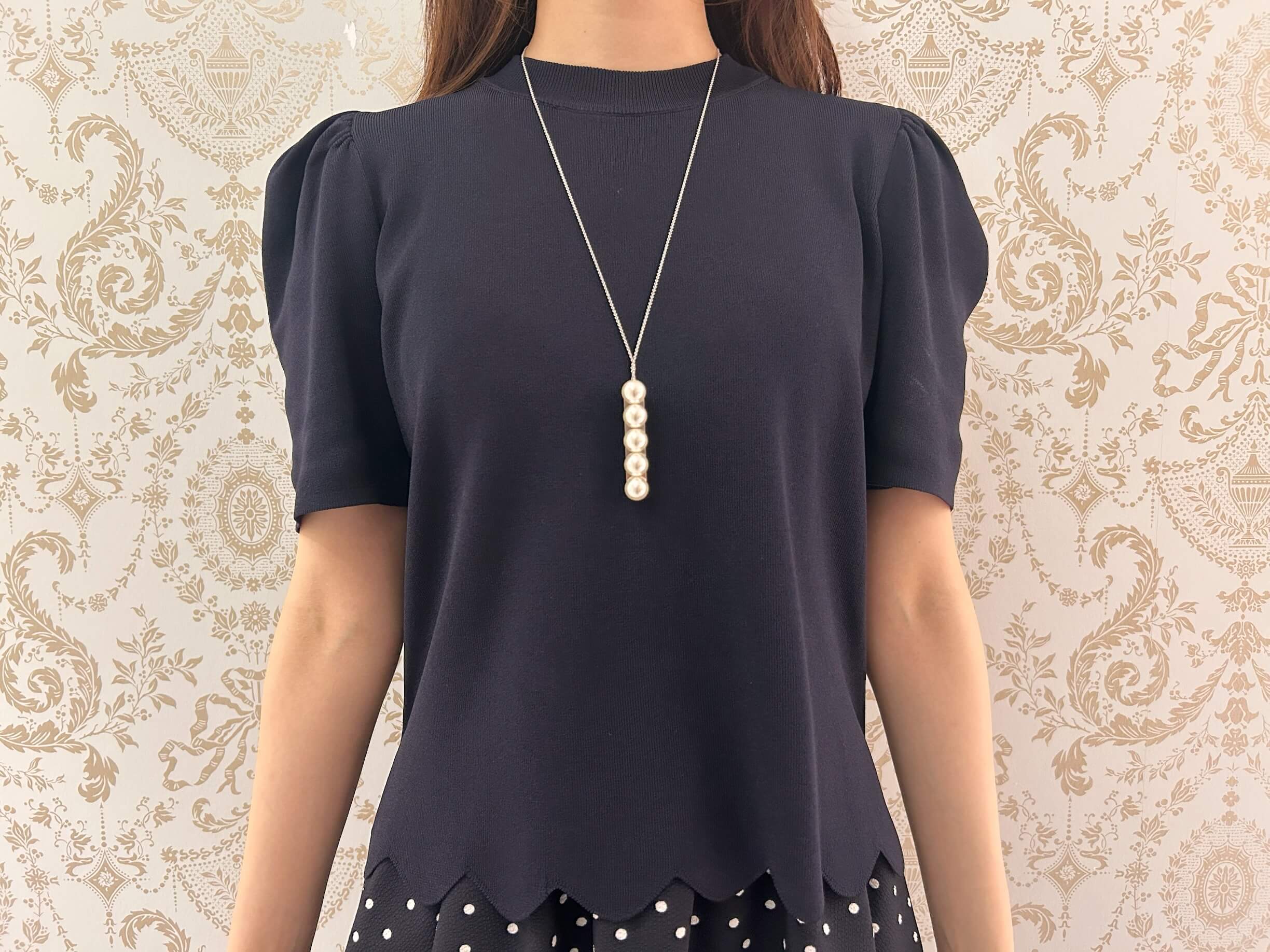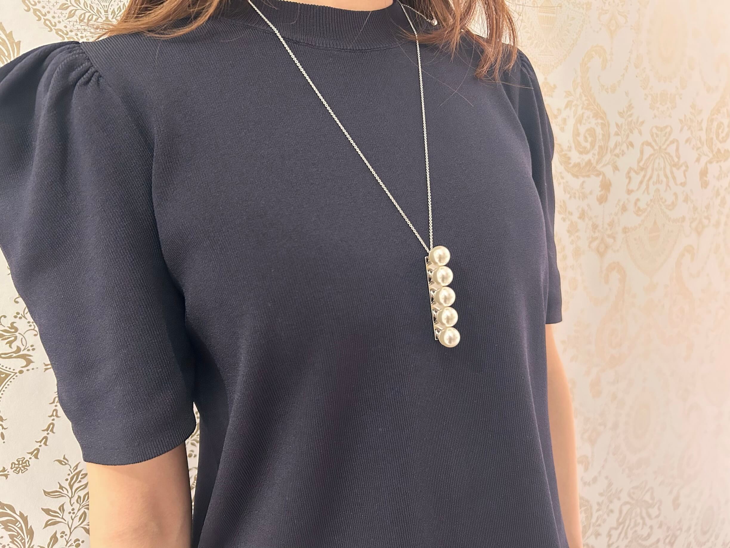 アクセントには、縦のラインを美しく見せる5連パールネックレスをプラス。