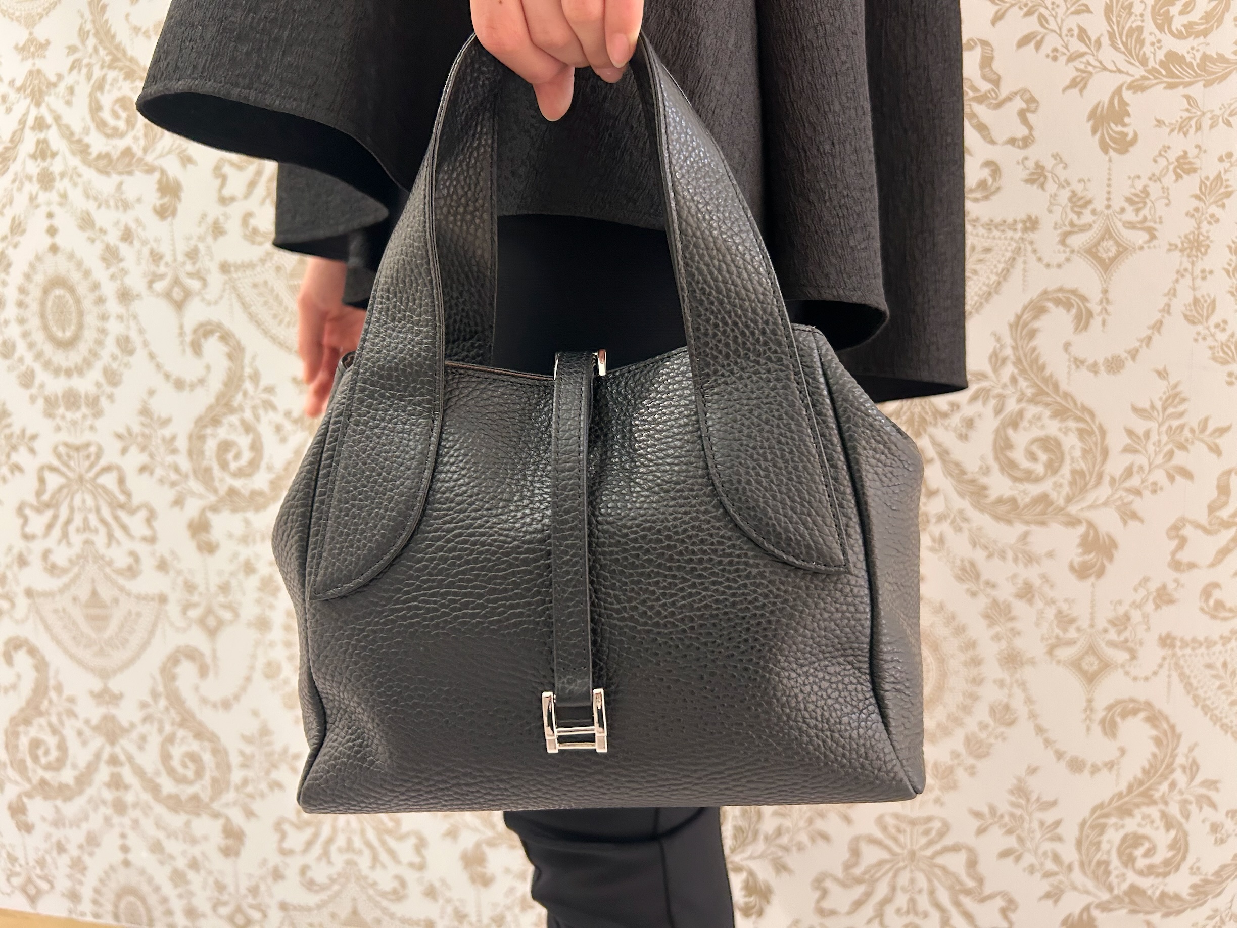 コーディネートの仕上げにはフロントベルト付きレザーバッグをプラス。