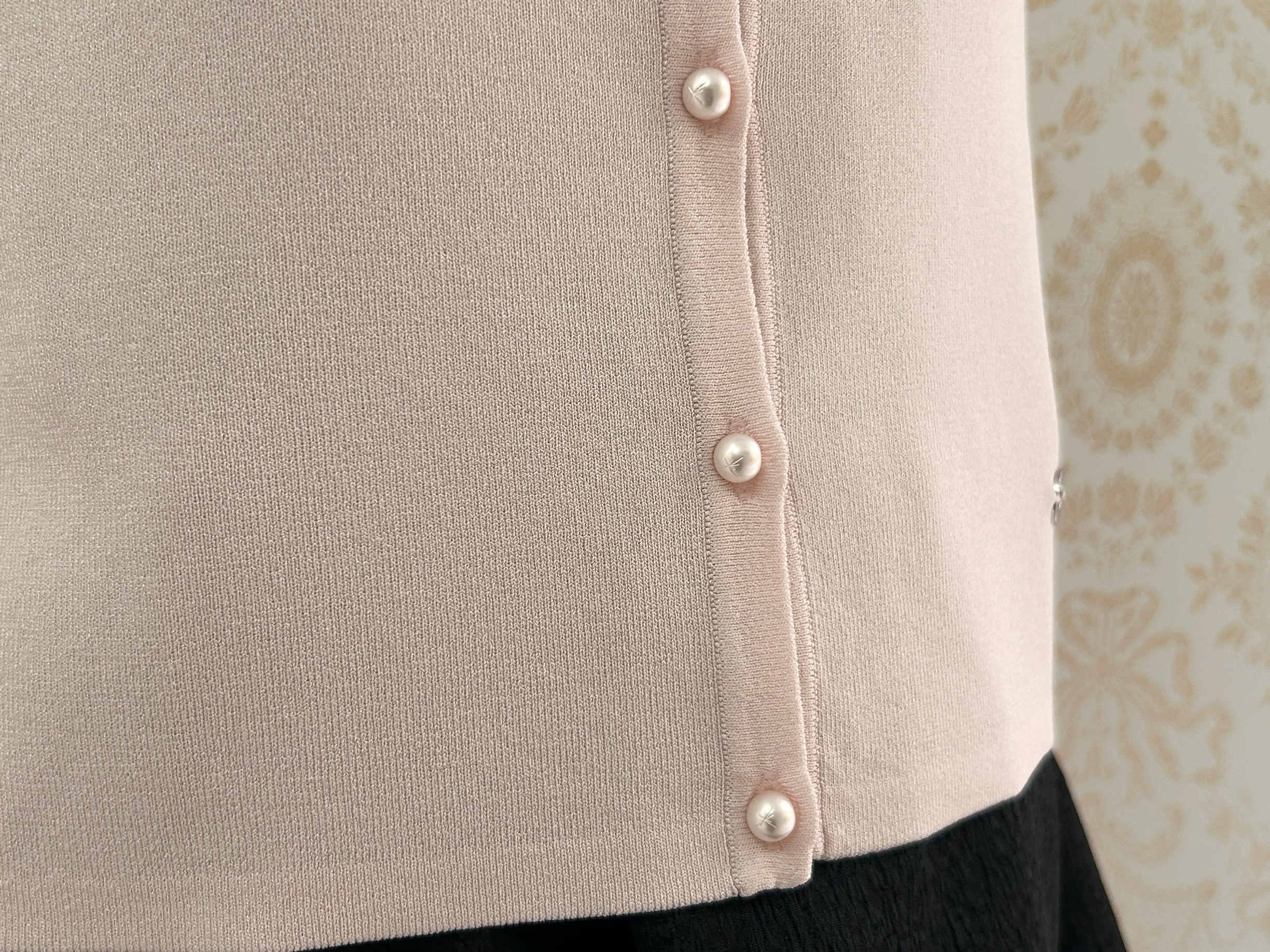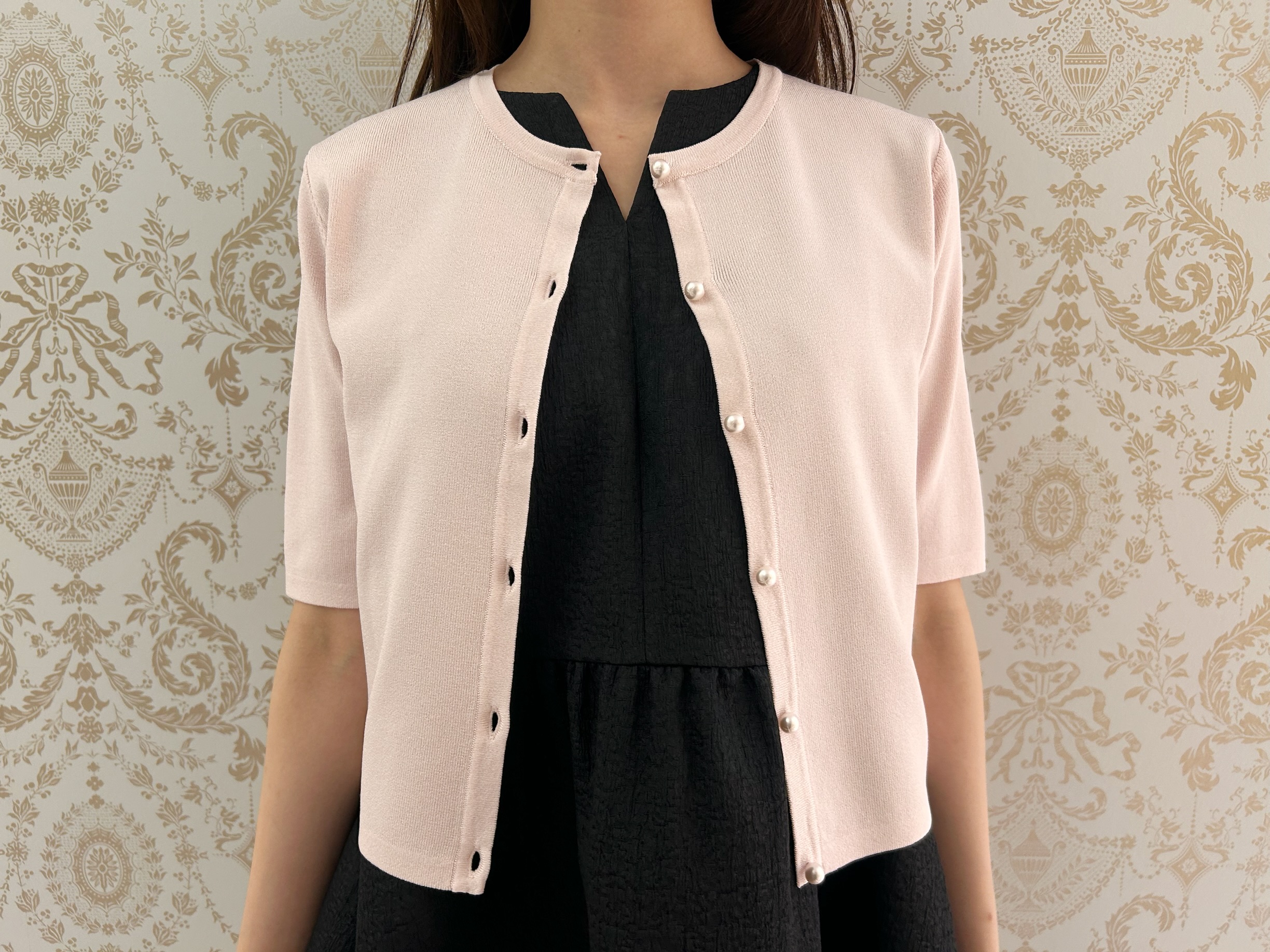 羽織りには、柔らかな春色が目を惹くパールボタン半袖ニットカーディガンを合わせました。
