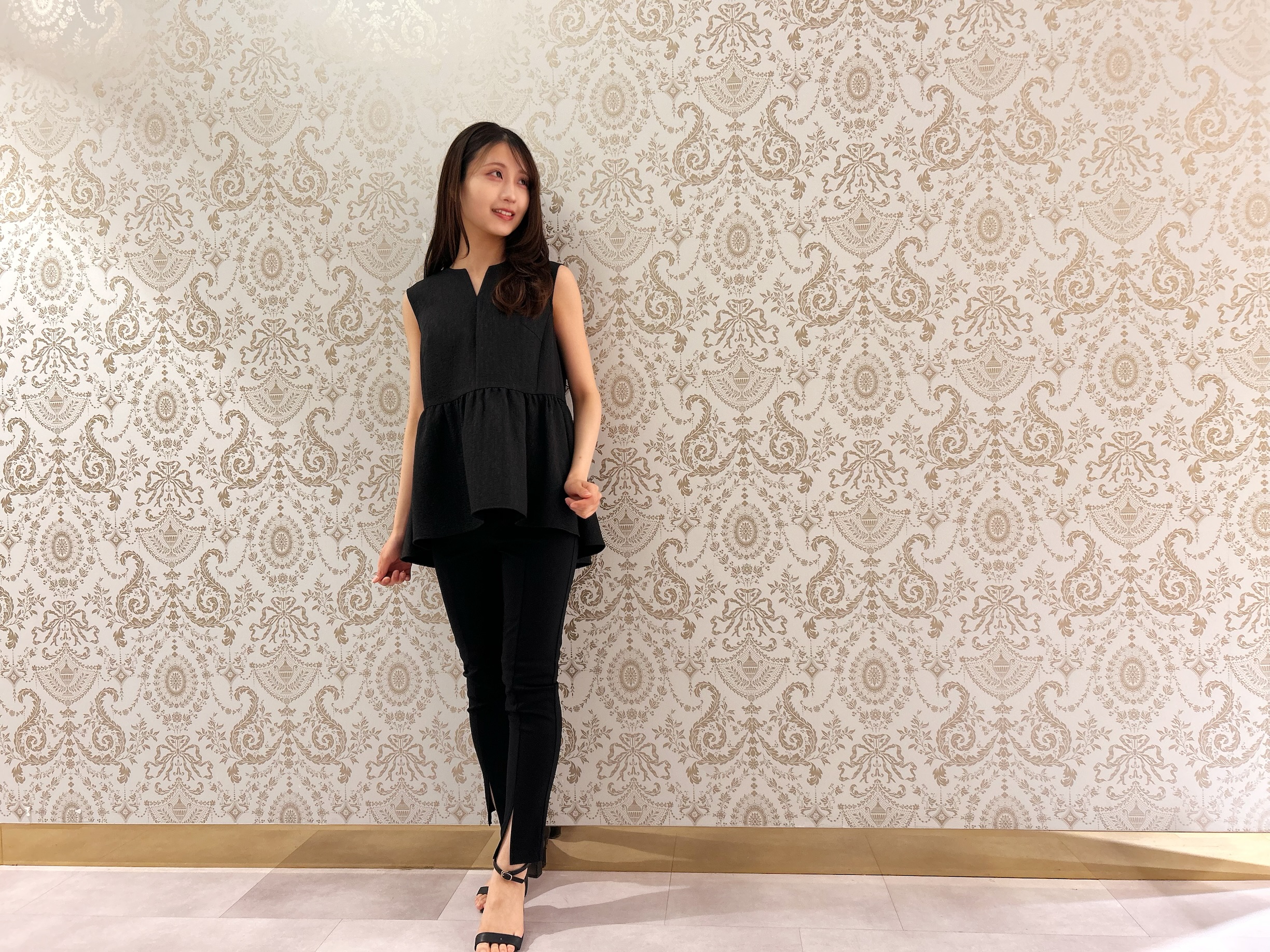 半袖で軽やかなシルエットなので、ペプラムトップスのふんわり感を損なわず、全体のバランスを美しくまとめてくれます。